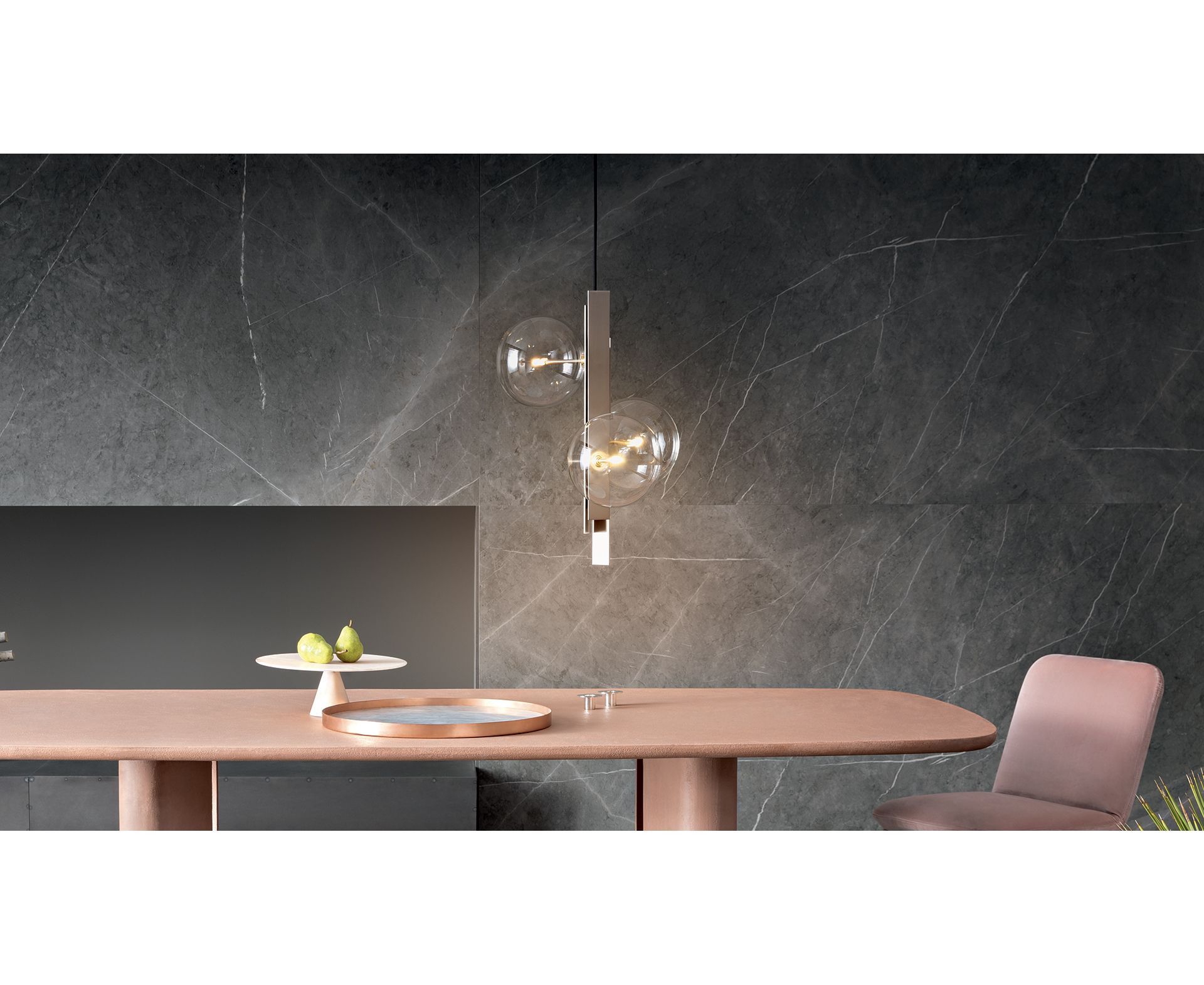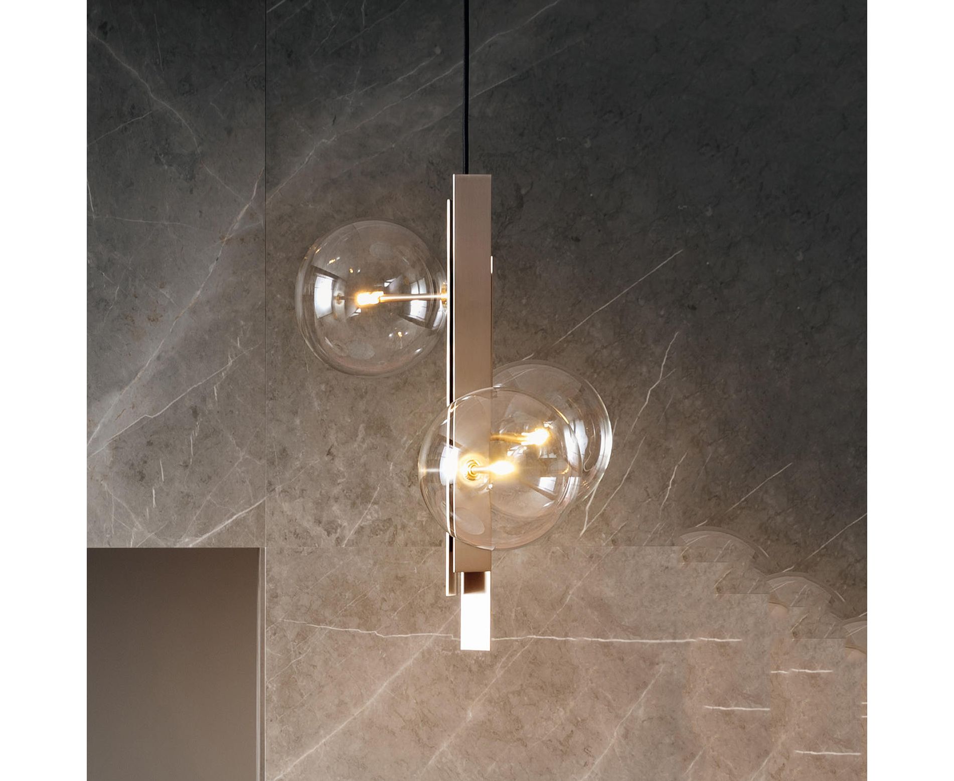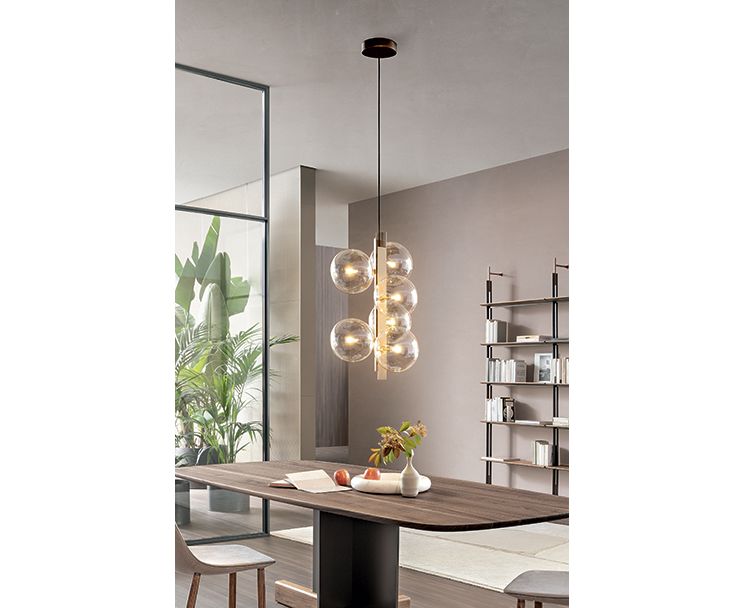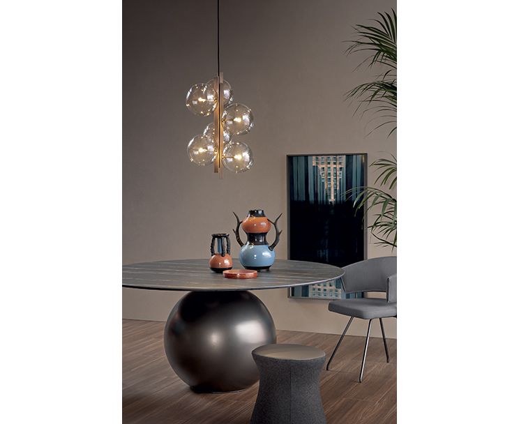 Подвесной светильник Bon Ton, разработанный Studio Team Design, развивается вокруг своей центральной оси, состоящей из трех металлических пластин из полированной стали или с элегантной медно-бронзовой отделкой. Это объект, в котором стеклянные шары, образующие абажуры, доступны из прозрачного, янтарного или дымчатого стекла, расположены в неправильном порядке, подчеркивая их динамичный характер. Bon Ton доступен в версии с одним глобусом или в версиях с тремя или шестью глобусами, которые придают дополнительное движение фигуре лампы.