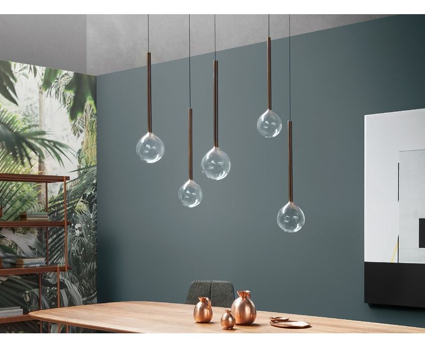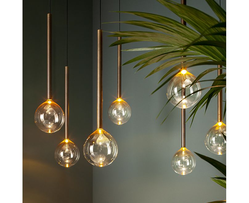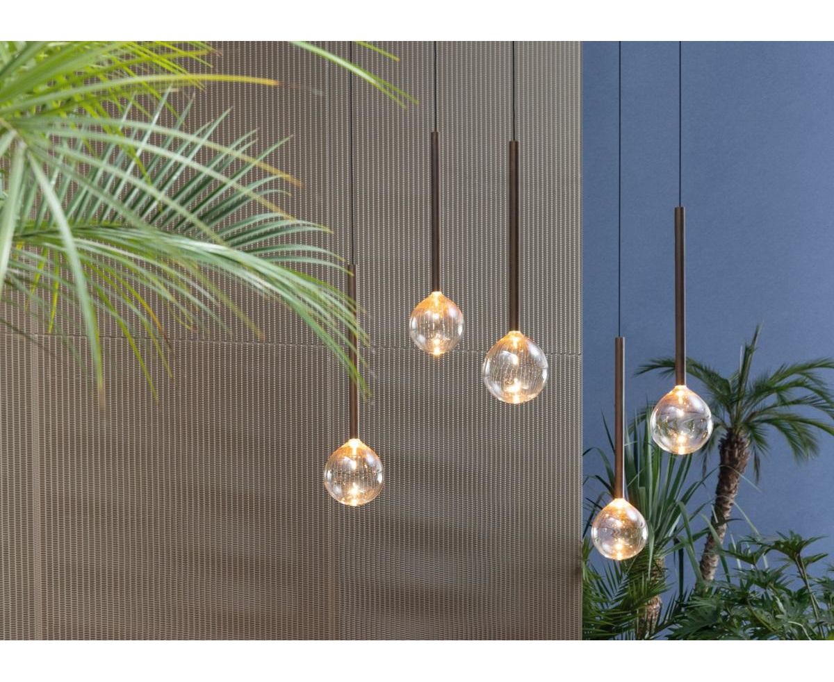 С самого своего названия лампы Sofì отдают дань уважения старинной и высоко ценимой технике ручного выдувания стекла. Основная форма коллекции Sofi, разработанная Studio Team Design, - это шар из боросиликатного стекла с теплой янтарной отделкой, который сочетается с полированным латунным цилиндром, в котором находится источник света, и вызывает в памяти образ мастеров-стеклодувов, которые в своих венецианских мастерских используют свои длинные выдувные трубы для искусного изготовления раскаленного расплавленного стекла. Sofi позволяет создавать согласованные среды благодаря своему выражению во множестве моделей: потолочный светильник с металлической рамкой с 7 или 10 шарами, подвес с 1, 5 или 7 шарами, торшер, две версии настольной лампы (без или со стеклянным колпаком) и настенный светильник, отличающийся двойным направлением светового потока.
