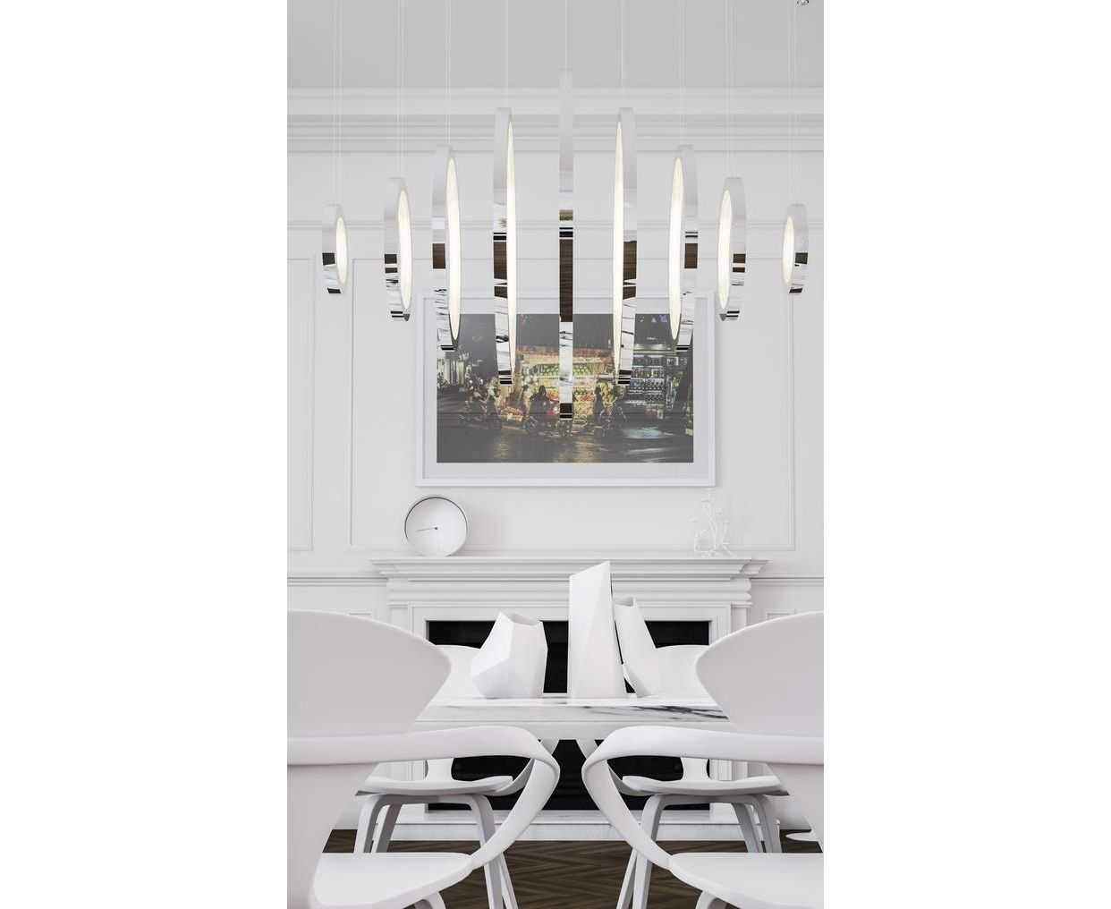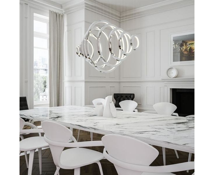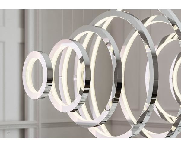 Симметрия и минимализм - основная эстетика подвесного светильника Vaasa. Его равномерно расположенные кольца спускаются с обеих сторон от центра, и свет распространяется через сотни индивидуально вырезанных и уложенных вручную диффузоров из кристаллического профиля.
