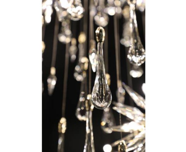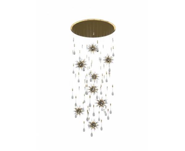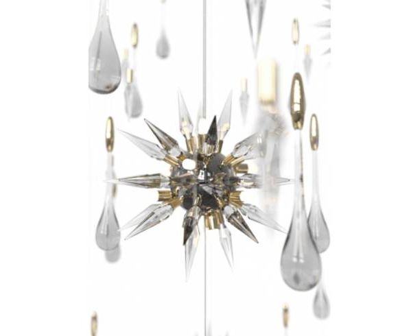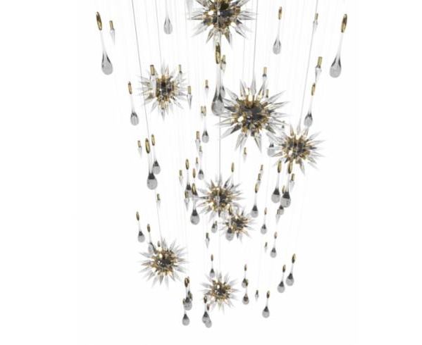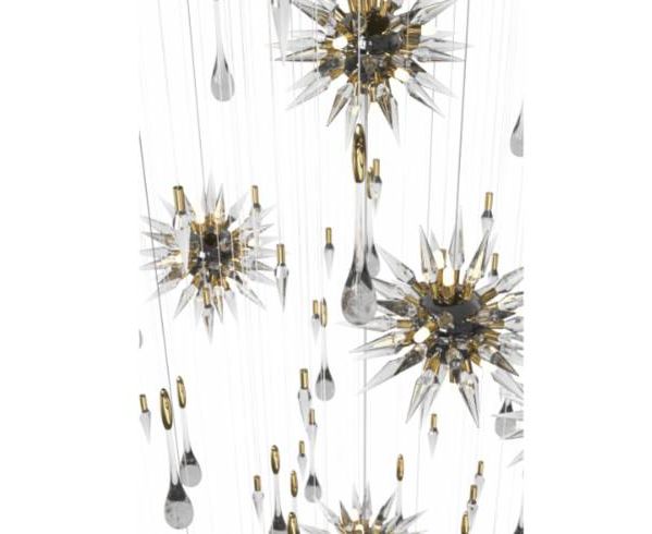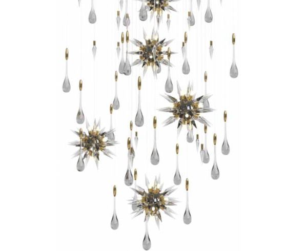 Подвесной светильник Constellation состоит из вращающихся фигурок звезд, украшенных падающими каплями дождя, вращающимися вокруг светового дизайна в центре, которые гармонично переливаются через тонкие кристаллы. В дополнение к великолепным хрустальным каплям, в дизайне есть острые кристаллы, которые контрастируют с каплями дождя и напоминают форму метеорита, а также создают впечатление осколков льда.