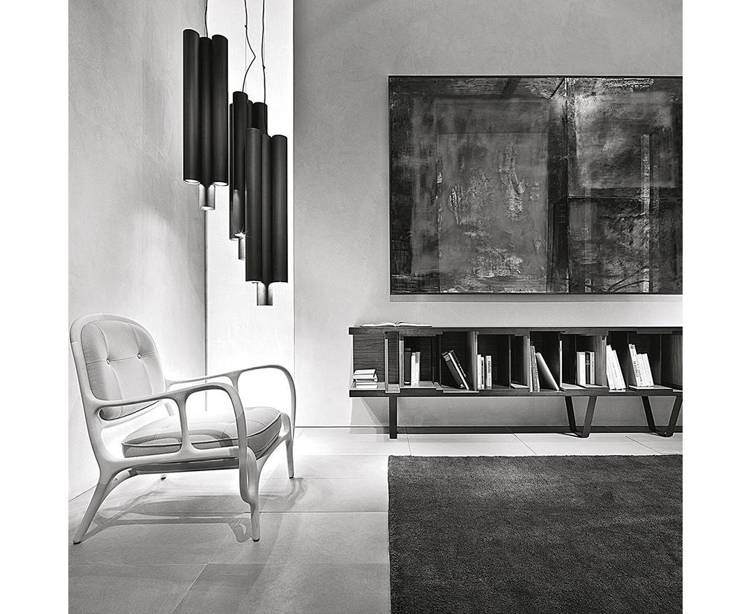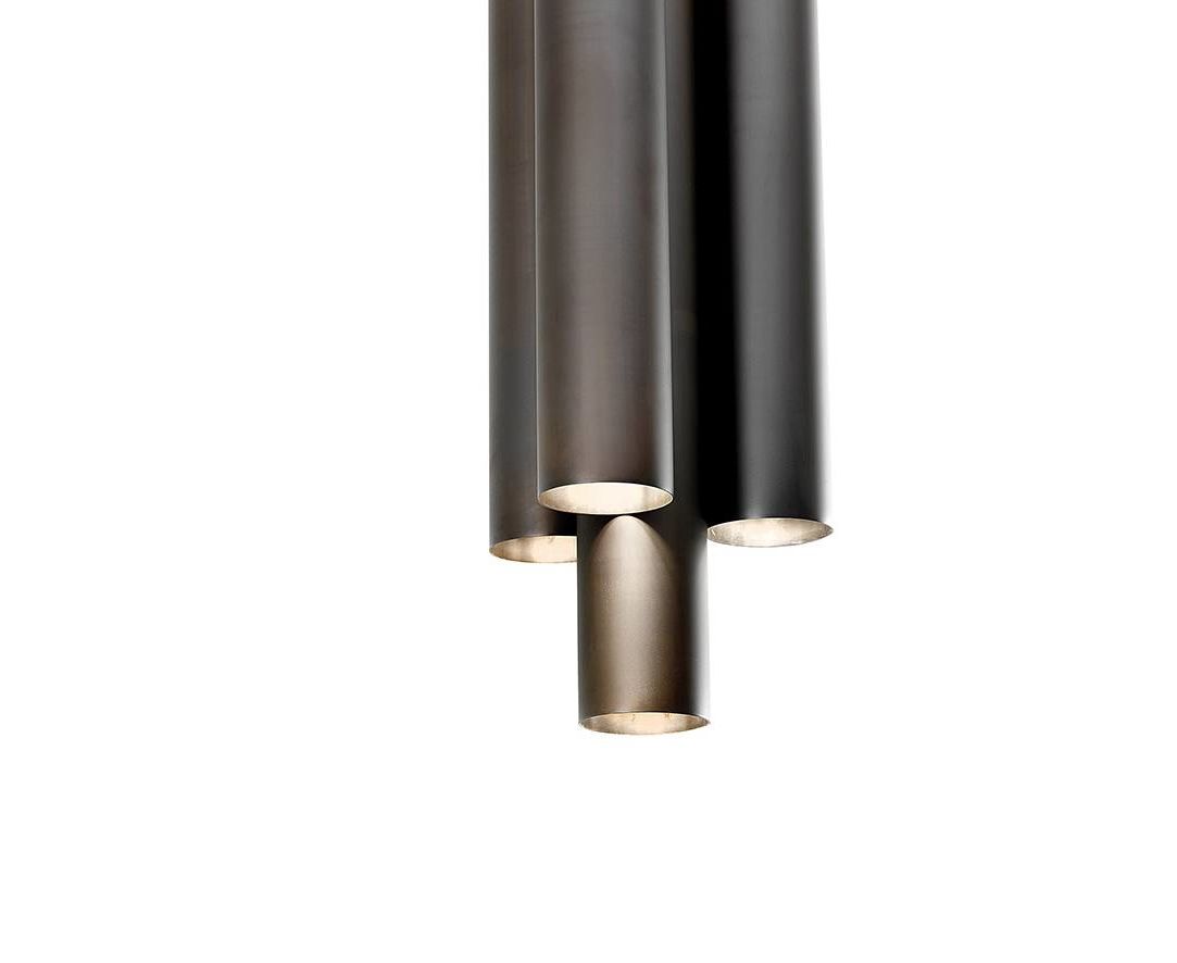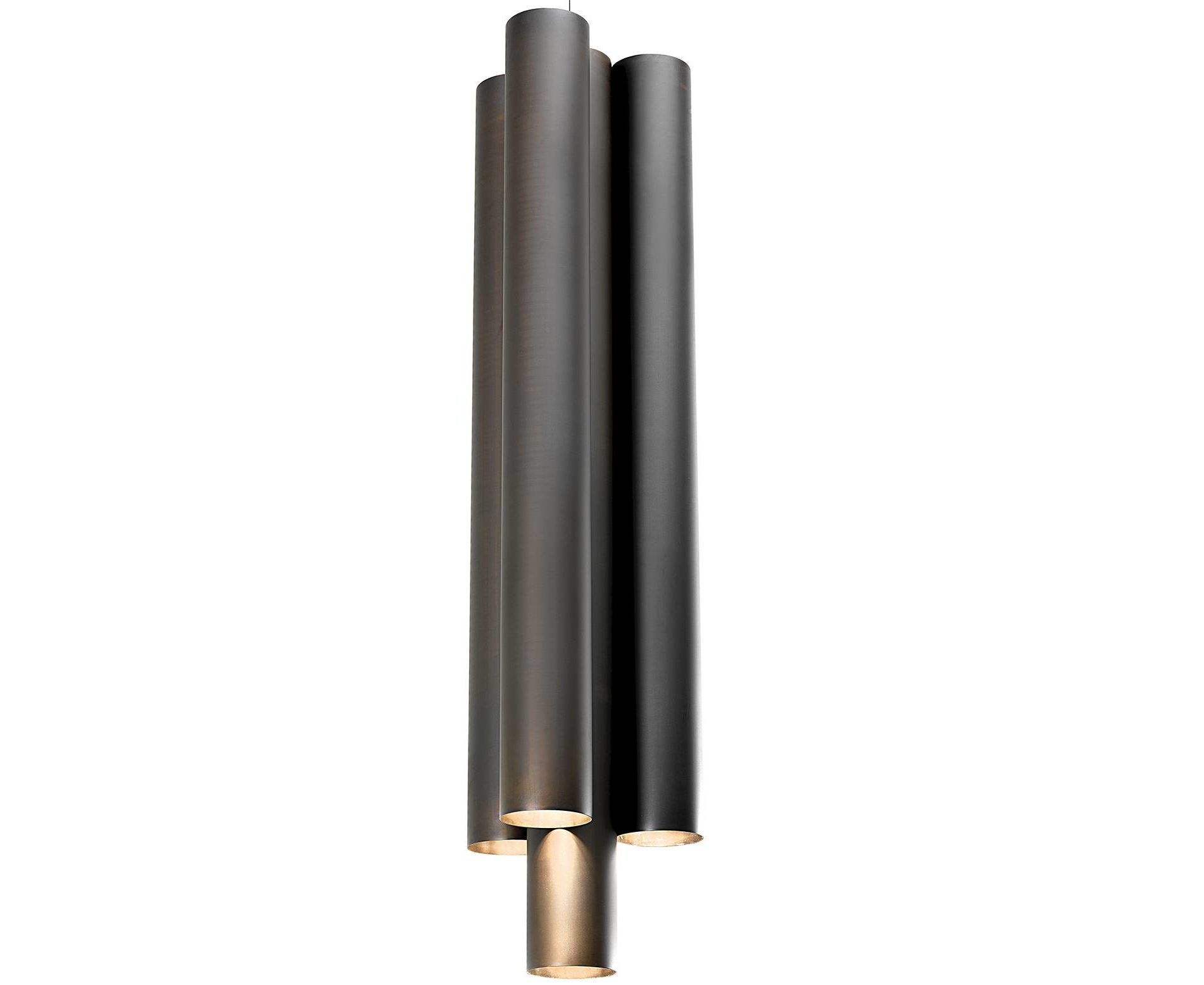 Подвесной светильник, состоящий из 1 или 4 трубок разной длины, полностью выполненных из полированной латуни или алюминия, окрашенного в матовый черный или белый цвет. Возможно светодиодное освещение.