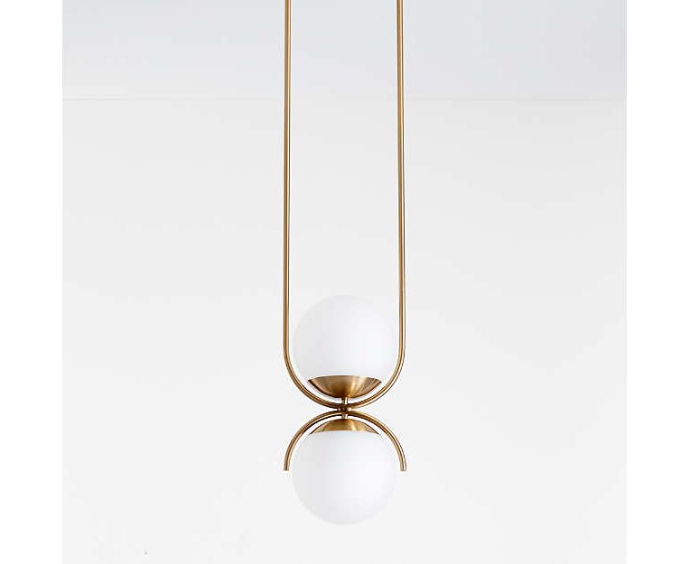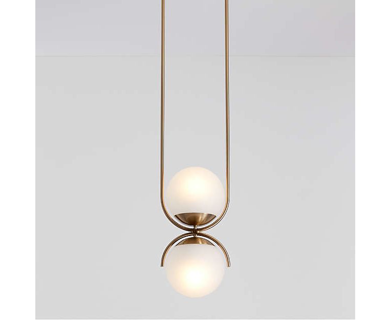 Тонкие стержни, отделанные блестящей латунью, образуют изящную рамку для двух белых стеклянных шаров с латунными крышками, размещенных встык, словно пара драгоценного жемчуга, в потрясающей оправе. Подвеска из двойного матового стекла создает обильный мягко рассеянный свет, что делает его идеальным вариантом для освещения лестничного пролета, кухонного острова или уголка для чтения. Совместите с подходящими торшерами и настольными лампами, чтобы завершить образ. Подвесной светильник в виде глобуса Rondure является эксклюзивным продуктом Crate and Barrel.