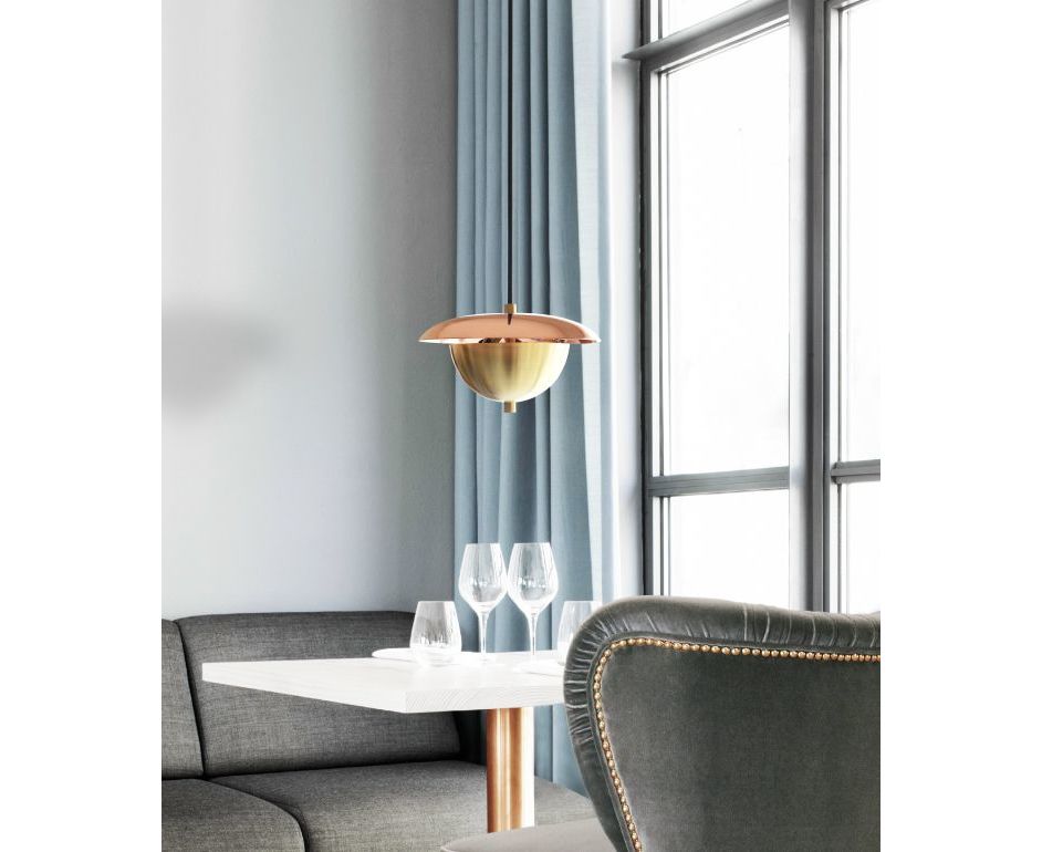 Вдохновленный зданием овальной формы, Creativemary спроектировала подвесной светильник Evoluon, который сопровождается верхней пластиной из меди и сферическим полусфером из матового никеля, расположенным прямо под ним. Этот современный подвесной светильник - часть коллекции Cosmo.