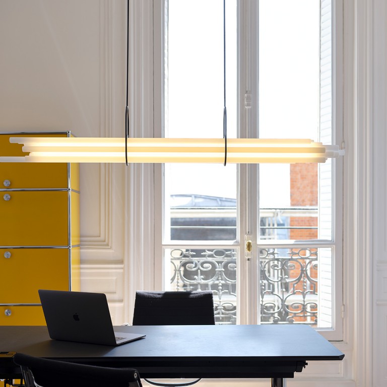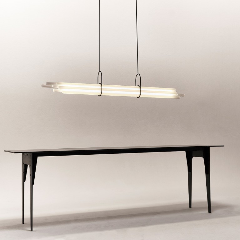 Предназначенный для освещения большого обеденного стола, этот свет, искусно оснащенный устройством, обманывающим глаз, состоит из двенадцати боросиликатных стеклянных трубок. Только одна из этих трубок функционирует как центральный блок и является источником света, другие трубки передают его диффузию путем преломления и призмы.