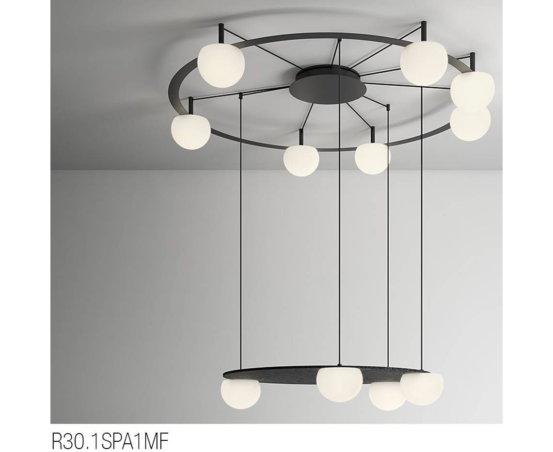 Создавая впечатляющий эффект с помощью двух колец света, эта современная люстра для больших помещений и высоких потолков может быть подвешена или установлена заподлицо с использованием потолочных светильников t-3810AS / t-3811AS.
