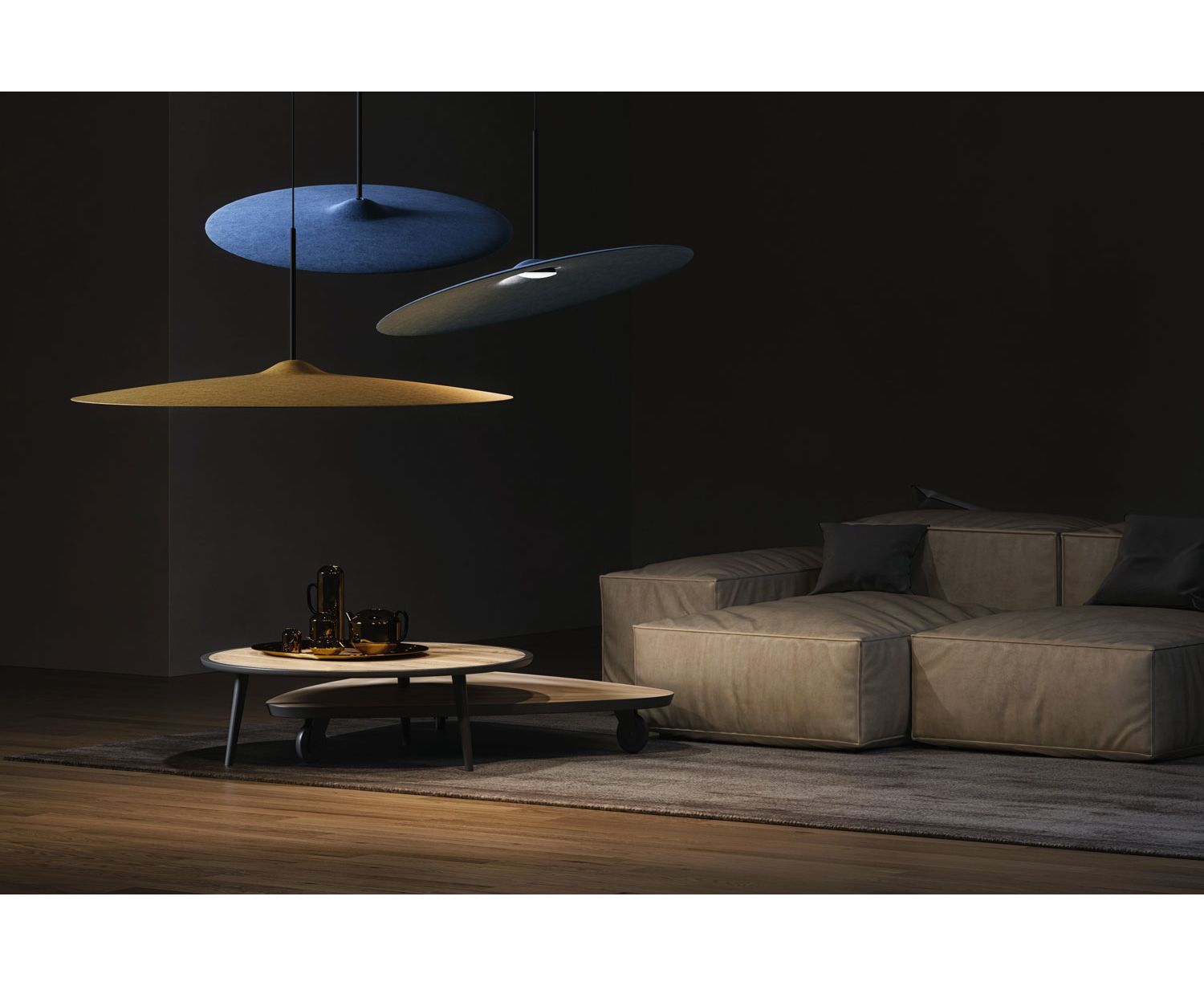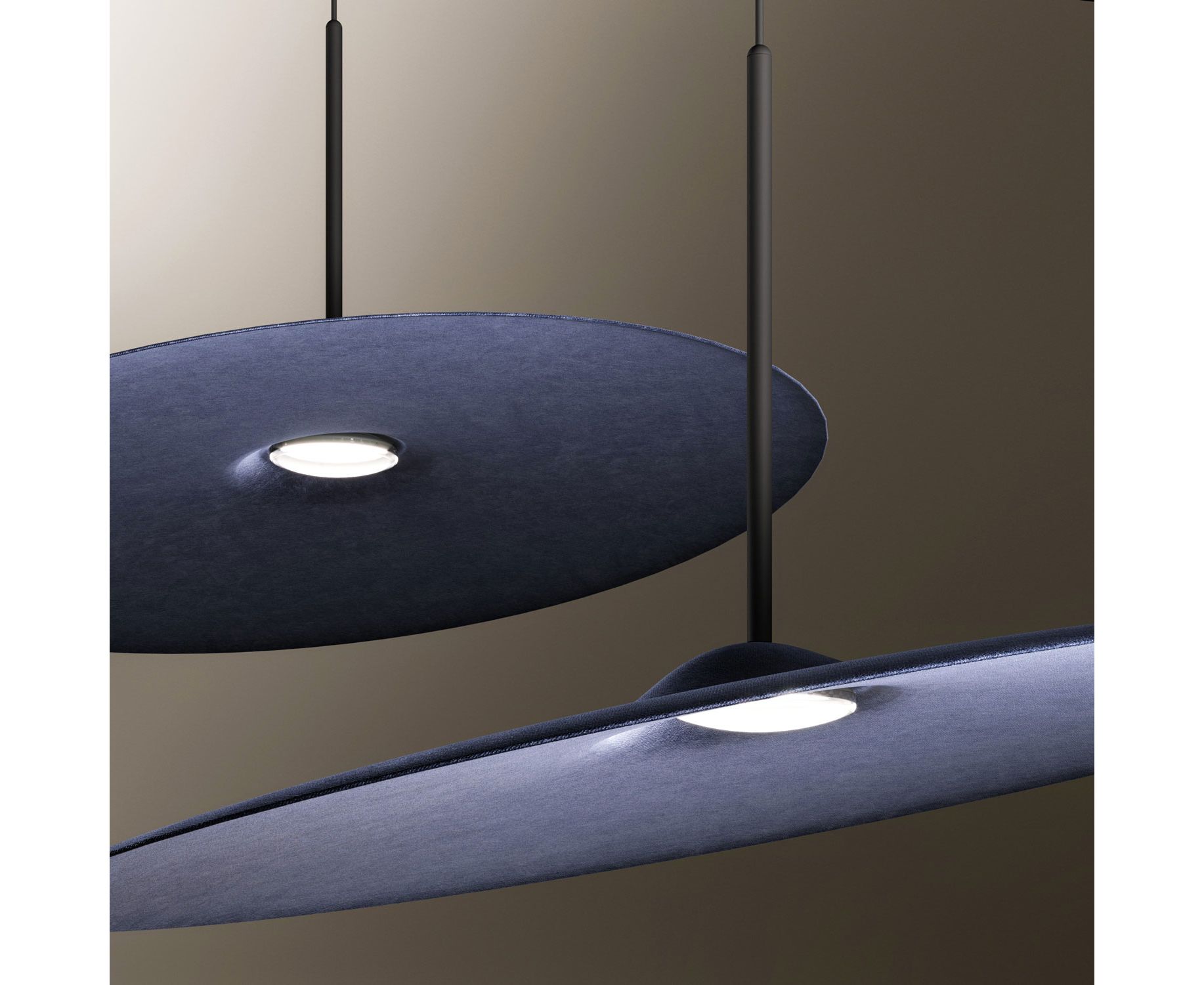 Свойства подвесного светильника Fabbian Acustica, вдохновленного тарелкой, меняют концепцию с плафоном и двумя внутренними звукопоглощающими пружинами, поглощающими окружающий звук и создающими высокий уровень акустического комфорта. Естественно наклонное положение и легкость позволяют создавать динамичные и креативные схемы освещения.