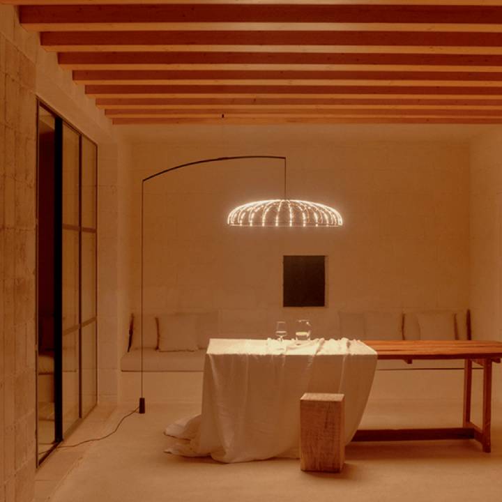 Подвесной светильник Skynest для рассеянного освещения. Лампа представляет собой комбинацию светящихся и темных элементов, расположенных в виде сетки и сформированных из стержневых структур, покрытых тонкой переплетенной цветной трубчатой сеткой, изготовленной из переработанной ткани, изготовленной из полиэстера. Каждый отдельный световой элемент питается от специальных микроразъемов, расположенных в верхней части купола, и покрыт двухцветной сеткой, в то время как сторона, обращенная внутрь купола, всегда белая, чтобы обеспечить оптимальное излучение света светодиодным модулем. Прибор оснащен встроенной системой балансировки в верхней части купола, которая помогает регулировать его баланс, делая его идеально устойчивым. Нижняя часть купола дополнена алюминиевым кольцом, которое удерживает всю сетевую структуру купола на месте с помощью простой системы защелкивания. Изделие собирается абсолютно без использования клея, поэтому его можно полностью отделить для вторичной переработки в будущем и в случае какого-либо ремонта или замены. Доступные варианты отделки светильников: синий турмалин, миндаль, антрацит или кирпично-красный. Пластиковая конструкция, окрашенная в тот же цвет, что и лампа, оснащена встроенной электроникой, позволяющей использовать различные системы регулировки яркости.