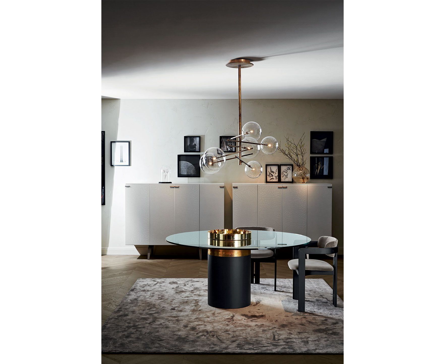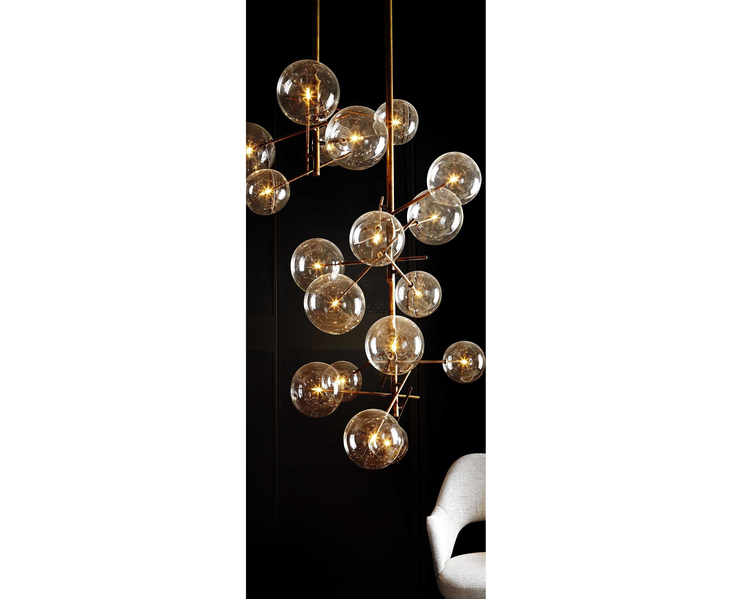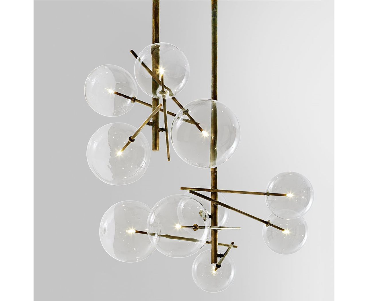 Подвесной светильник со светодиодной подсветкой. 6 прозрачных шариков из выдувного стекла. Доступна также версия с 4 сферами. Металлические детали из полированной латуни. Ручная отделка из латуни выглядит естественно пятнистой и неровной. Благодаря этой ремесленной обработке каждый продукт уникален и эксклюзивен. Высота может быть изменена от 85 см (Болл 6) и 73 см (Болл 4) до 600 см (включая освещение).