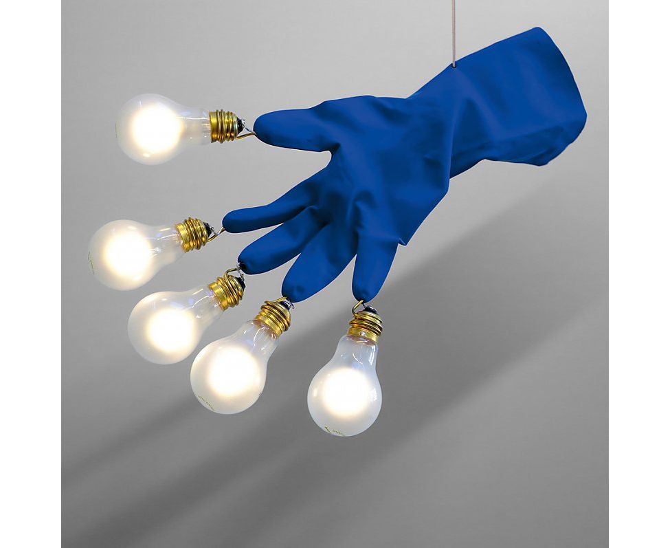Синие перчатки с матовыми лампочками на кончиках пальцев. Удивительно и нетрадиционно. Спорная, свободная от сдержанного мышления и скуки вездесущих повторяющихся замыслов. Материал: пластик, металл, низковольтные лампы