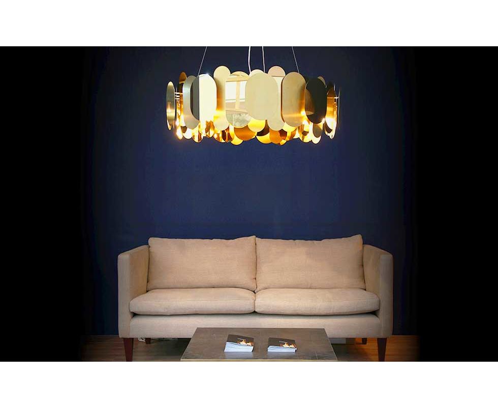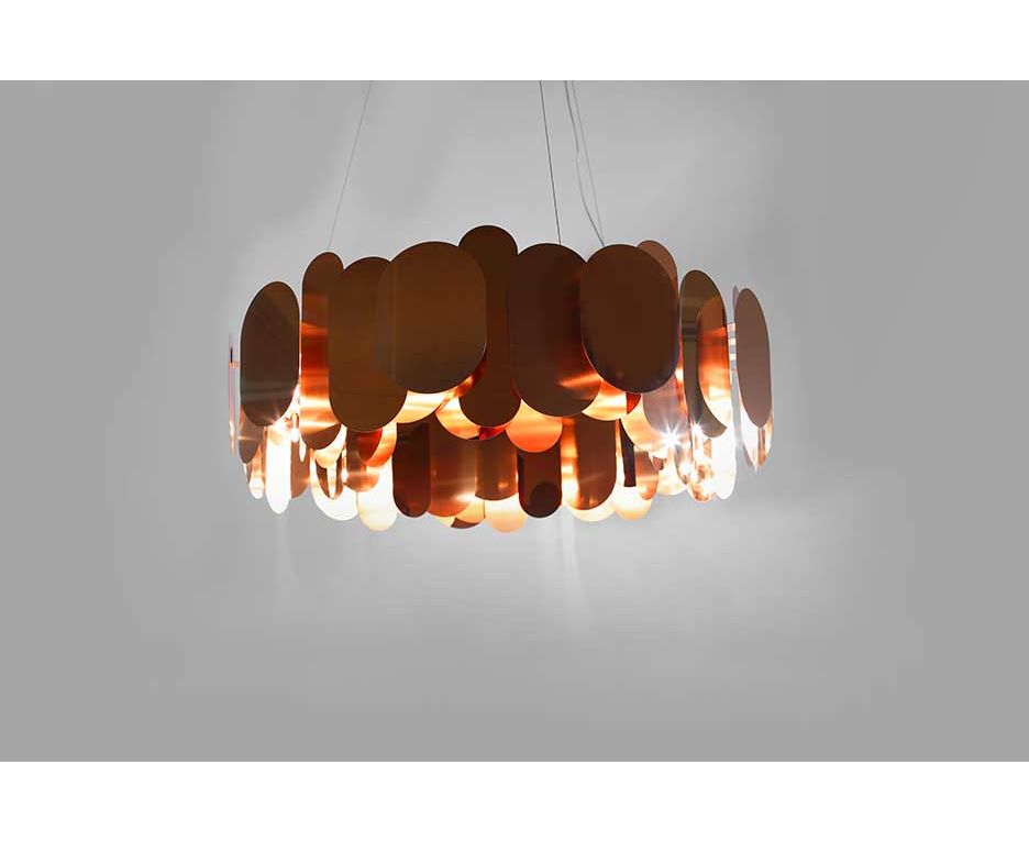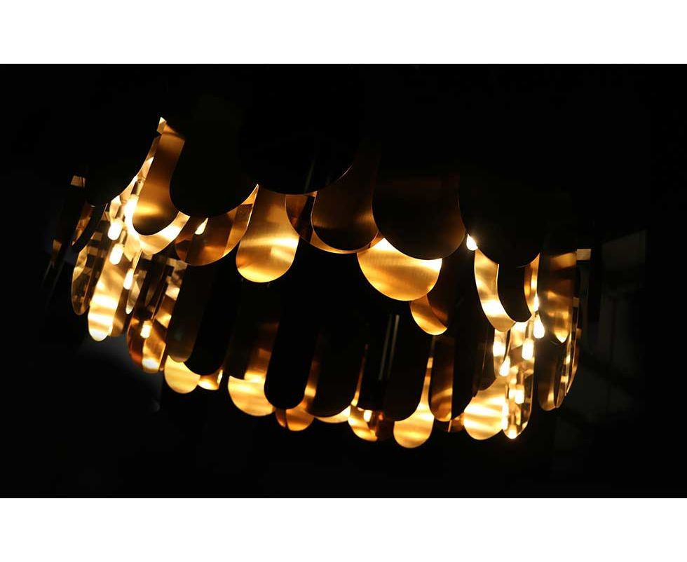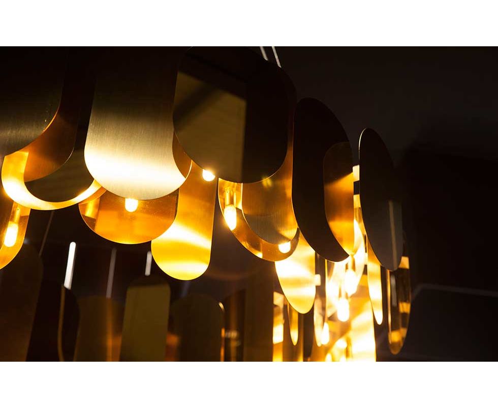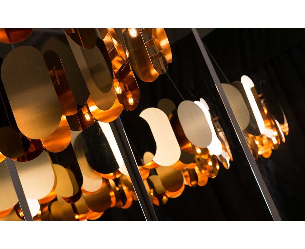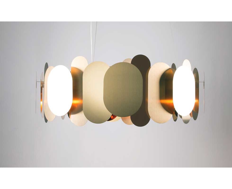 Panel пришла из экспериментов с материалами и формами, которые позволили смешать отделки. Использование как полированных, так и матовых поверхностей было вдохновлено современными ювелирными изделиями, а также архитектурной металлической облицовкой. Стив Джонс накладывает смесь отделок и форм, чтобы создать эту восхитительную люстру в современном стиле.