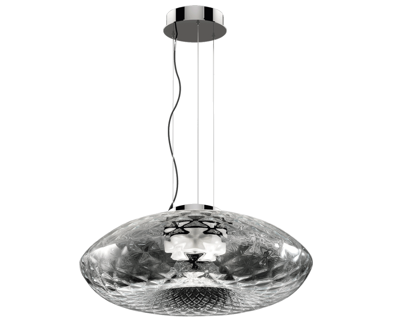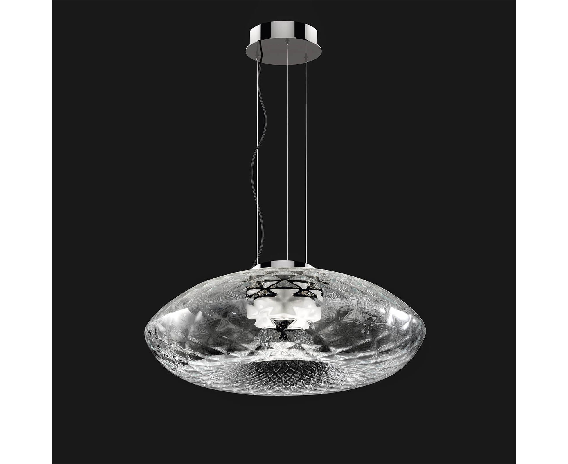 Подвесной светильник из прозрачного стекла с хромированными металлическими деталями. Доступны в разных размерах и цветах.
