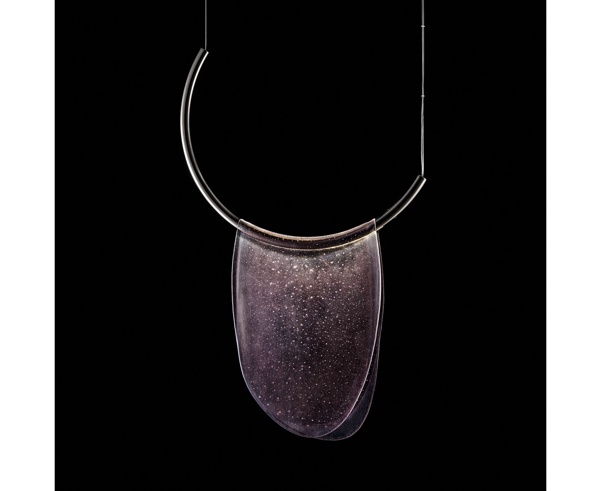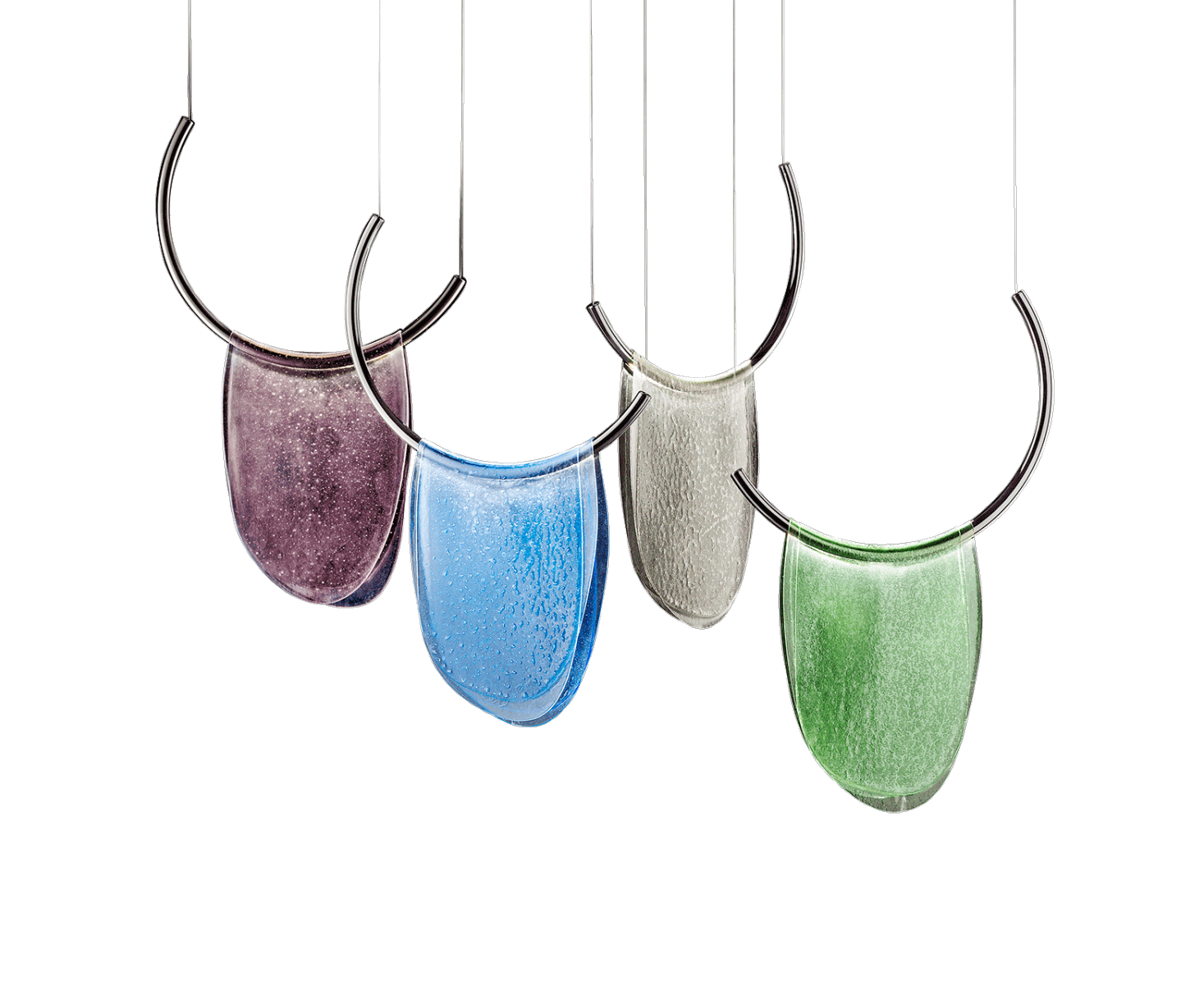 Подвеска из термоформованного стекла и металлической структуры с серо-железной отделкой. Доступны разные цвета: аметист, синий, серый и зеленый. Современный каталог Incanto.