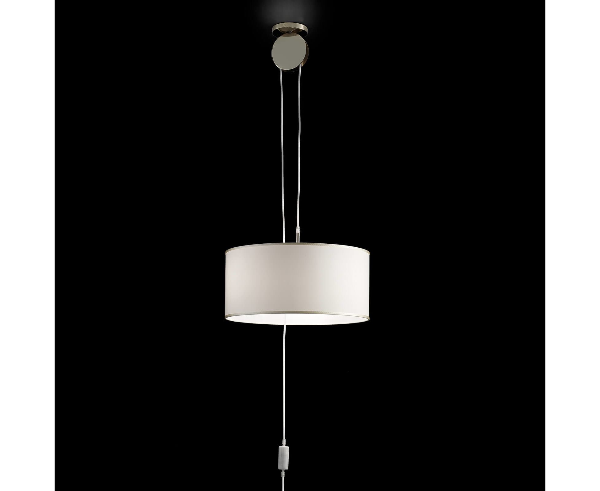 Подвесной светильник из металла с отделкой из светлого золота и диффузором из черной или светлой ткани.