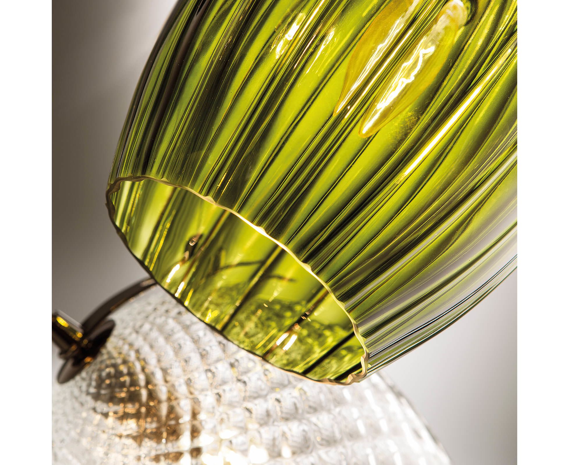 Подвеска с диффузорами из выдувного стекла доступен в четырех цветах: прозрачный, дымчатый, серо-голубой и оливково-зеленый, металлический с хромированной отделкой.