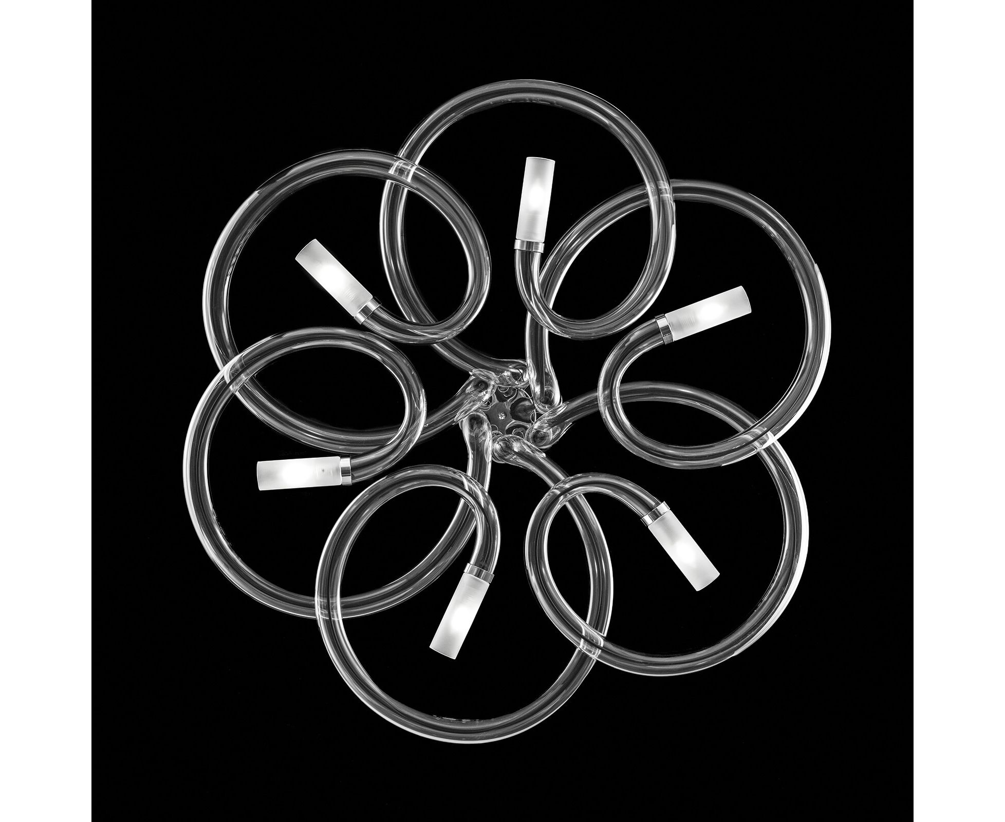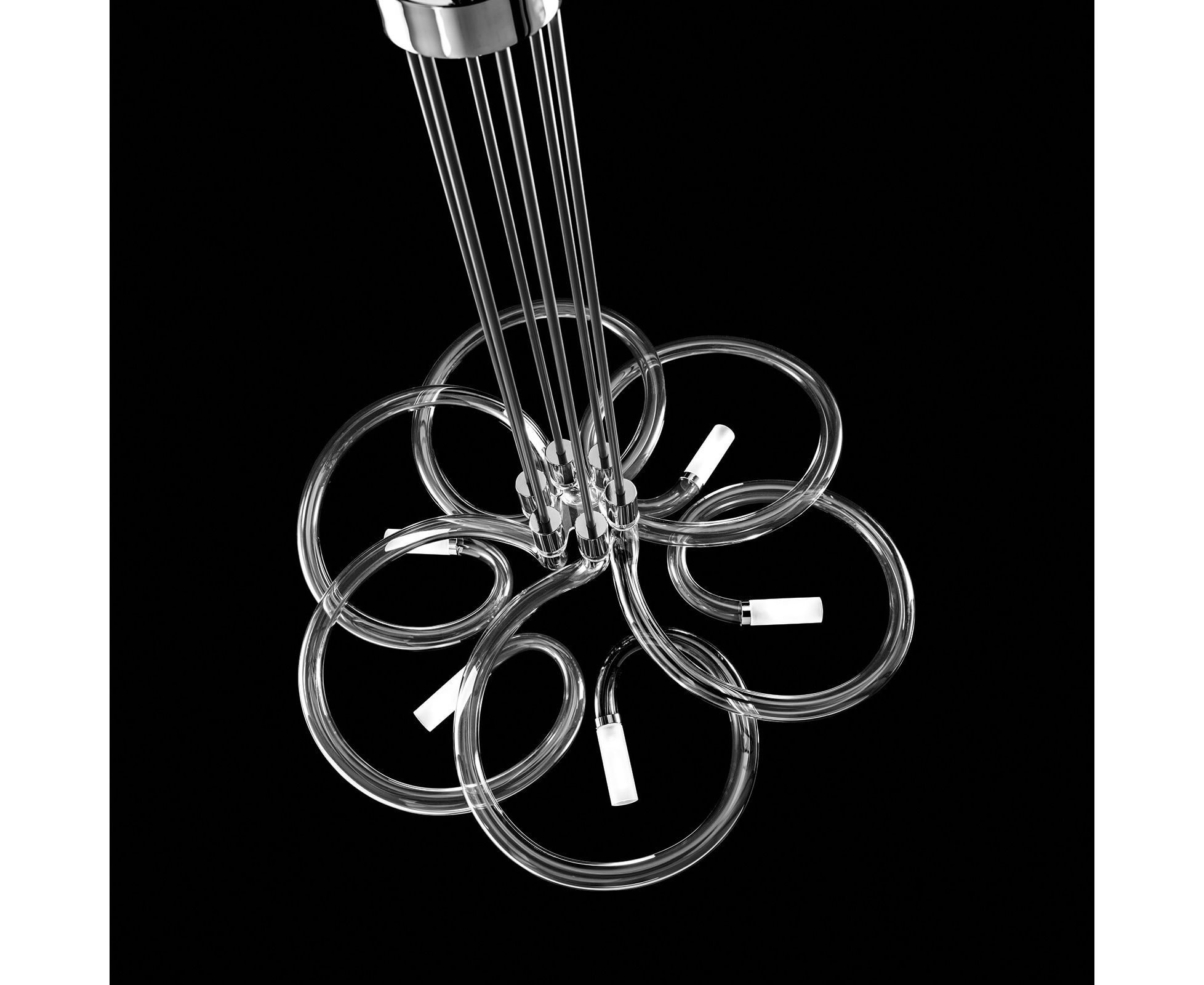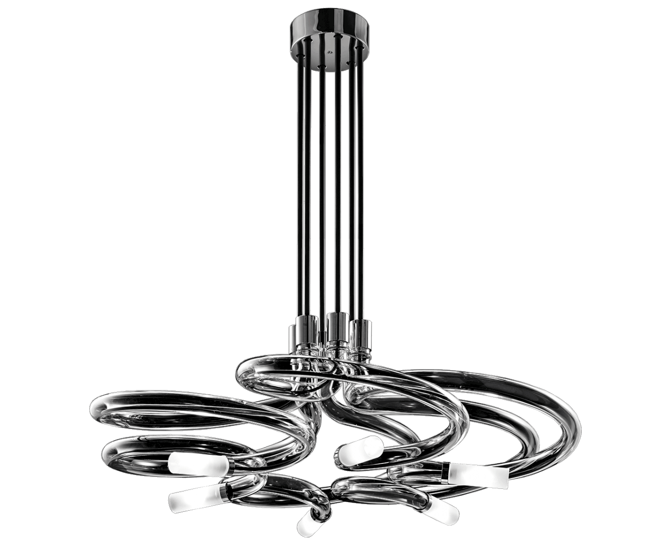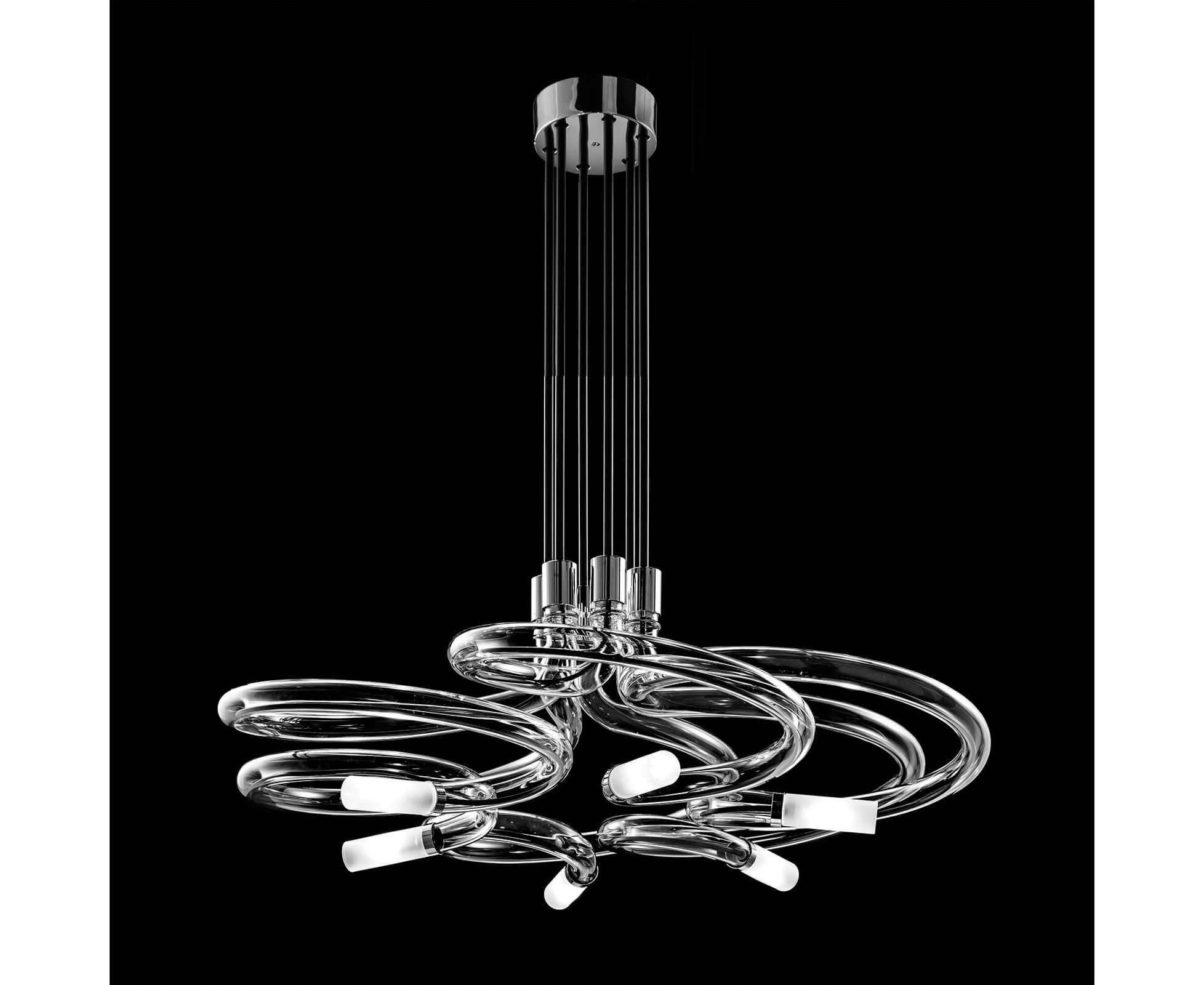 Подвесной светильник с изогнутым трубчатым стеклом и рассеивателями из белого цвета. Доступен в разных цветах. Металлическая конструкция с хромированными и матовыми черными деталями. Современный каталог Incanto.
