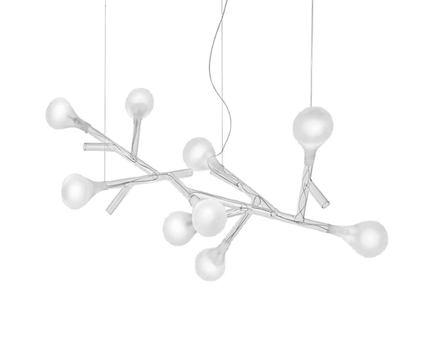 Подвеска с разветвленной структурой, прозрачные стеклянные трубки и диффузоры белого цвета. Три точки крепления позволяют вращать приспособление для создания разных размеров и объемов. Конструктивные детали в хромированной металлической отделке. Современный каталог Incanto.