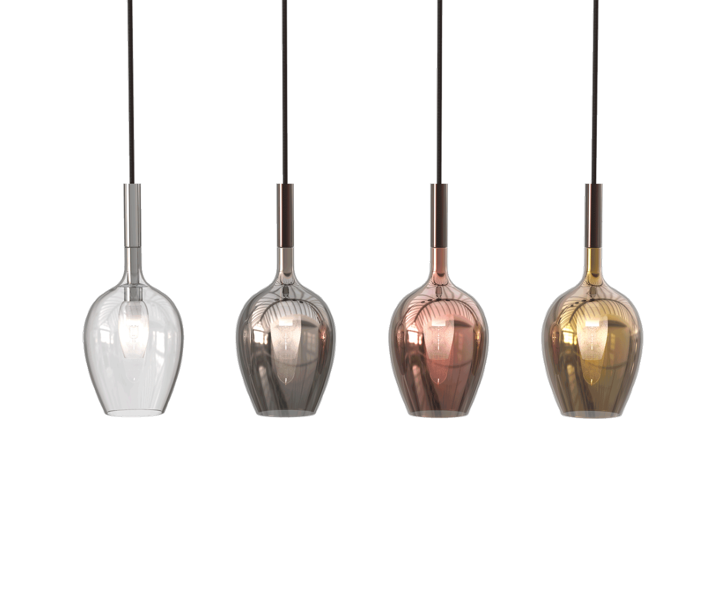 Подвесной светильник с рассеивателями из выдувного стекла и металлической структурой с хромированной отделкой. Доступен в разных цветах.