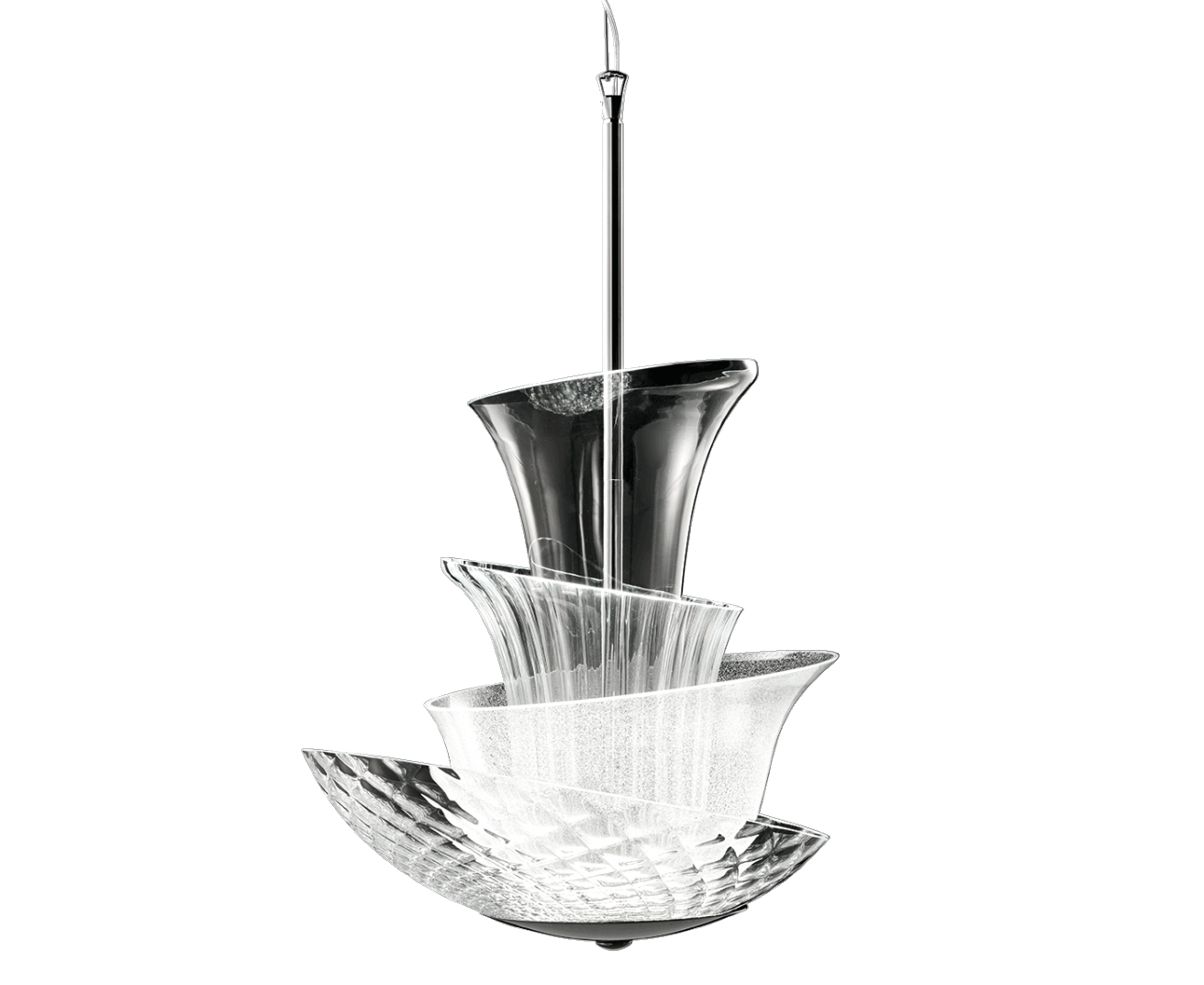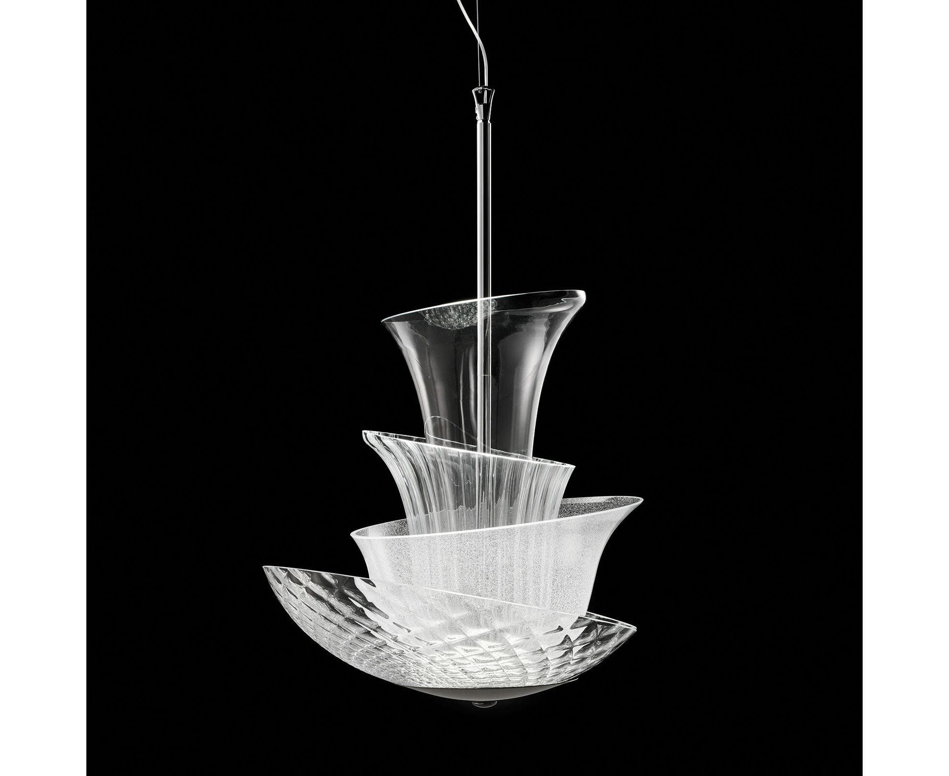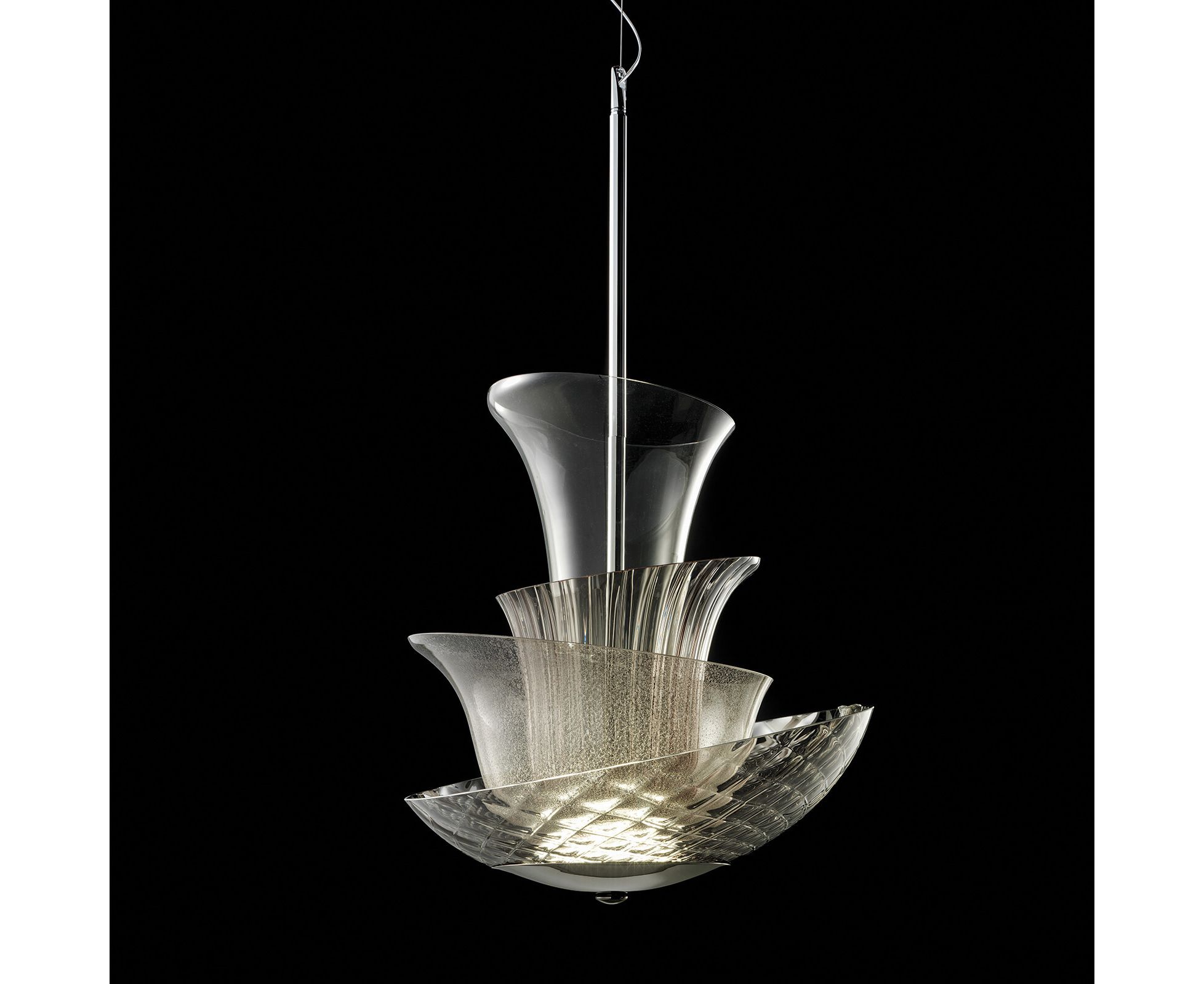 Подвеска из металла с серо-железной или хромированной отделкой и диффузорами из выдувного прозрачного или линейчатого стекла. Доступен в разных цветах. Современный каталог Incanto.