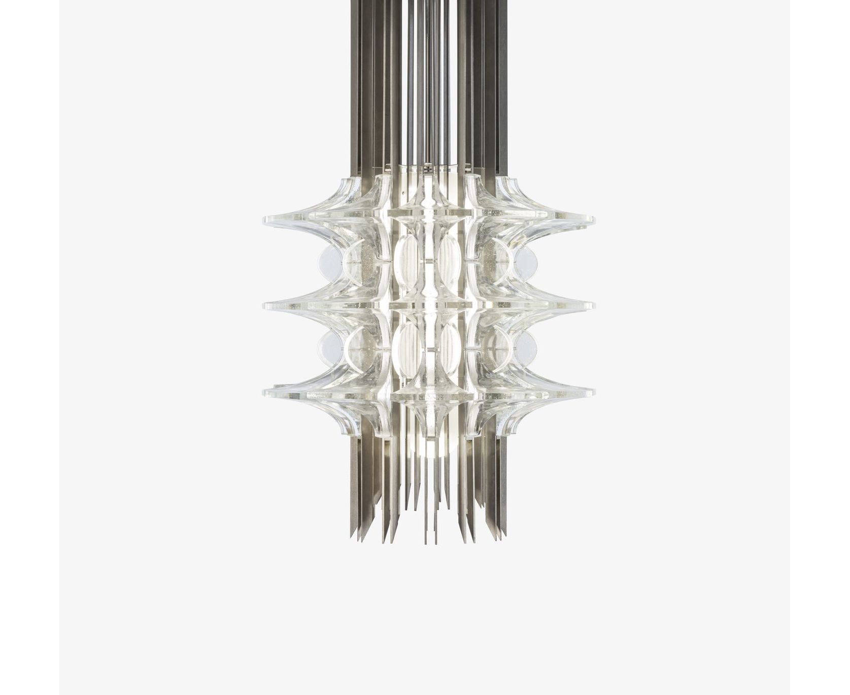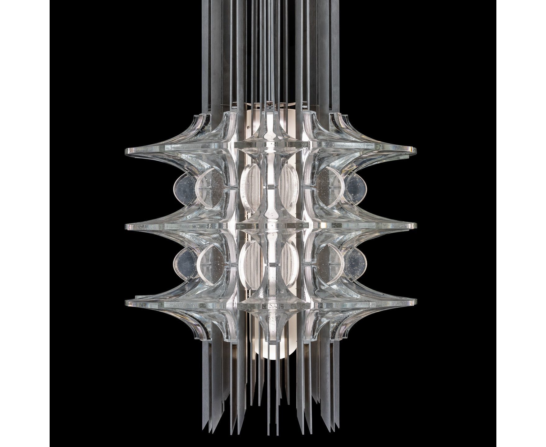 Одно из самых ранних вдохновений для этой люстры восходит к экспедиции Билла на остров Элсмир, где он путешествовал по ледникам. Когда он нарезал кусок льда для питьевой воды и посмотрел на него, у недавно взломанного льда было несколько такое же визуальное качество литого стекла. Светильник Glacier - это образец зимней красоты, идеально подходящий для выставок в доме, который может противостоять любой смене сезона.