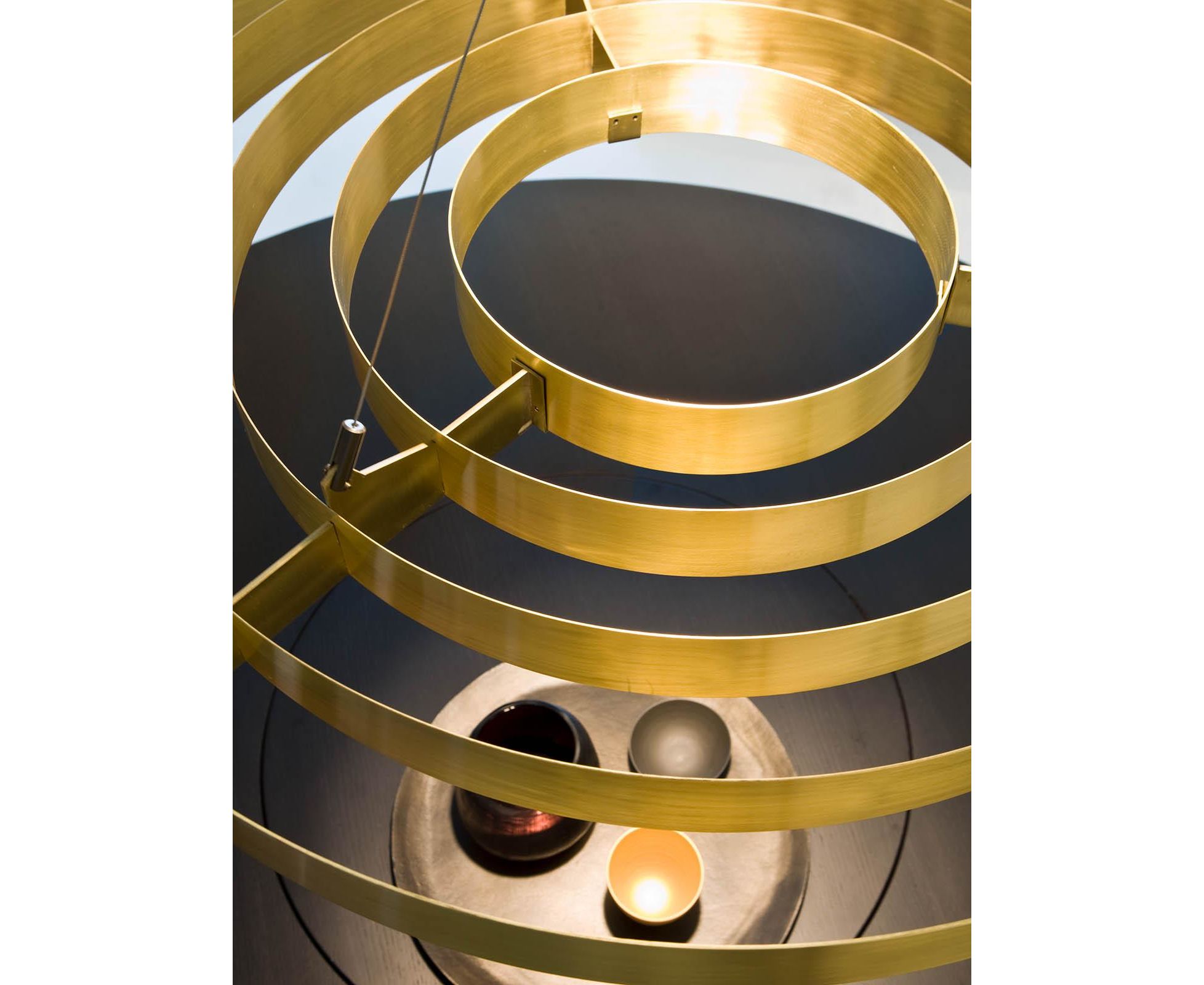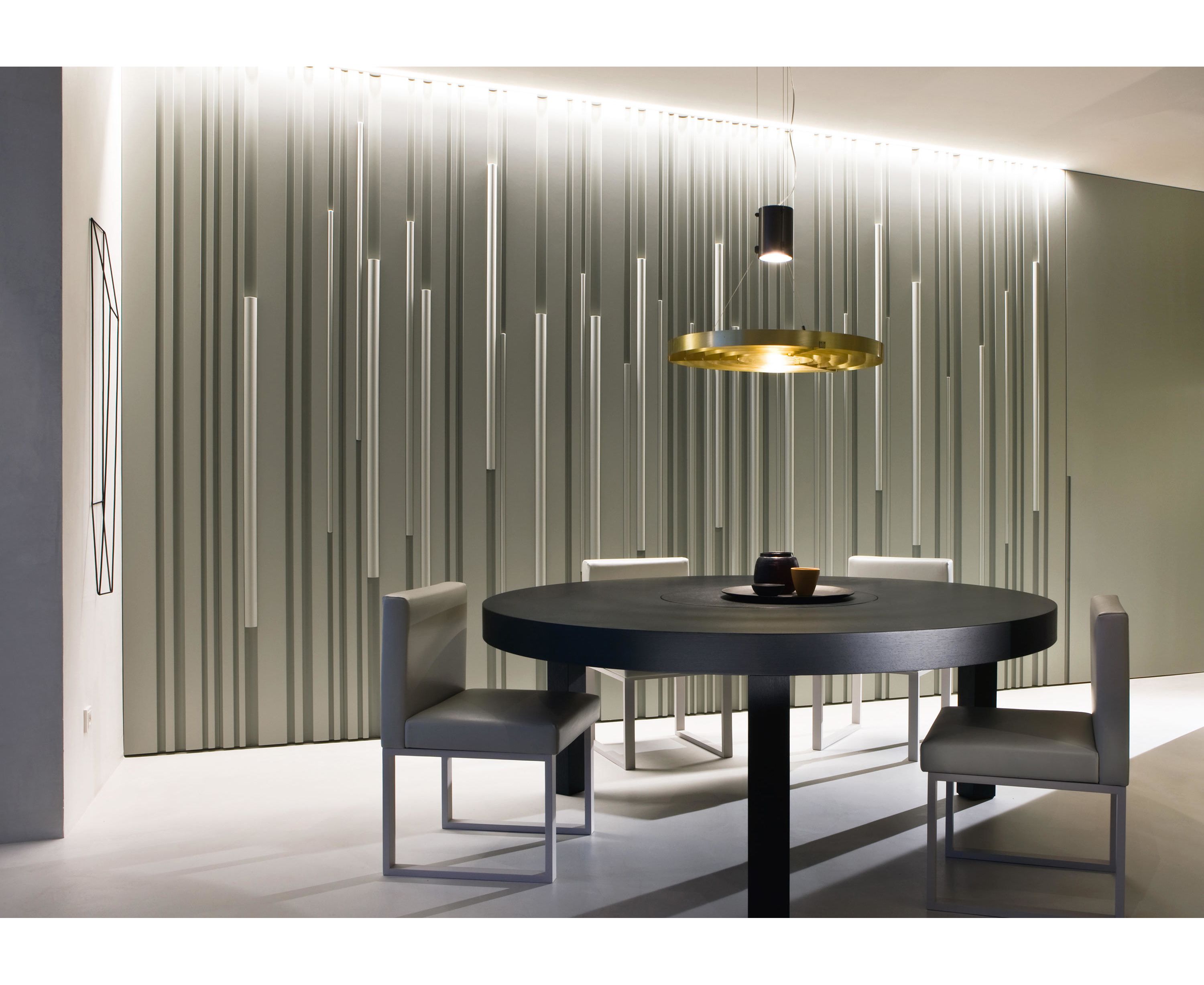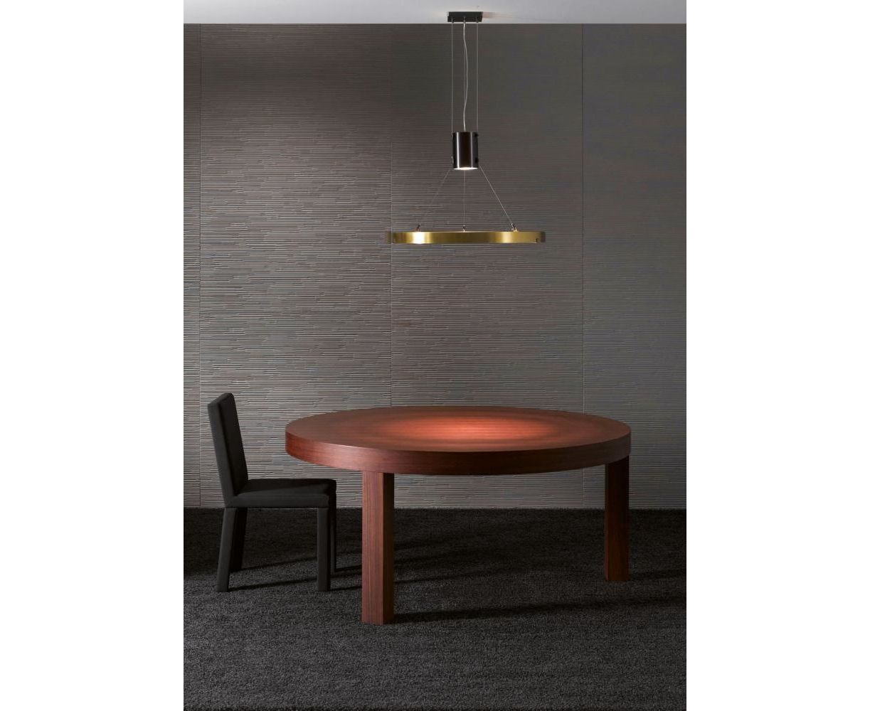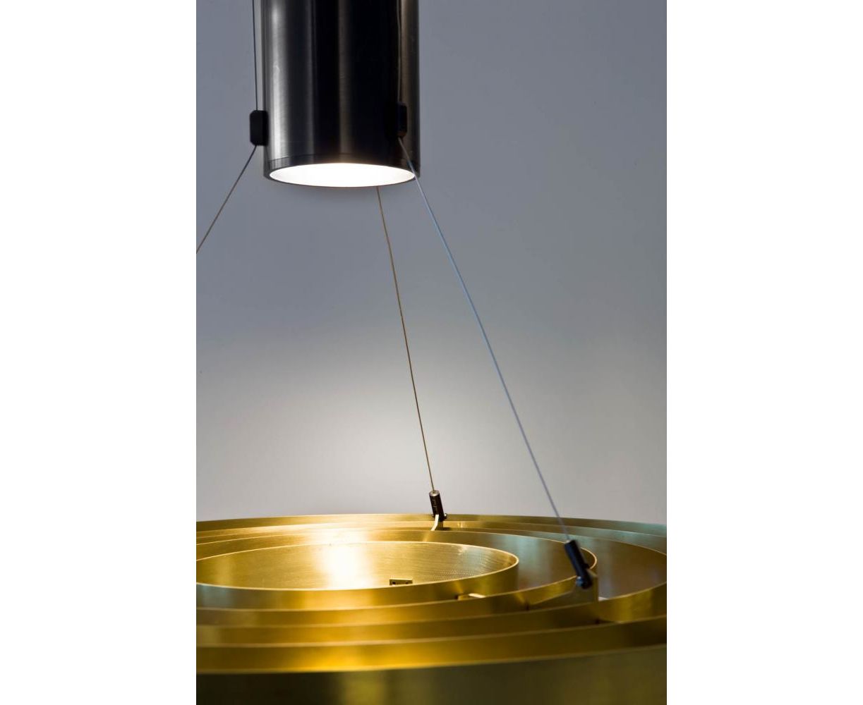 Подвесной светильник с центральным светящимся корпусом, проводами из стали и кольцами из сатинированной латуни. MA 10 обращается к используемой в некоторых офисах осветительной технике, обычно называемой «Darklight». Особая конструкция этих ламп позволяет направлять световой поток через отражатель, освещая пространство непосредственно под светильником.