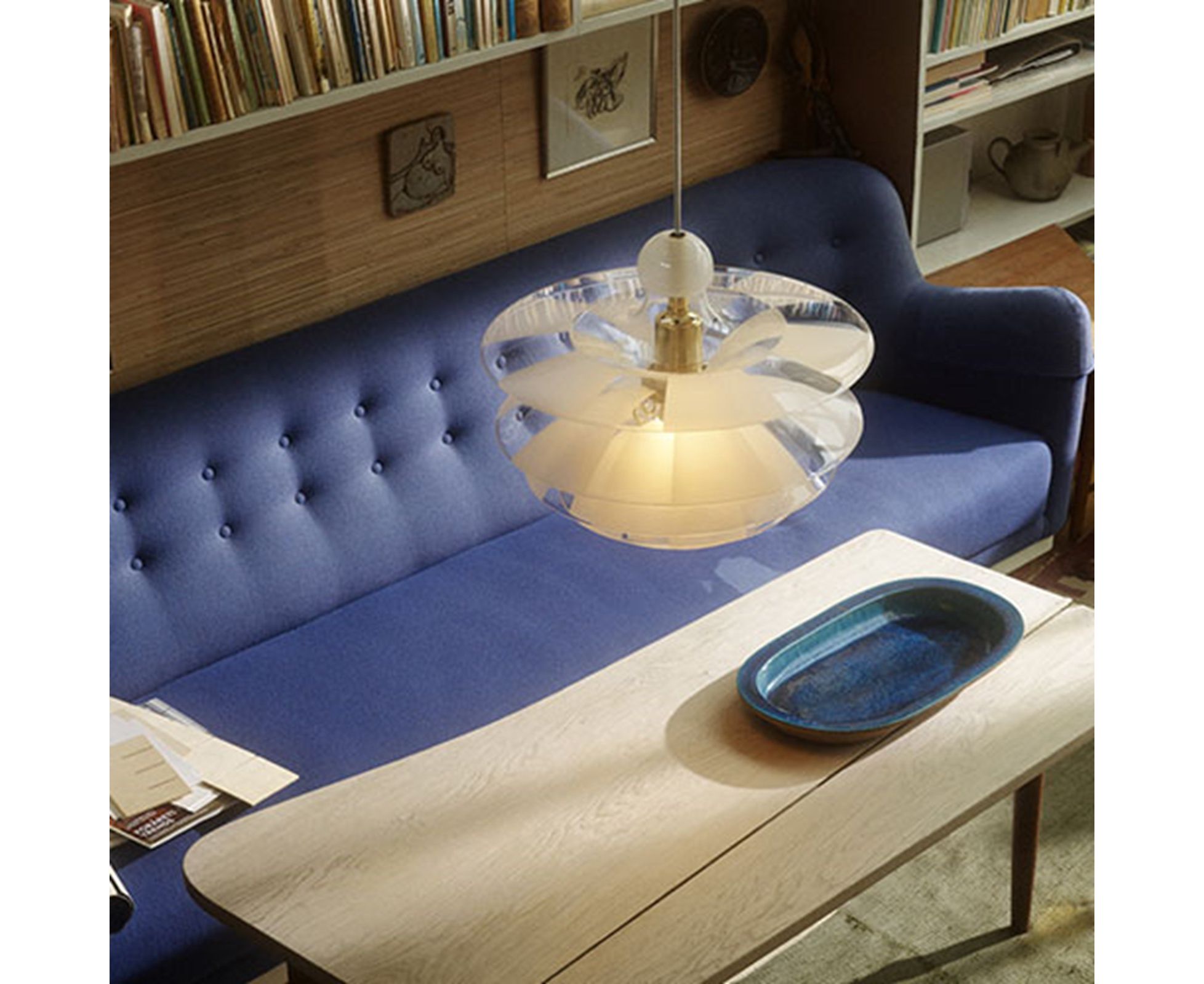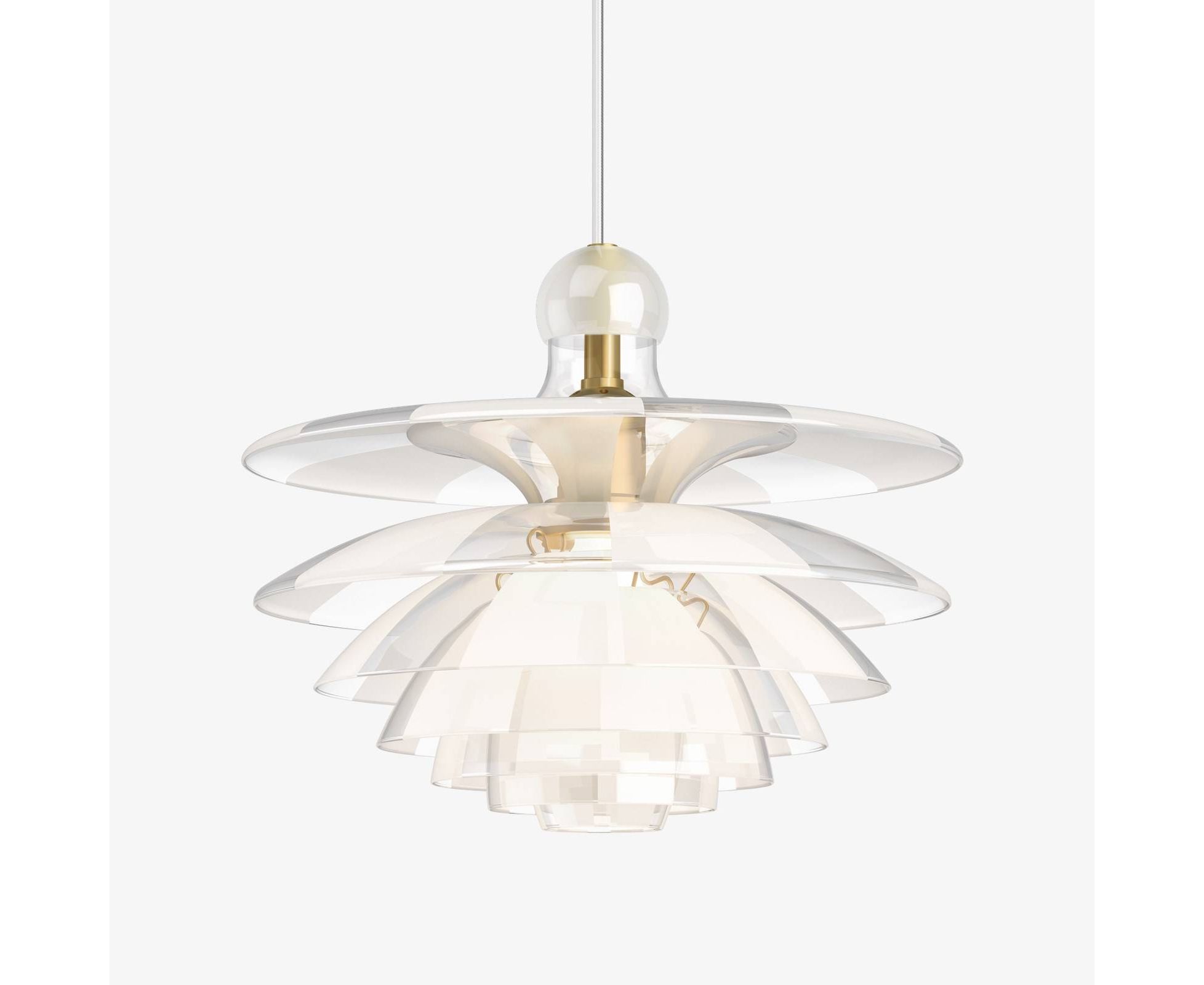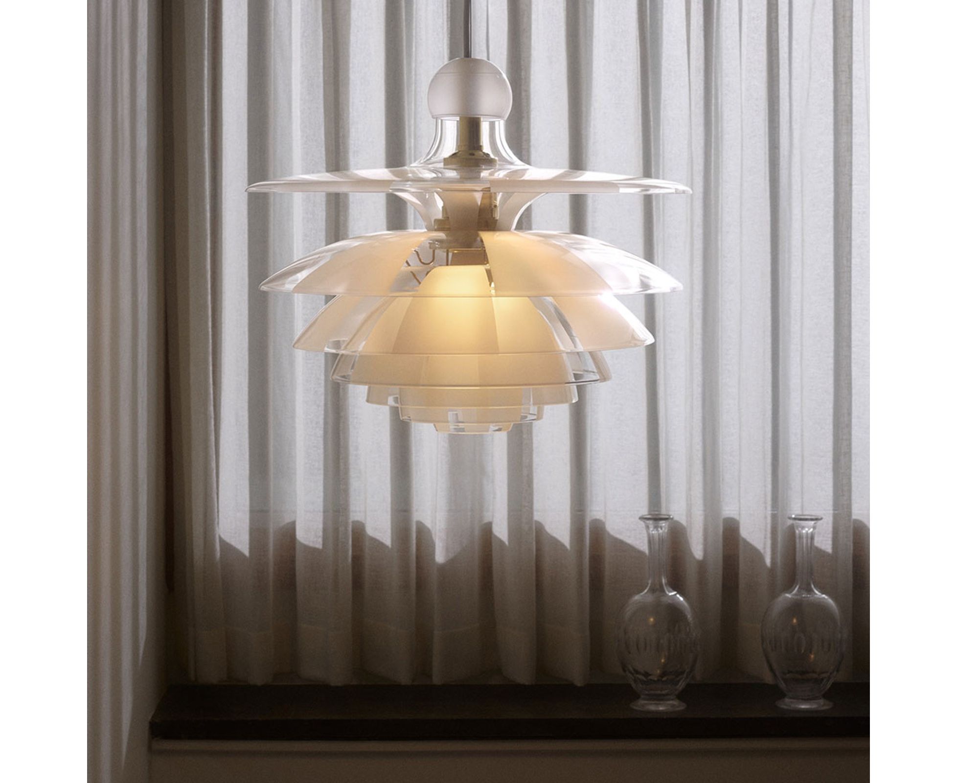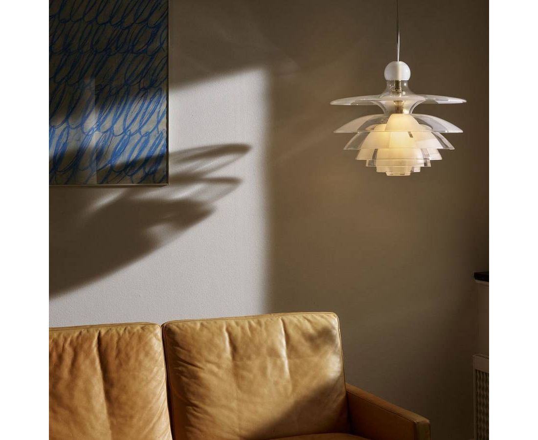 Семислойный стеклянный плафон излучает безбликовый направленный вниз свет, излучая при этом приятное нежное свечение. PH Septima считается одной из самых изысканных подвесок Poul Henningsen. Стеклянная головка имеет четыре дополнительных слоя, вставленных между тремя основными слоями - все семь производятся из очень деликатного, но прочного итальянского боросиликатного стекла. Слои из прозрачного стекла обрабатываются, чтобы дополнить с прозрачные и матовые поля и расположены таким образом, чтобы матовые поля покрывали прозрачные поля под ними, позволяя оттенкам распространять свет более рассеянным образом, сохраняя при этом безбликовое, направленное вниз распределение света. Кроме того, аккуратная круглая стеклянная чашка помещается наверху, чтобы предотвратить попадание пыли.
