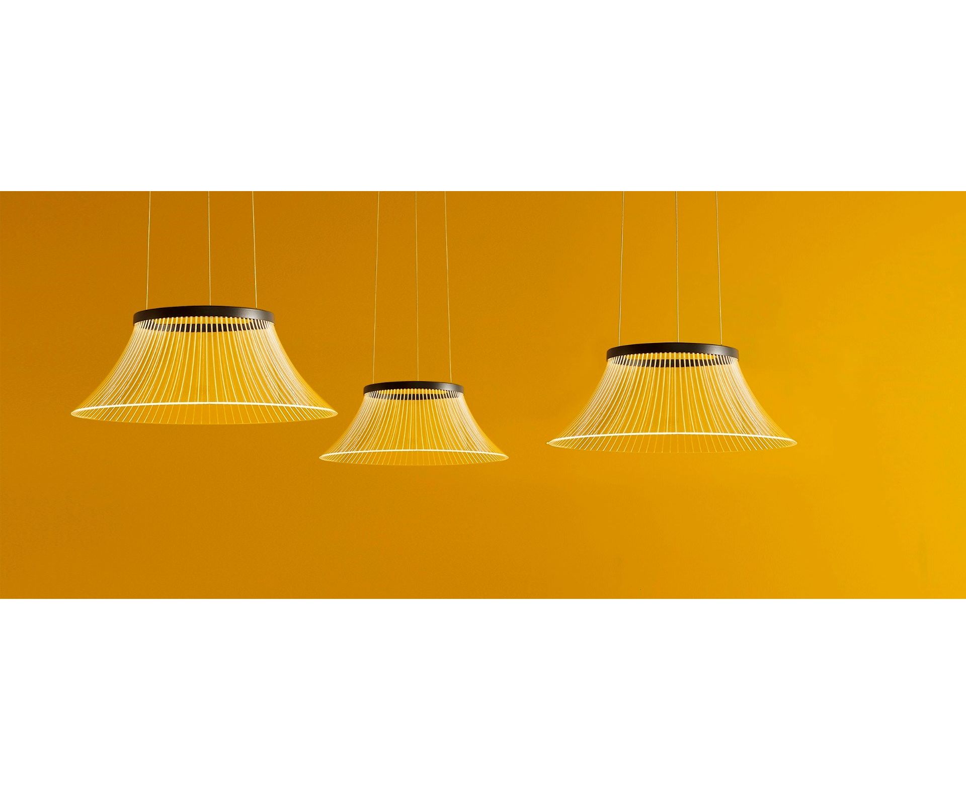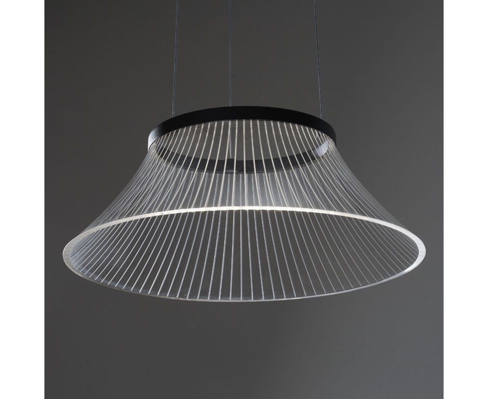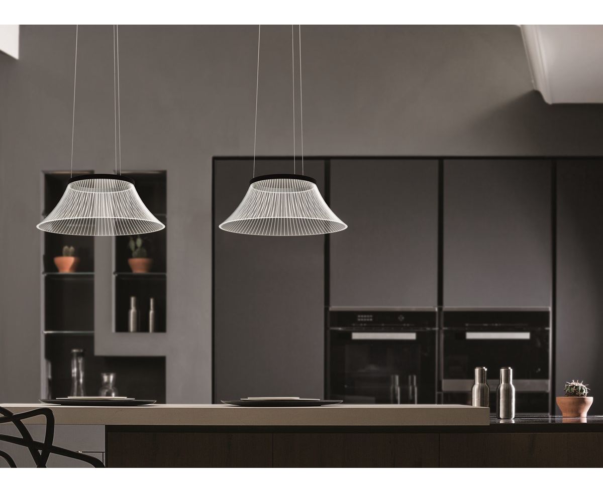 Подвесная лампа, рассеянный свет с прозрачным рассеивателем из метакрилата и эффект нарисованных лазером линий, которые освещаются светодиодным источником света внутри лакированной алюминиевой круглой опоры для определения формы. Электронный драйвер встроен в потолочную коробку.