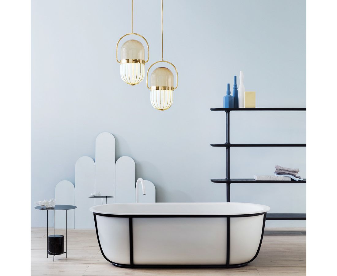 Эта коллекция подвесных, настольных ламп или торшеров - дань античной технике изготовления стекла, где стекло выдувается непосредственно в металлической клетке. Неразрывная связь между металлической структурой и муранским стеклом, которая, кажется, объединяется и сливается в единое целое.
