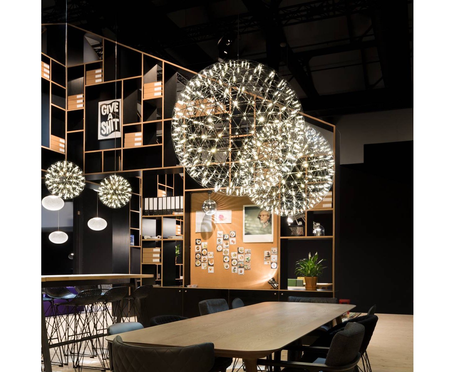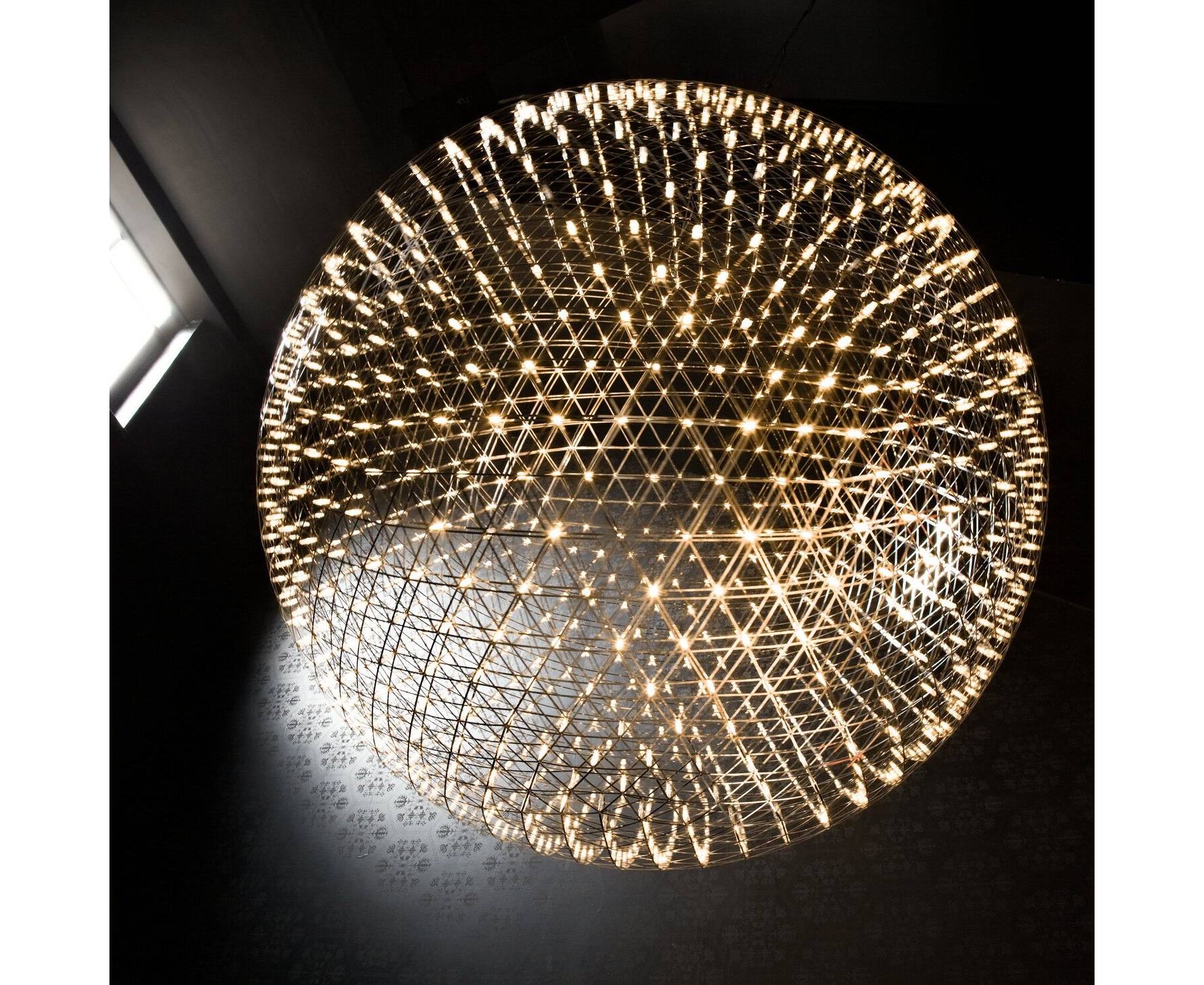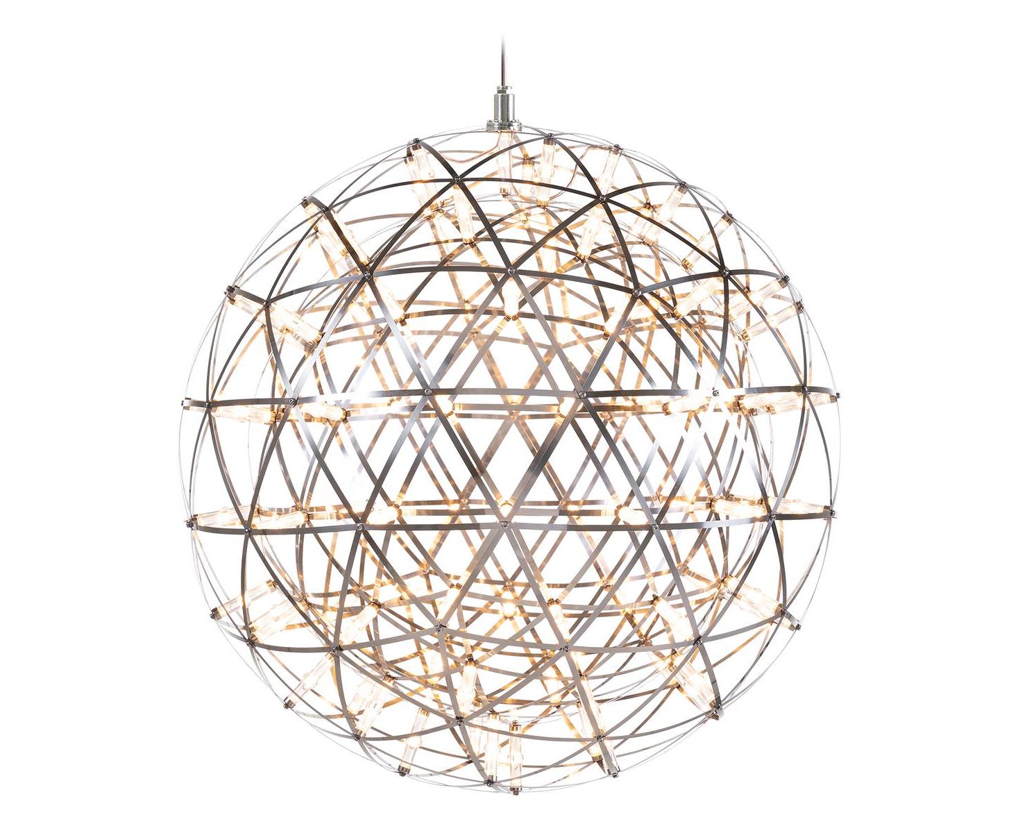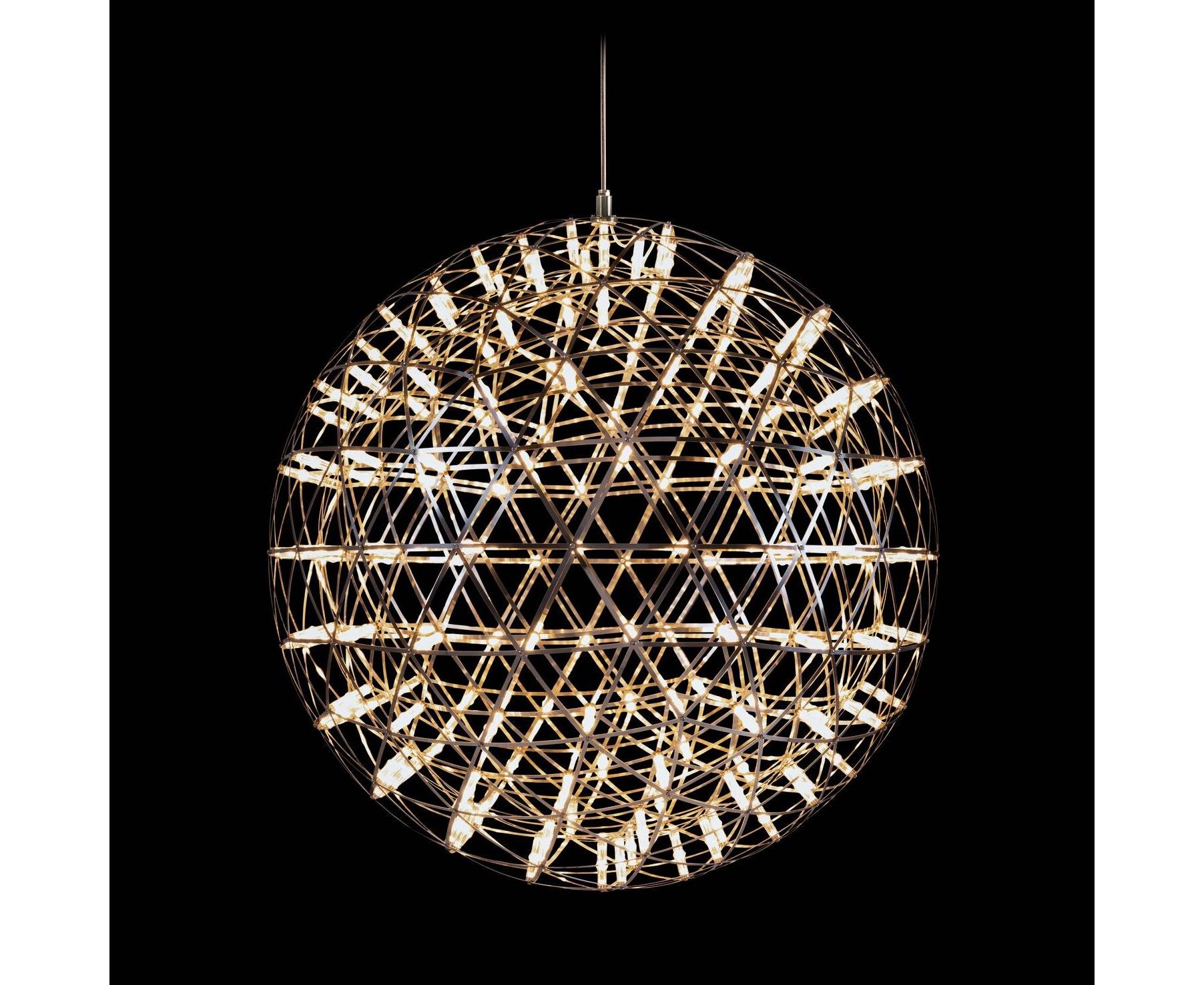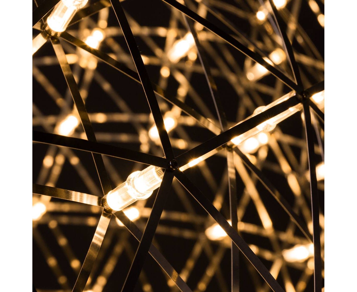Подвесной светильник Moooi Raimond II - идеальная сфера из геометрических фигур, перемежающихся крошечными светодиодными лампами. Дизайнер Raimond Puts был заинтригован не только формой геодезического купола, но и тайной простых чисел. Не случайно размерность всех огней Raimond напоминает простое число. Результат математического совершенства, который приносит звездное ночное небо в ваш дом. Совместимость с беспроводным настенным переключателем для быстрого и легкого затемнения, дает полный контроль над светоотдачей.