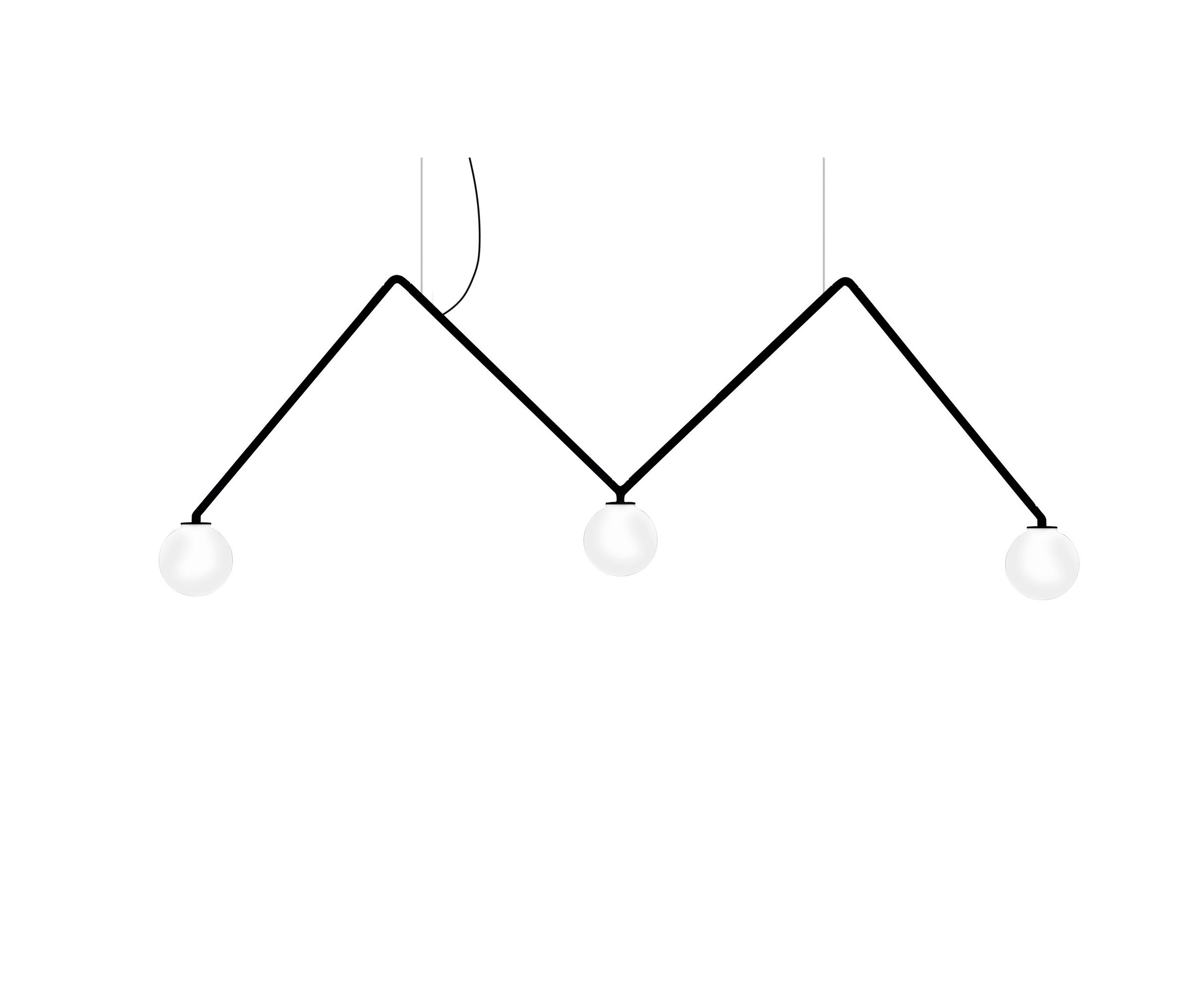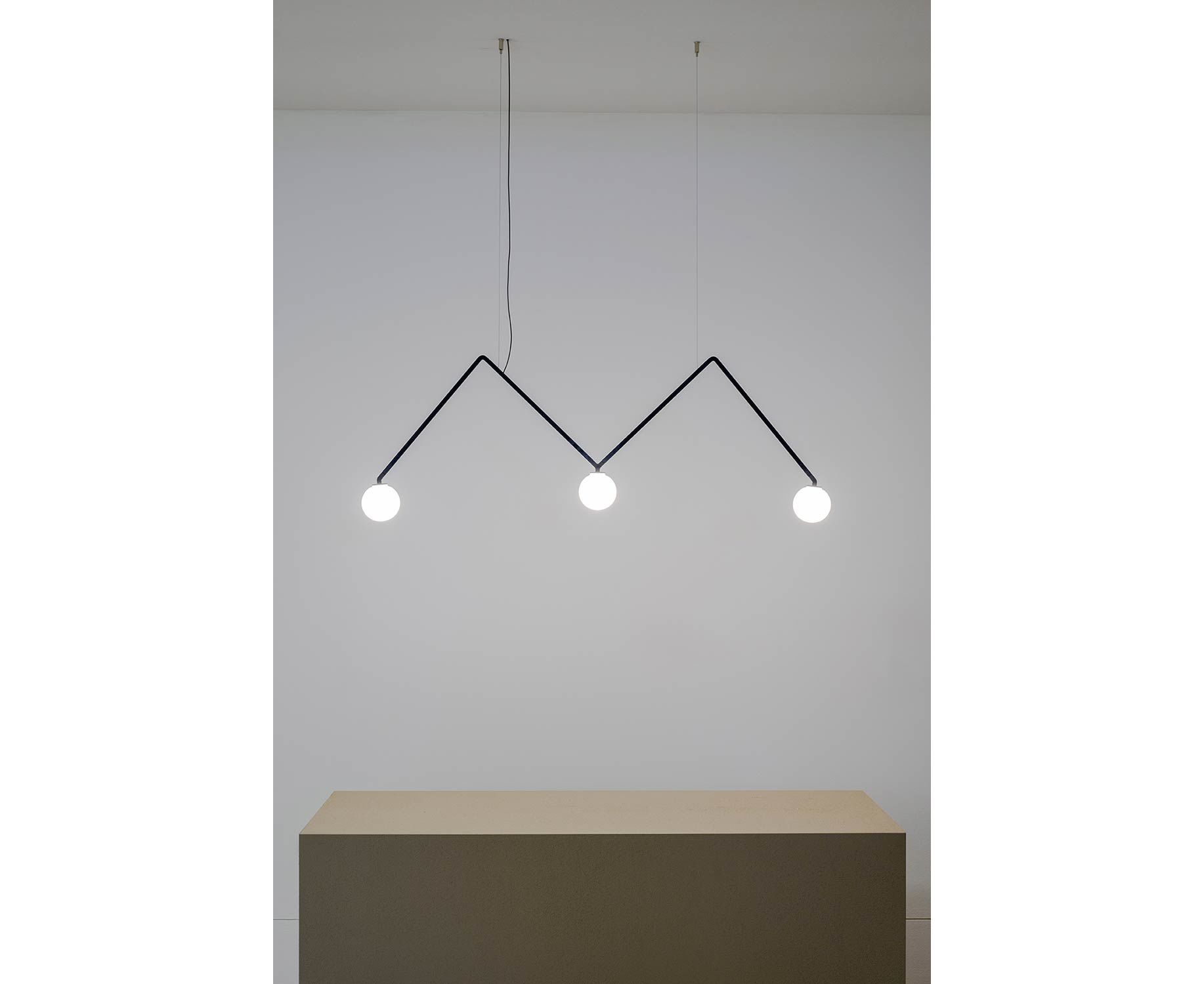 Подвесной светильник из алюминия. Состоит из тонкой структуры с тремя точками света и рассеивателями, которые могут быть выбраны в соответствии с различными версиями. Доступна точечная версия для точечного освещения, версия со сферическим рассеивателем из опалового выдувного стекла и версия с металлическим конусом из полированного золота и черной отделки, обеспечивающая большее рассеивание света. Светодиод затемняемый.