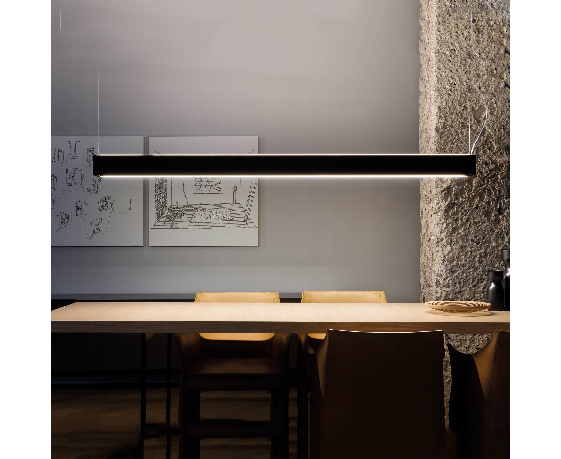 Горизонтальный и вертикальный подвесной светильник с двойным линейным светодиодным источником. Корпус из экструдированного алюминия. Головки из литого смешанного полимерного материала с диффузорами из опалового метакрилата. Структура окрашена в белый матовый, черный матовый и серый титановый цвет. Горизонтальная версия доступна с восходящим и нисходящим потоком, или с общим увеличением и уменьшением. Диммируемый.