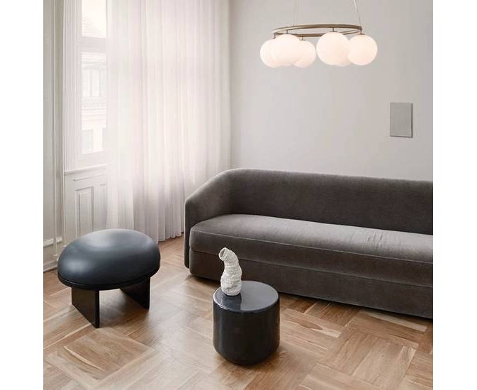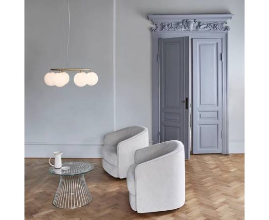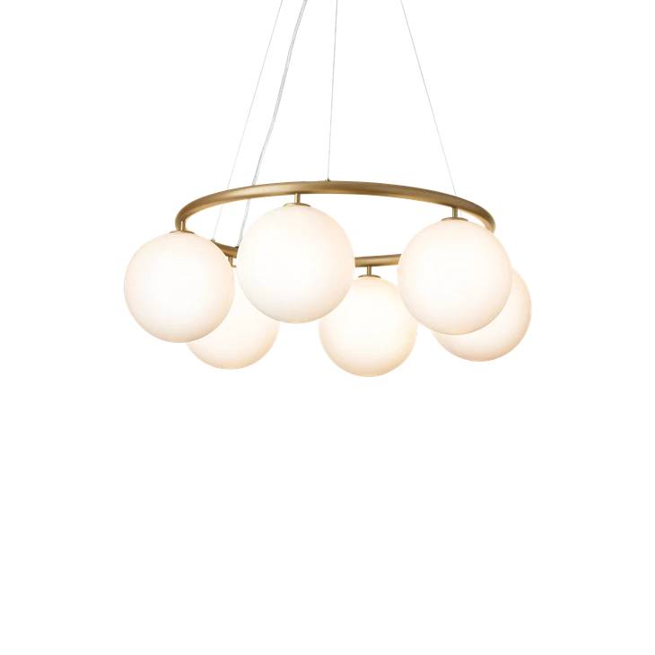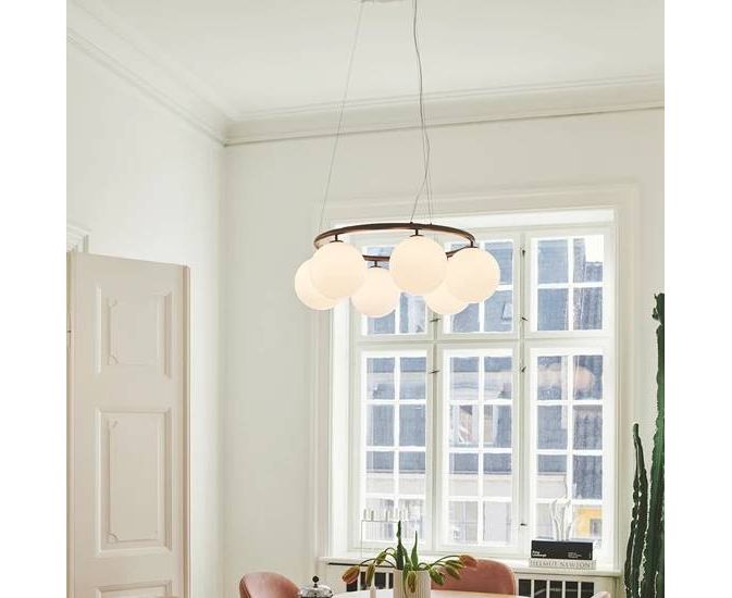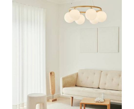 Miira 6 Circular имеет классический внешний вид и предназначена для того, чтобы свисать высоко или низко с потолка. Специальная проволочная система используется для легкой регулировки высоты от 20 до 250 см. Люстра Miira представляет собой металлическое кольцо с порошковым покрытием латунного цвета, и от этого стеклянные купола из опалового белого стекла распространяют чувственный свет. Простой, классический дизайн делает эту люстру полезным элементом во многих дизайнах интерьера. Он имеет диаметр 80 см, что делает его идеальным для размещения над обеденным столом или диваном.