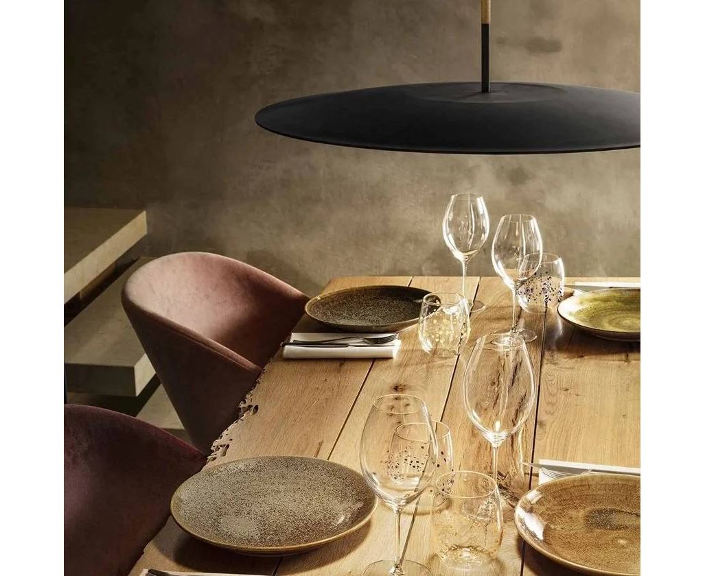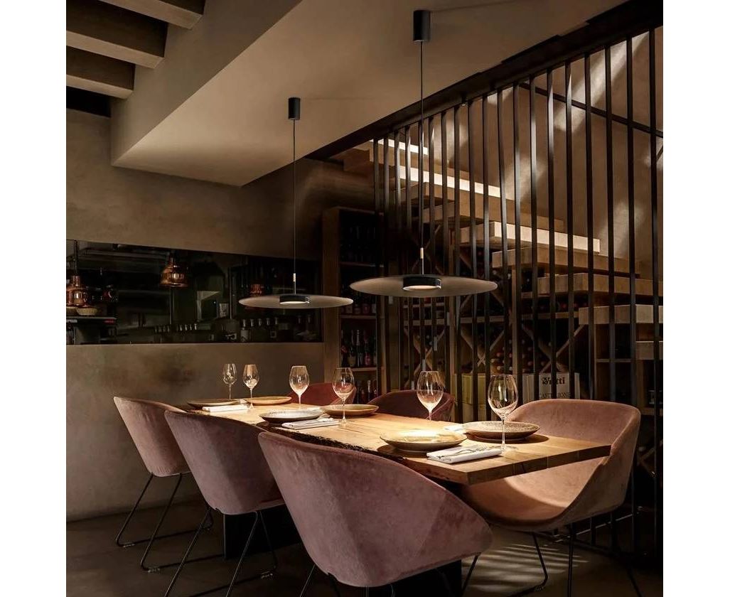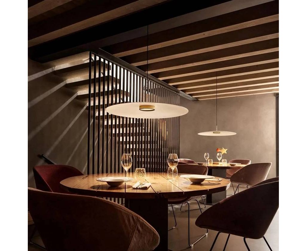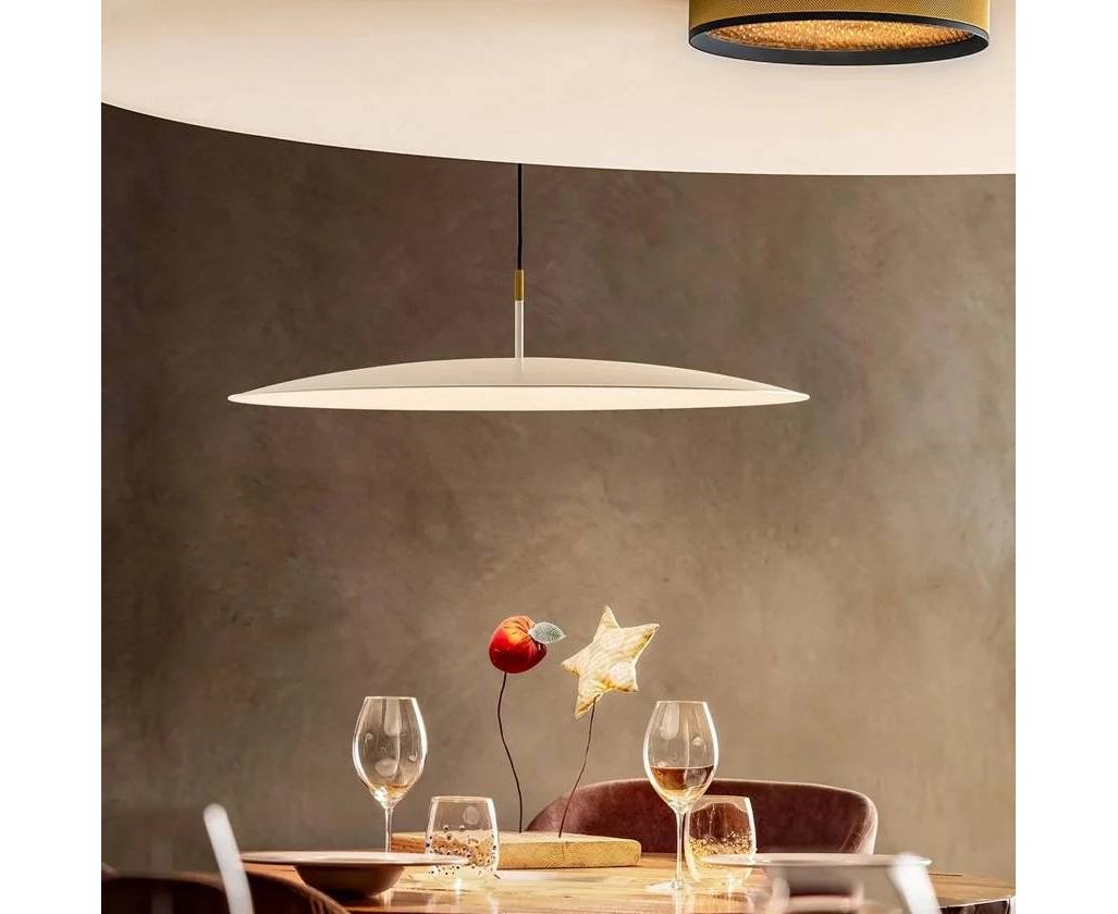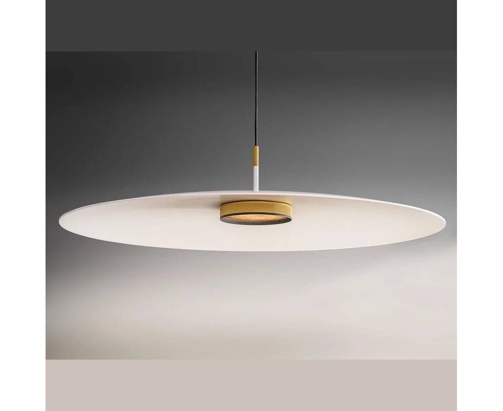 Overfly Plus - это подвесная лампа, которая благодаря своей слегка вогнутой тонкой пластине напоминает культовую форму НЛО. Его нежное и чрезвычайно изысканное сценическое присутствие украшено крест-накрест рифлеными насечками, которые покрывают весь периметр нижнего диска. Он идеально подходит для освещения обеденного стола, благодаря прямому направленному вниз свету, который становится комфортным благодаря сотовому фильтру, встроенному в источник света.