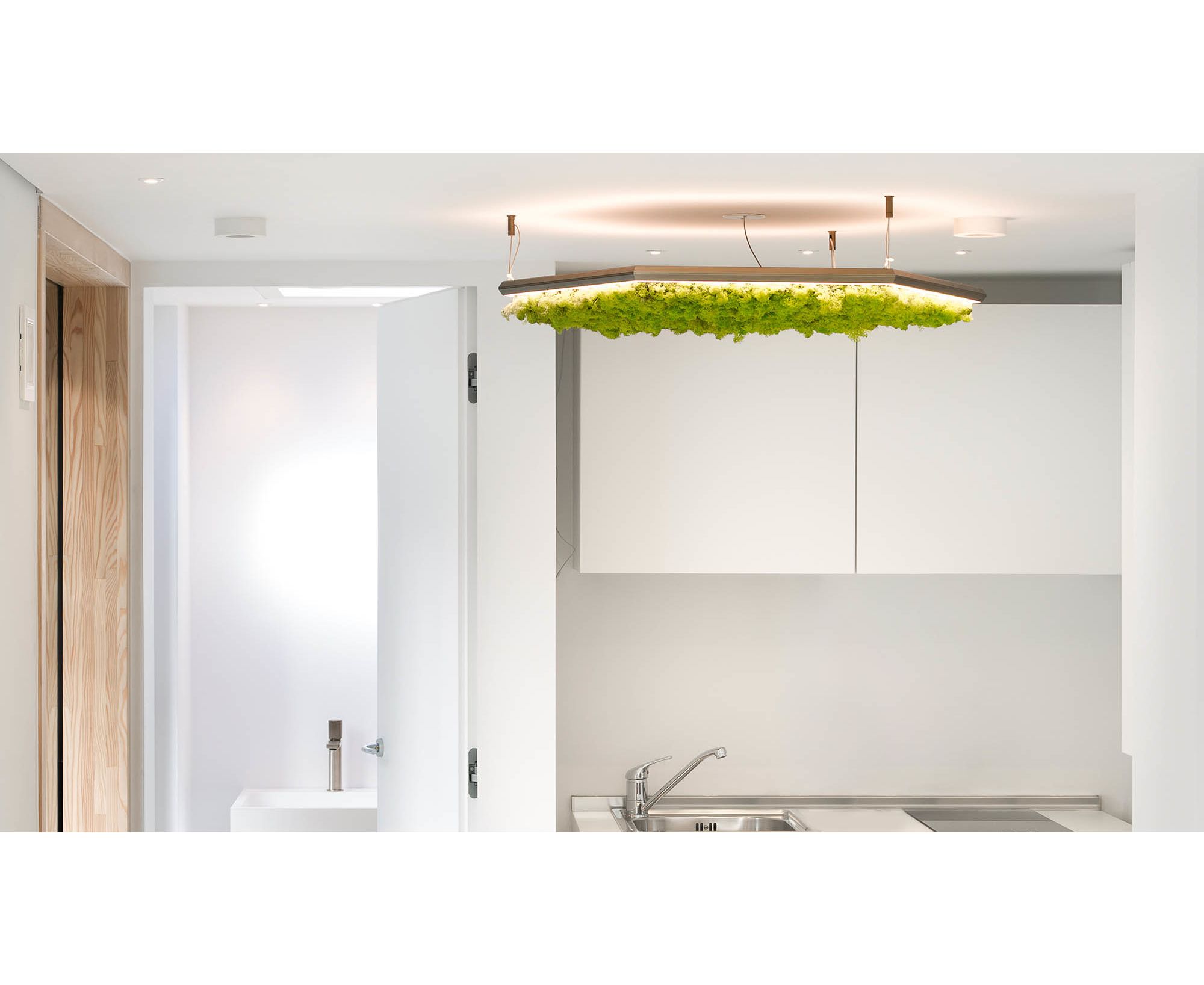 Poly Soundless - это современное световое решение, которое сочетает в себе освещение, дизайн и технологию акустического комфорта. Эта шестиугольная подвесная лампа, рассеивающая свет вверх и вниз, также включает в себя звукопоглощающие панели, которые уменьшают шум в общественных местах.