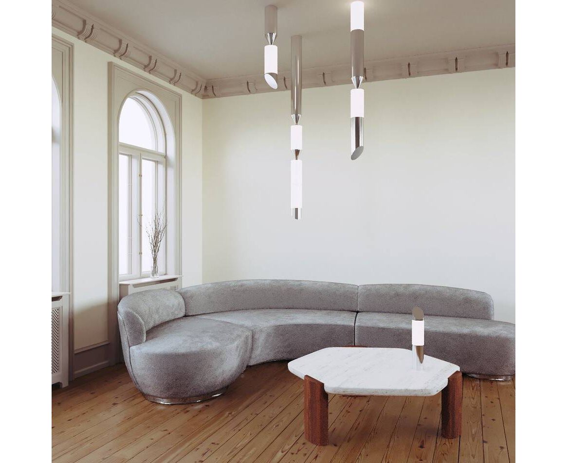 Подобно сталактитам, силуэт Gwen играет такую же важную роль в восприятии, как и форма самого объекта. Тонкие асимметричные формы позволяют изделию принимать различные формы под любым углом. Функциональный светодиодный источник света мягко рассеивается белым стеклом, контрастируя с отполированными вручную секциями из полудрагоценного металла. Gwen может выступать как в качестве самостоятельного одиночного светильника, так и быть сгруппирована в композиции для большего визуального эффекта.
