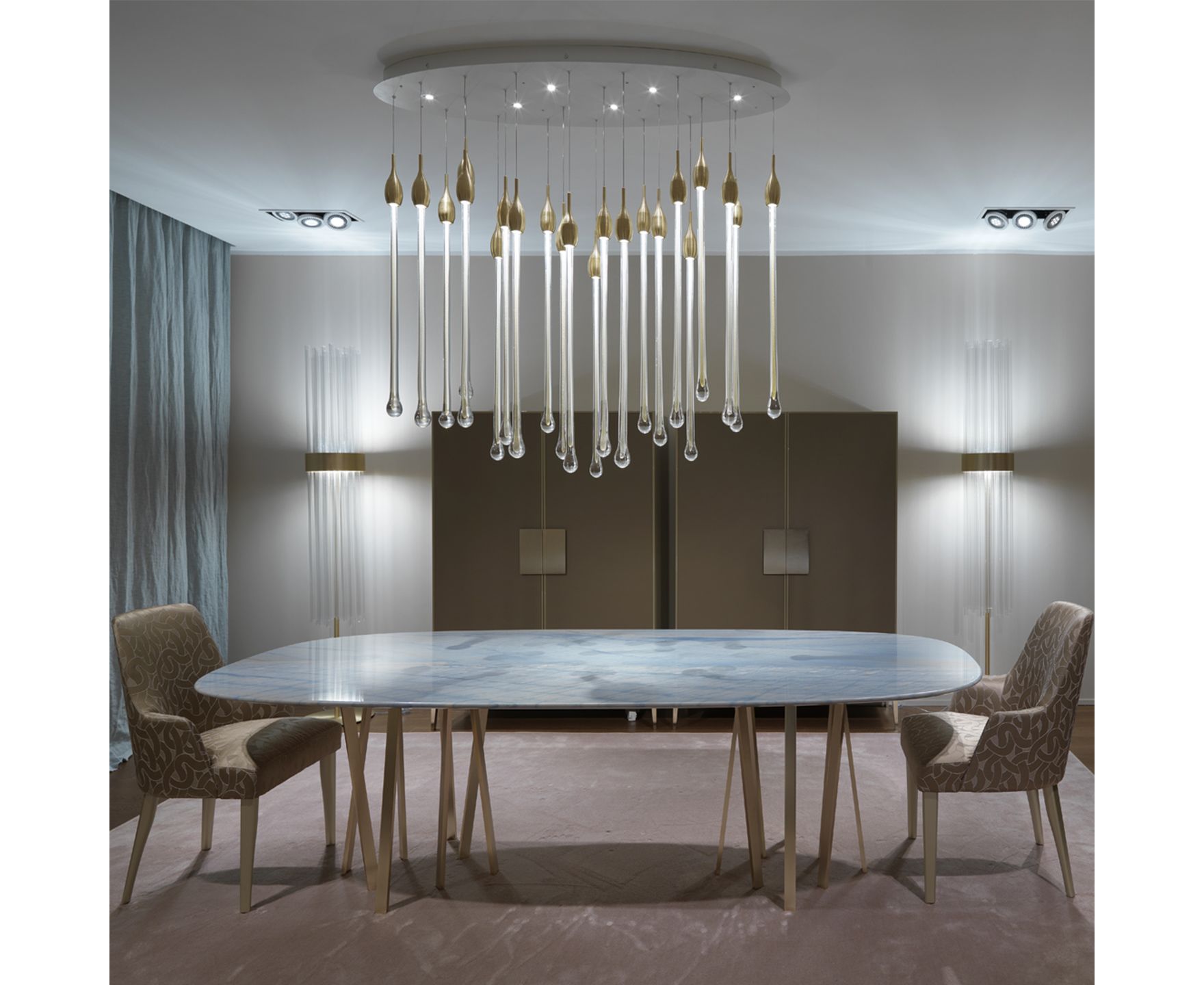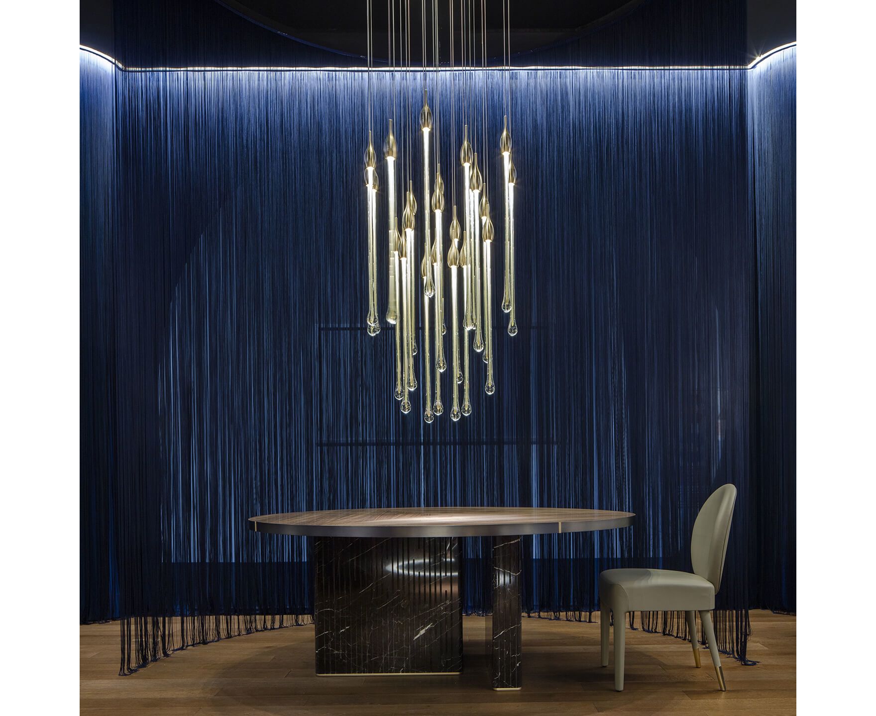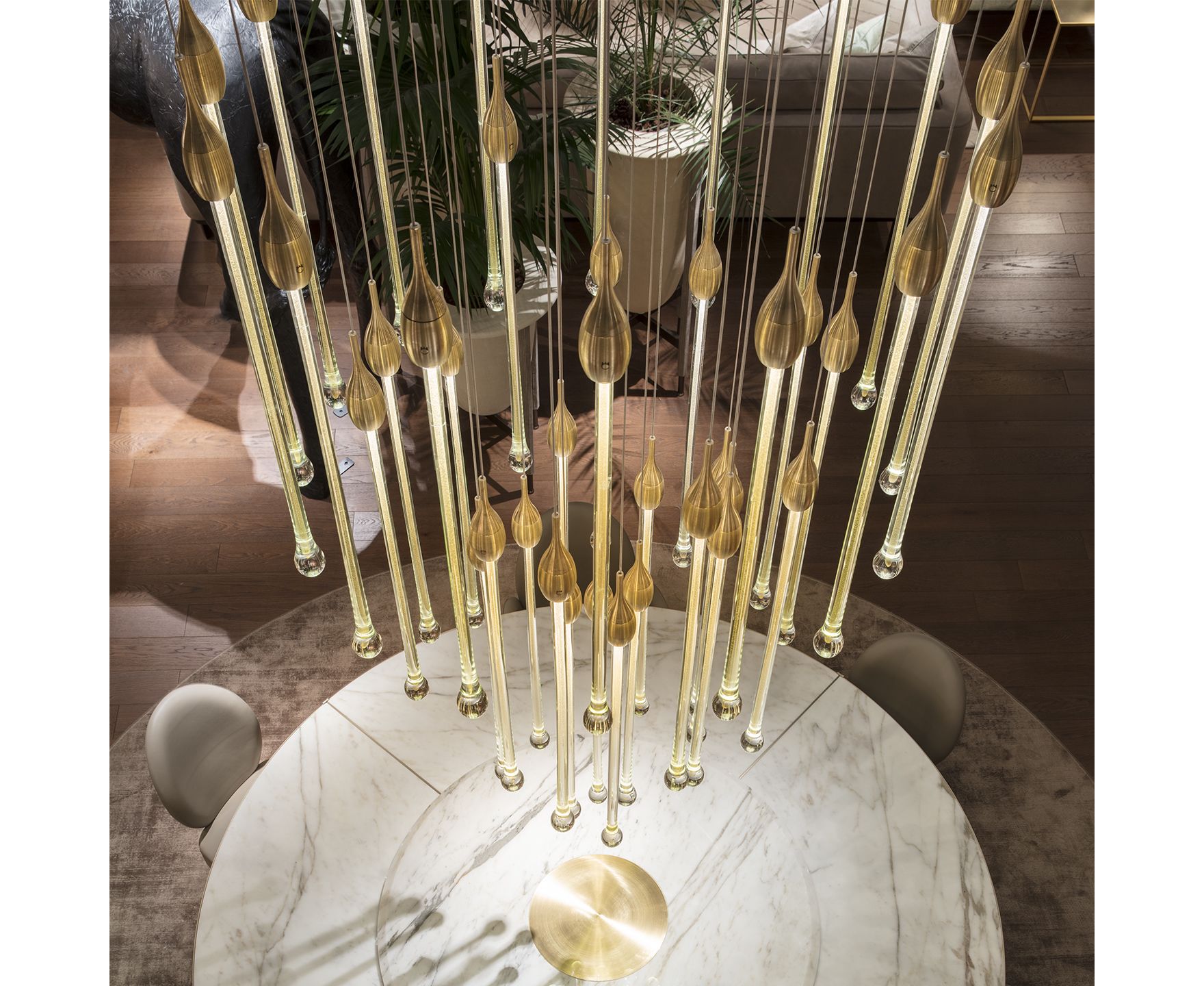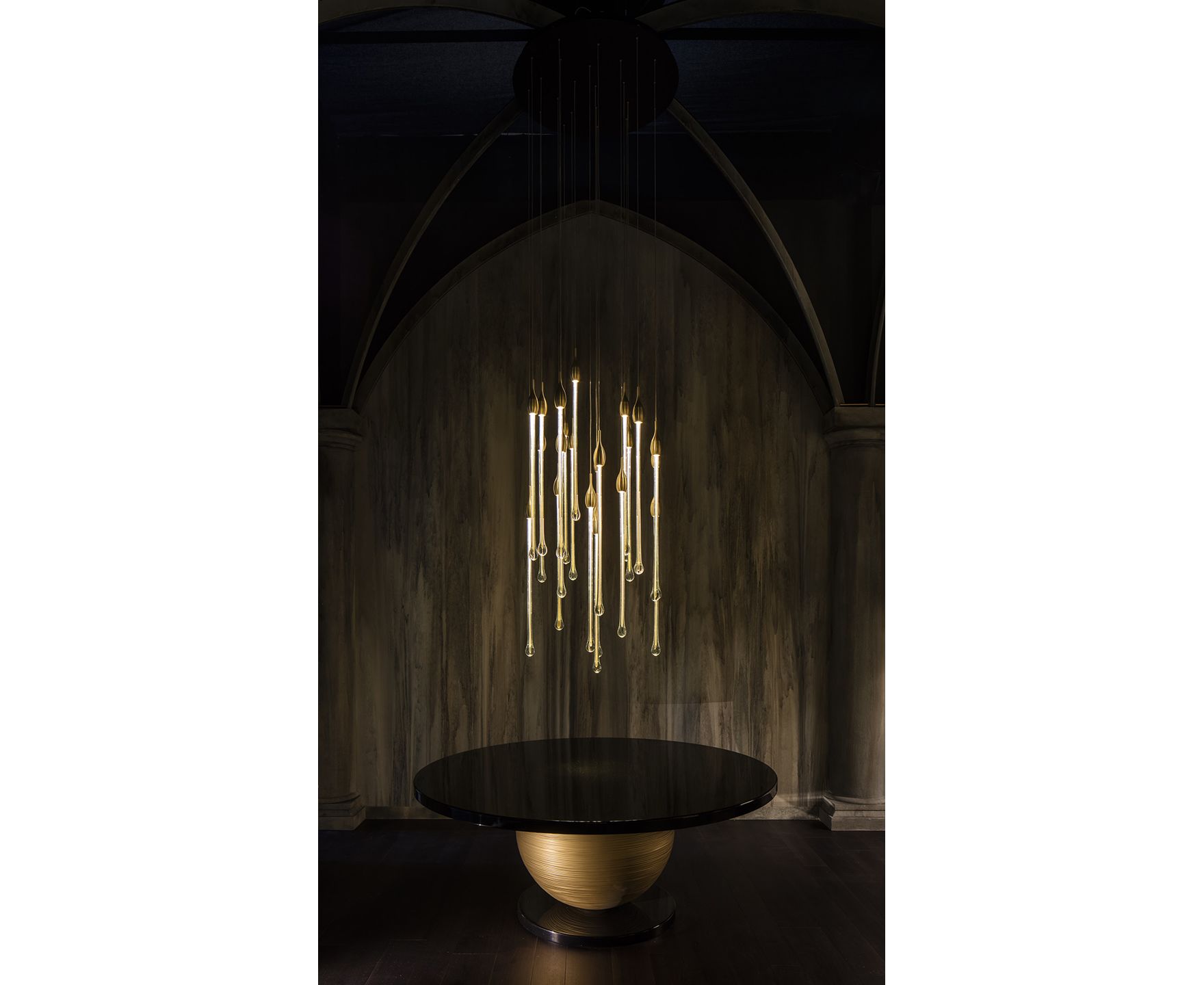 Allure - это изысканная лампа, полностью изготовленная вручную в соответствии с традиционными методами мурано. Капли цвета венецианского хрусталя (22 капли и 5 ламп для овальной версии и 23 капли и 6 ламп для круглой версии), расположенные на разной высоте, выполнены из твердого муранского стекла с драгоценным листом золота или серебра 24 карата. В золотой отделке верхняя крышка изготовлена из латуни; в то время как в серебряной отделке она сделана из алюминия и включает в себя современную светодиодную опору. Верхняя пластина прикреплена к стальной пластине, окрашенной в черный или белый цвет. Светильник доступен в двух версиях: овальной и круглой.