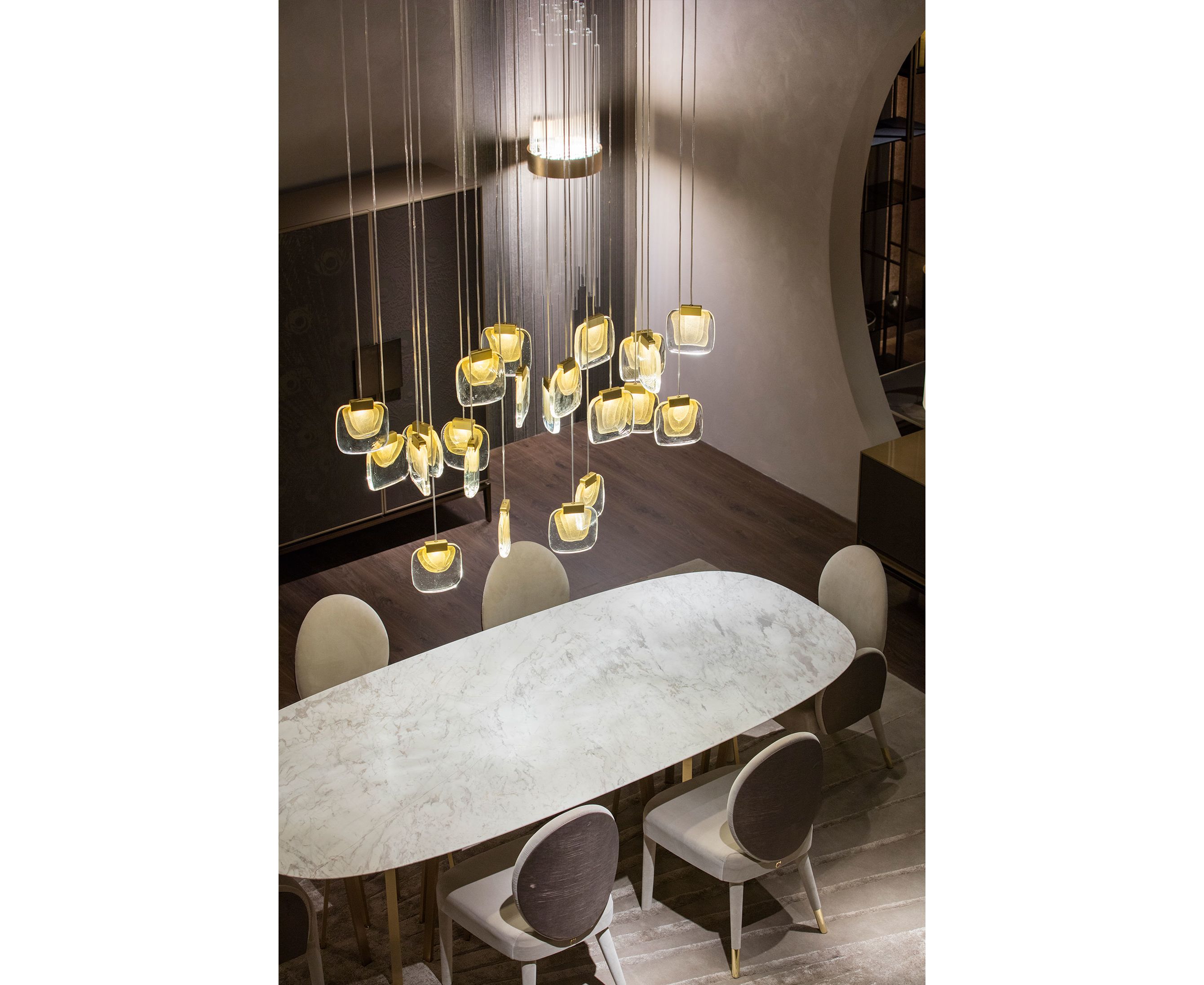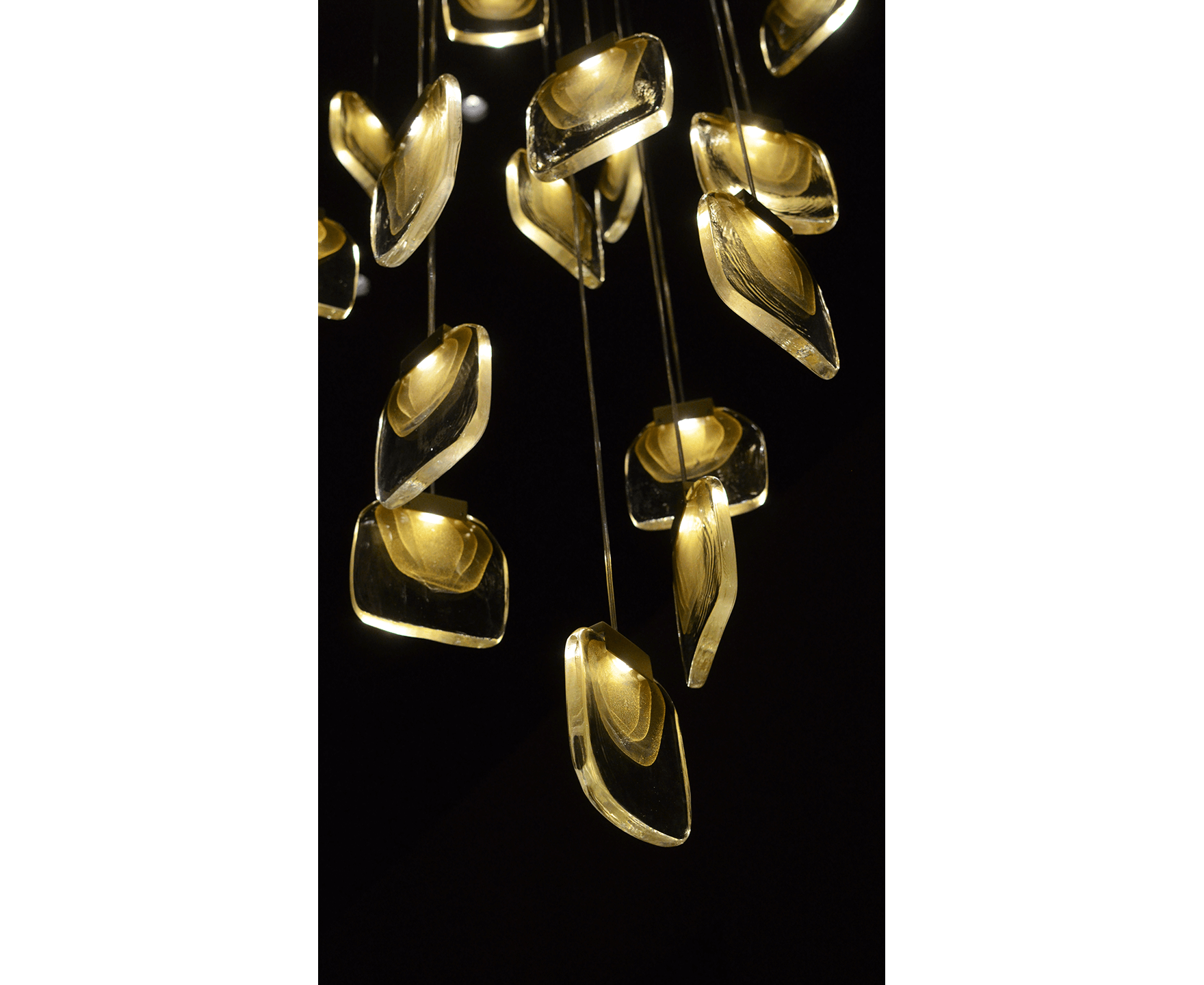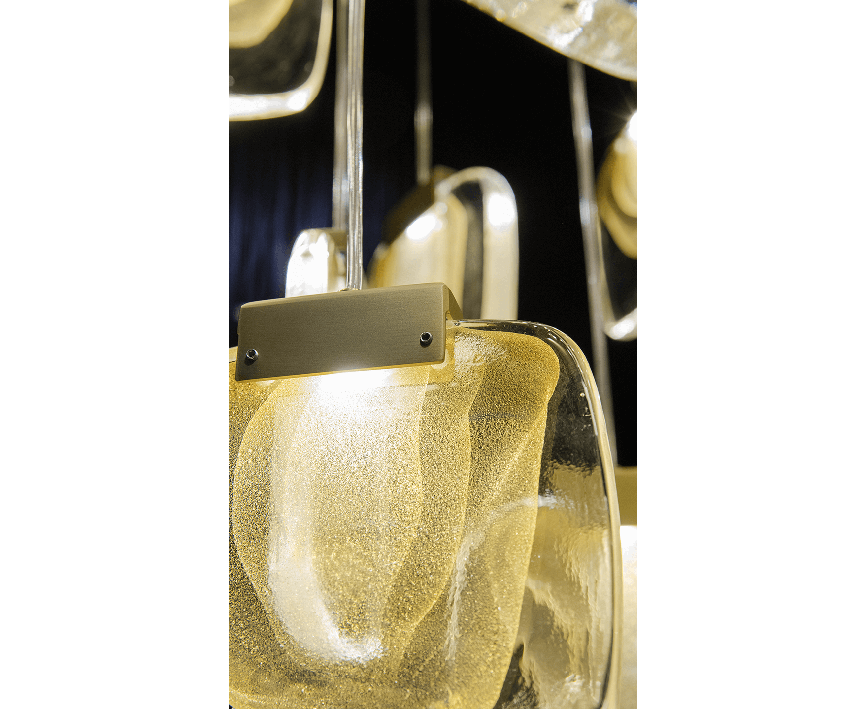 Изысканная люстра, сделанная полностью вручную в соответствии с древнейшими традициями Мурано. Корпус из 22 «облаков» (овальная версия, с 6 встроенными прожекторами) и 23 «облаков» (круглая версия, с 5 встроенными прожекторами), расположенных на ступенчатой высоте, выполнен из муранского стекла с тройным проходом сусального золота и формируется вручную в формы. Стеклянное «облако» прикреплено к металлическому корпусу с отделкой из сатинированного золота и оснащено современным светодиодным источником света. Металлический корпус закреплен на стальной пластине, окрашенной в белый или черный цвет. Доступен в двух версиях: овальный и круглый.