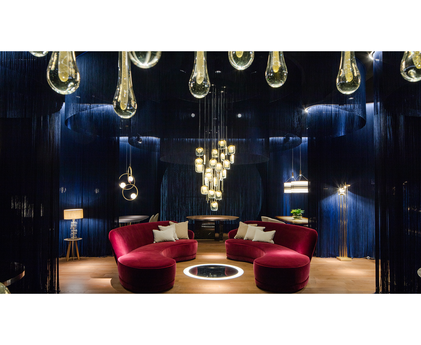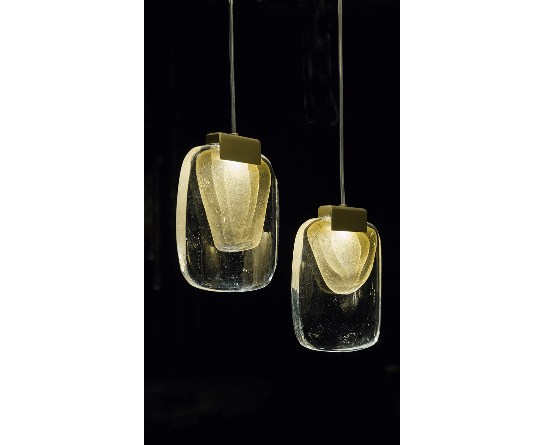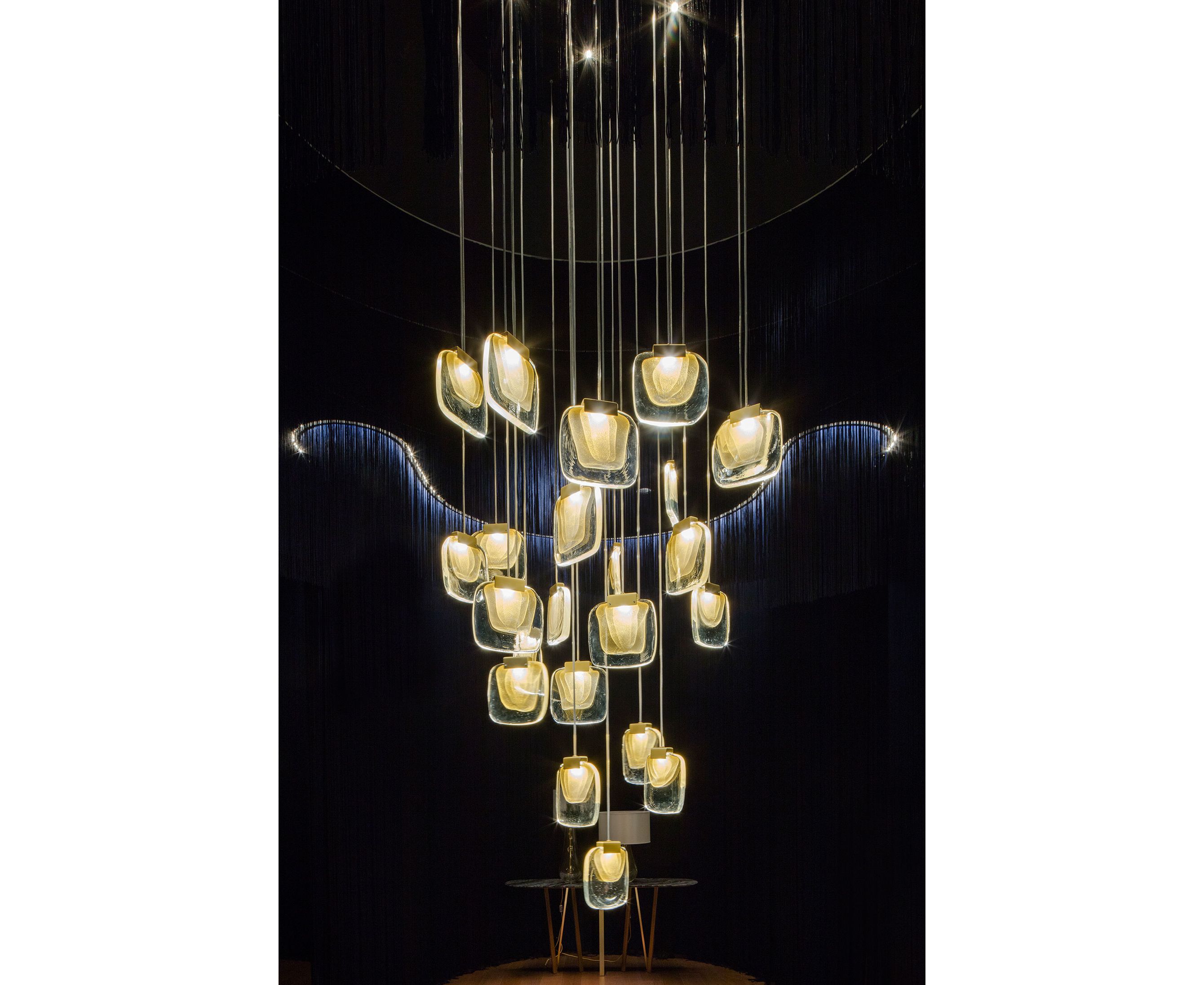 Изысканная люстра, сделанная полностью вручную в соответствии с древнейшими традициями Мурано. Корпус из 22 «облаков» (овальная версия, с 6 встроенными прожекторами) и 23 «облаков» (круглая версия, с 5 встроенными прожекторами), расположенных на ступенчатой высоте, выполнен из муранского стекла с тройным проходом сусального золота и формируется вручную в формы. Стеклянное «облако» прикреплено к металлическому корпусу с отделкой из сатинированного золота и оснащено современным светодиодным источником света. Металлический корпус закреплен на стальной пластине, окрашенной в белый или черный цвет. Доступен в двух версиях: овальный и круглый.