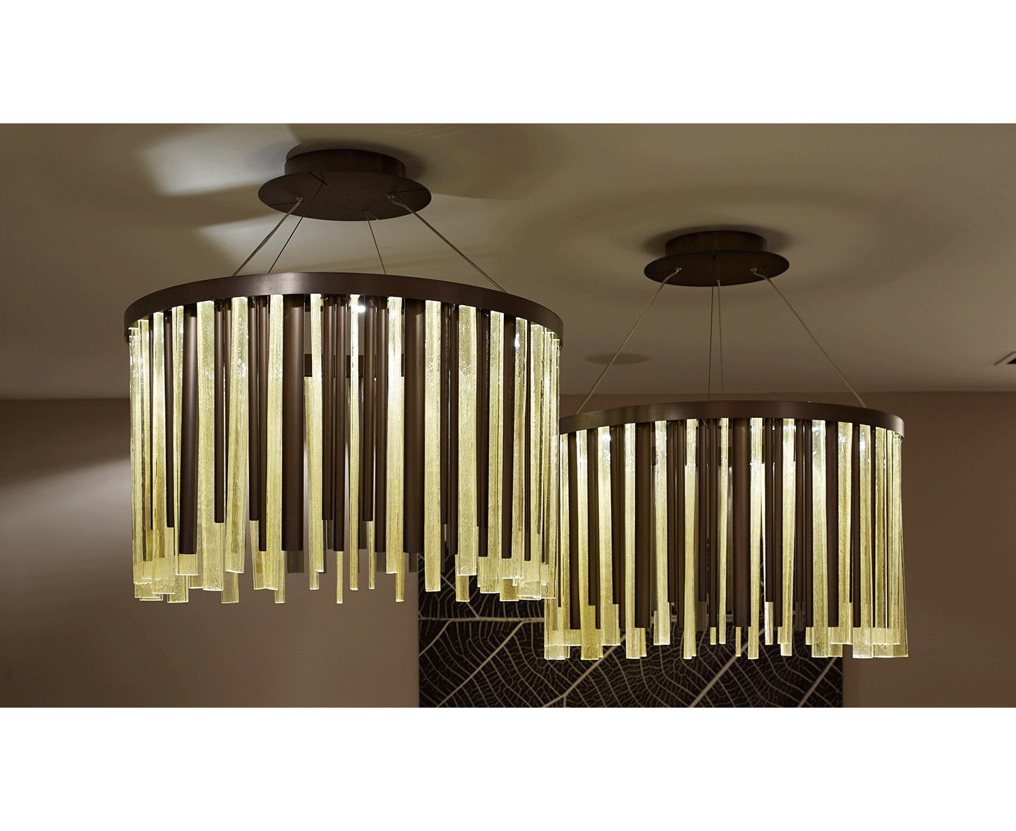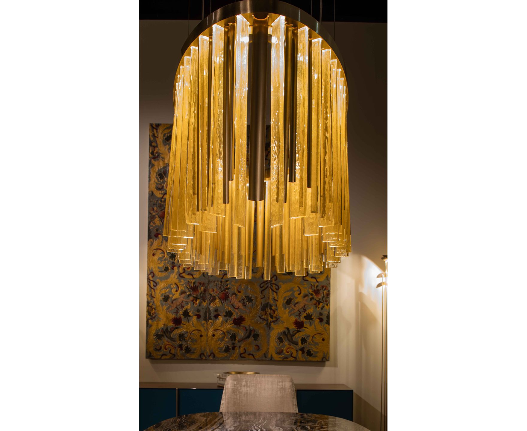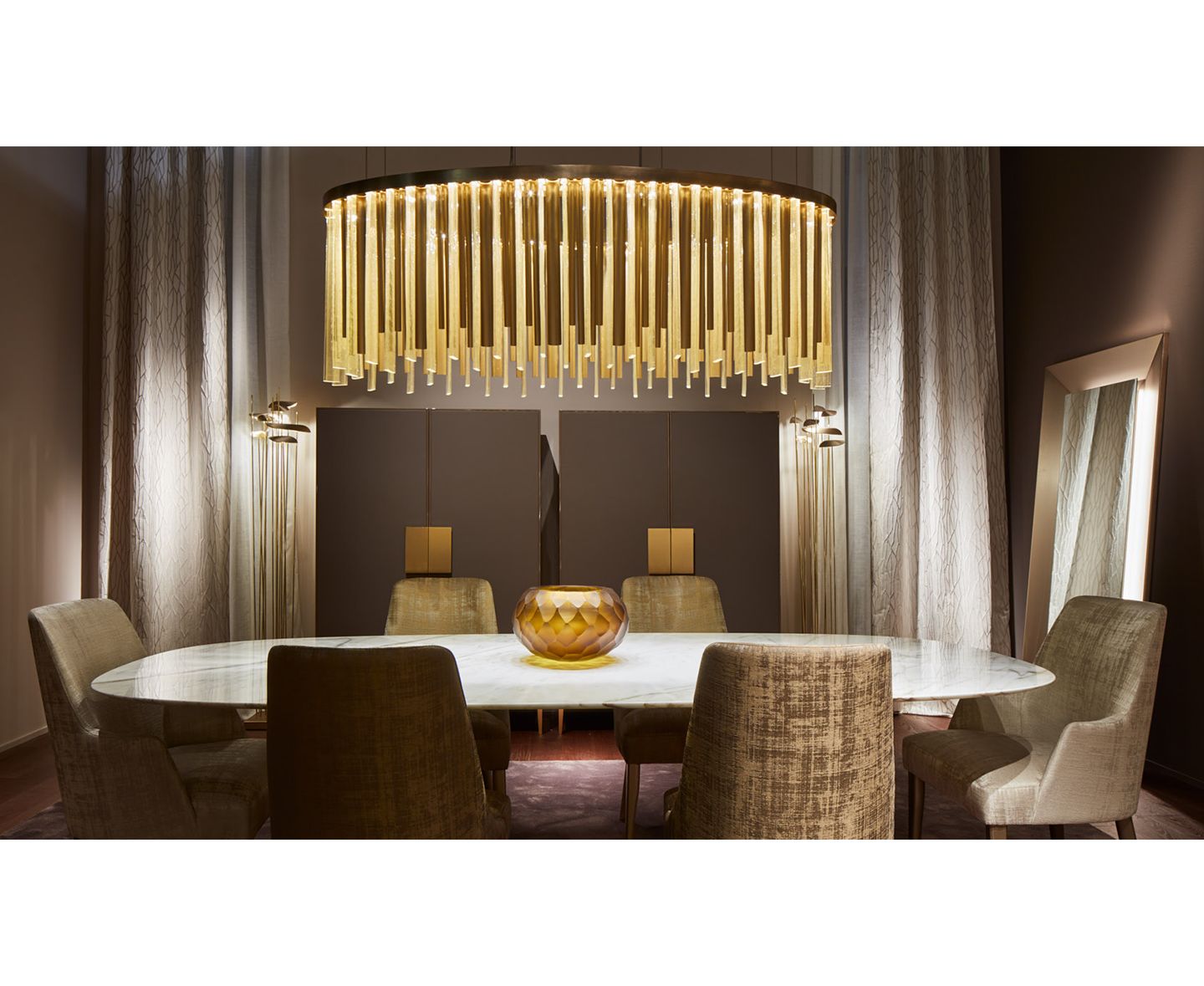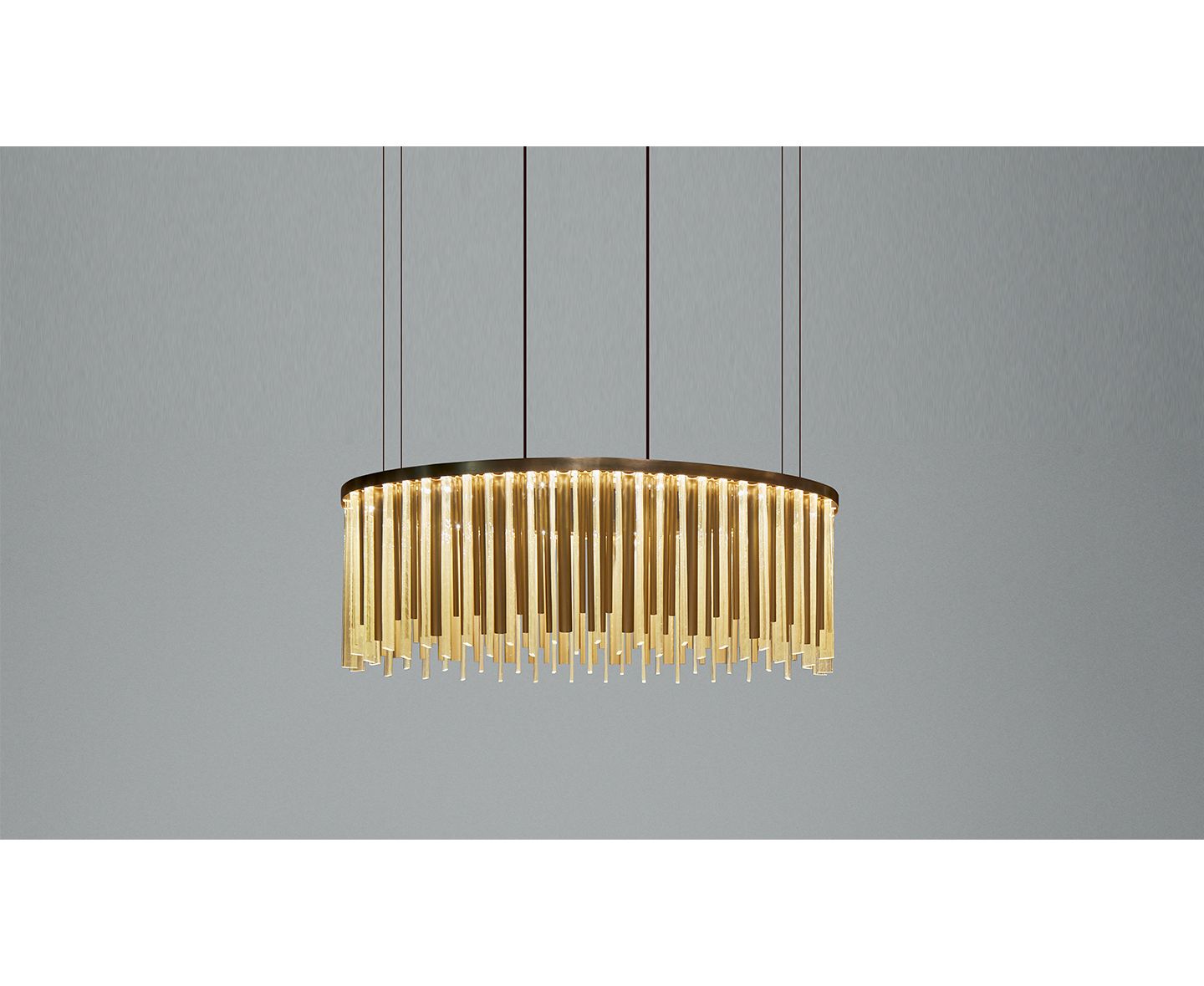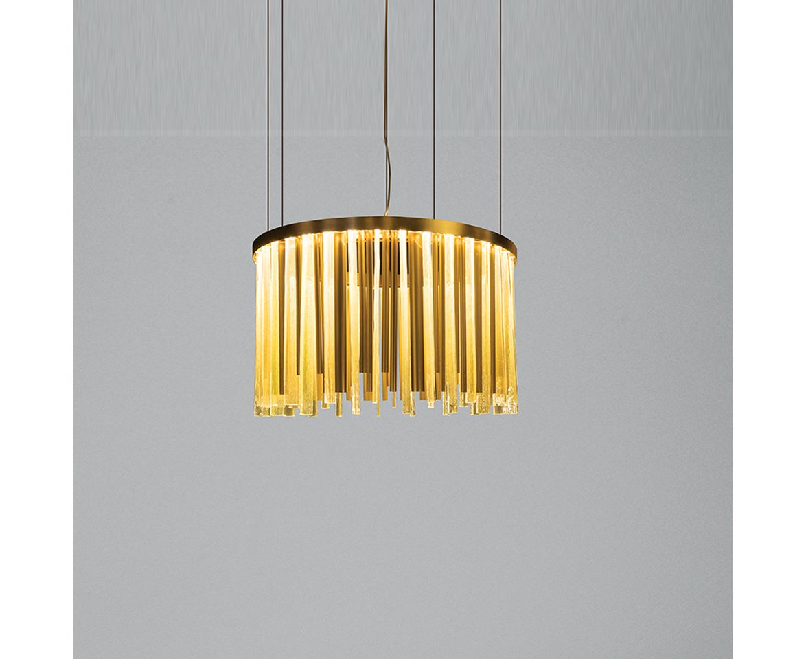 Venus - кинематографический элемент, который делает каждое пространство богатым и утонченным, благодаря своему внушительному производству. Он состоит из богатого букета металлических элементов полукруглого сечения и планок из муранского стекла, в том числе золотых стружек 24 КТ, расположенных на шахматной высоте и собранных в овальную или круглую металлическую полосу, обработанную специальным гальваническим матовым золотом. Доступны 2 версии: круглая и овальная.