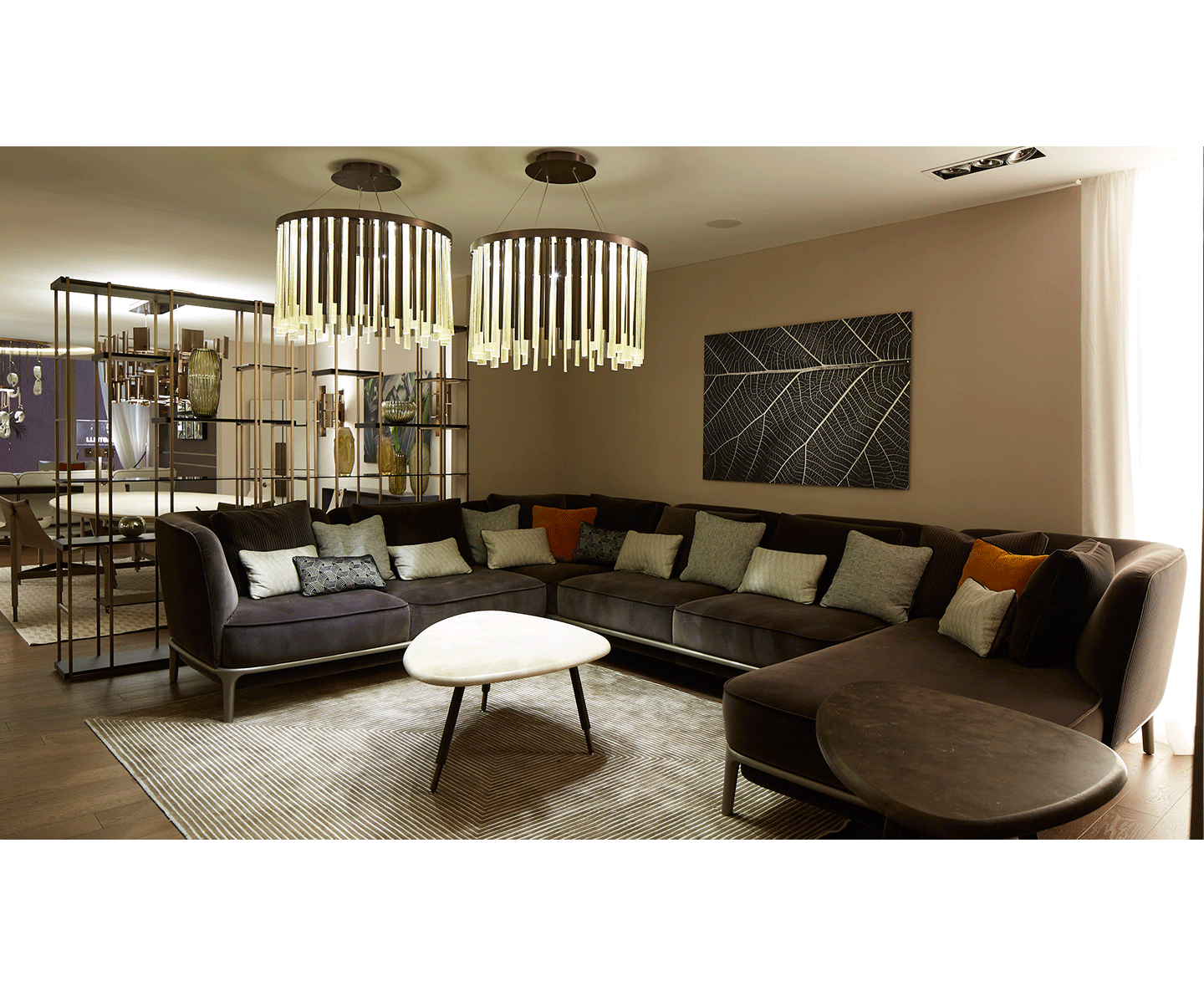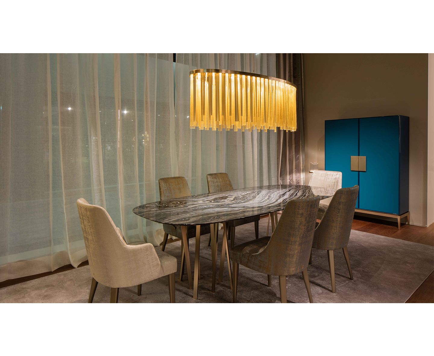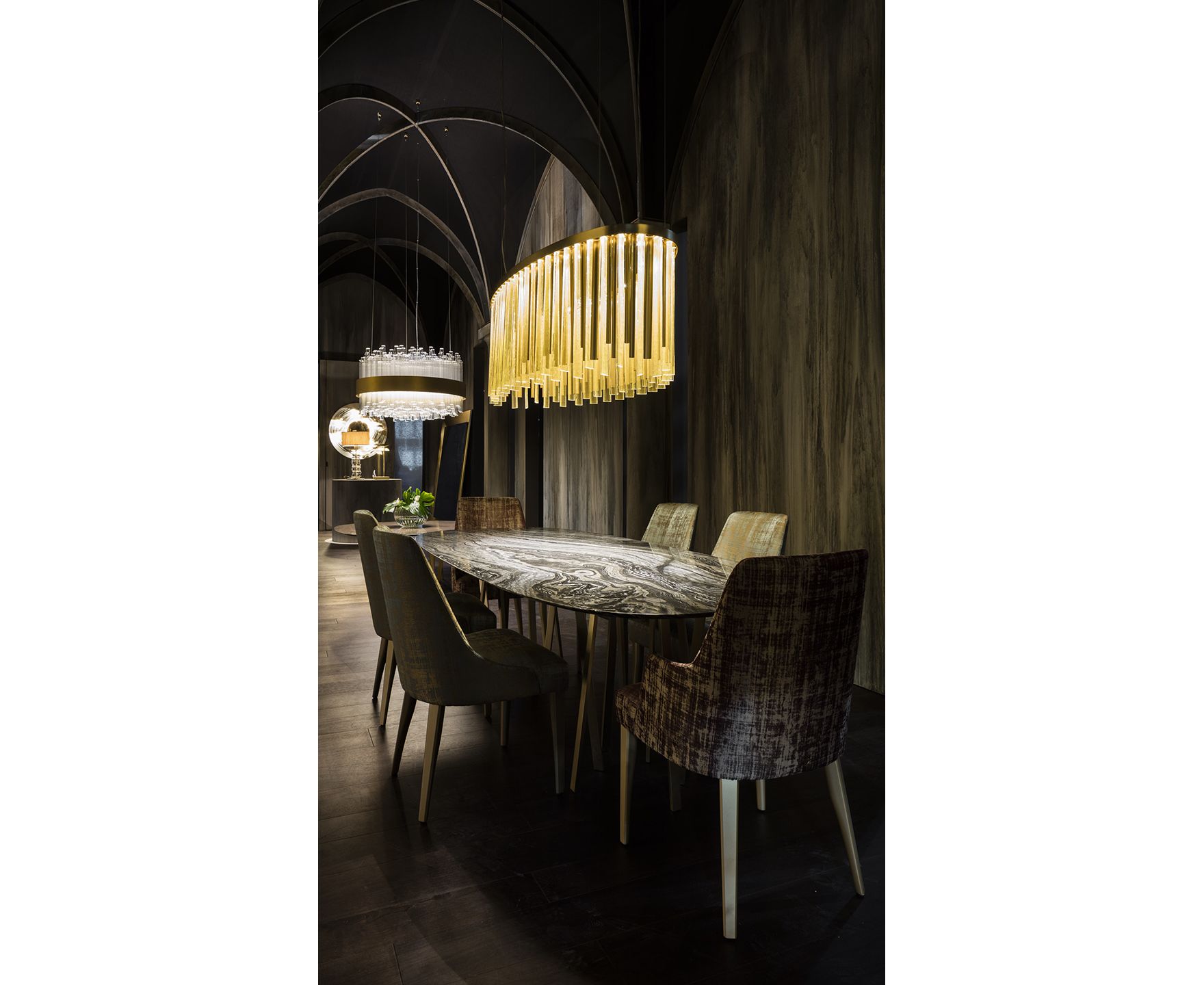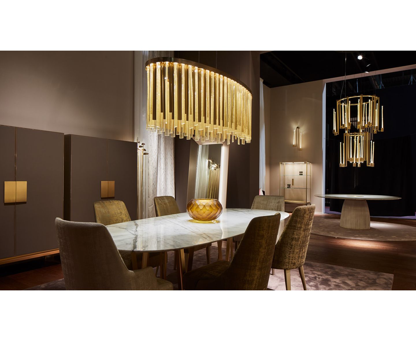 Venus - кинематографический элемент, который делает каждое пространство богатым и утонченным, благодаря своему внушительному производству. Он состоит из богатого букета металлических элементов полукруглого сечения и планок из муранского стекла, в том числе золотых стружек 24 КТ, расположенных на шахматной высоте и собранных в овальную или круглую металлическую полосу, обработанную специальным гальваническим матовым золотом. Доступны 2 версии: круглая и овальная.