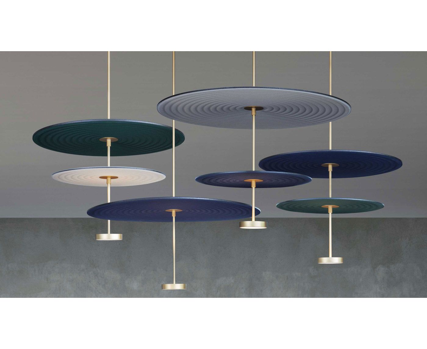 Модульная подвеска с металлической структурой трех размеров доступна в матовых покрытиях: графит, золото и розовое золото. Диски из звукопоглощающей ткани доступны трех диаметров в следующих цветах: бордовый, темно-синий, нефтяной, кирпичный, песочный, светло-серый, темно-зеленый. Диски также доступны как единый декоративный элемент без света.