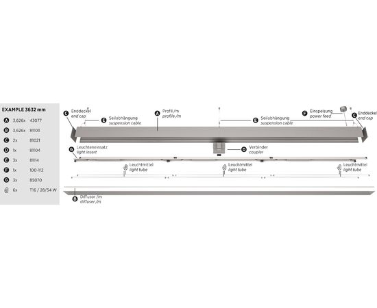 Опаловые рассеиватели, оптимизированные для светодиодов, обеспечивают однородное излучение света без видимых пятен на светодиодах и превращаются в одну непрерывную линию приятного света. Кроме того, микропризма может быть использована для уменьшения бликов и улучшения визуального комфорта. Используются последние поколения Zhaga-совместимых светодиодов. Перекрывающиеся блоки позволяют осуществлять бестеневой переход в соединениях между частями системы. Оснащенные различными светодиодными панелями, можно создавать бесконечные световые линии теплого, холодного или регулируемого белого цвета (по запросу).