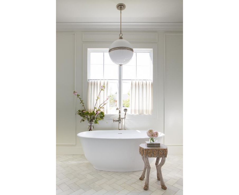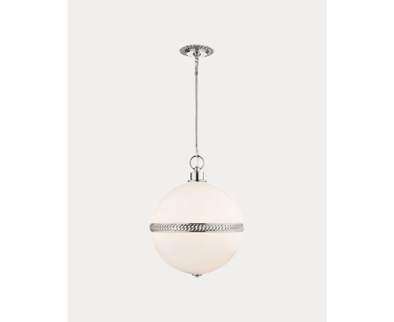 Подвесной светильник Hendricks украшен полированными вставками в виде звеньев цепочки, напоминающими те, что встречаются в украшениях Ralph Lauren. Он снабжен белым стеклянным колпаком для мягкого рассеивания света по всей комнате.