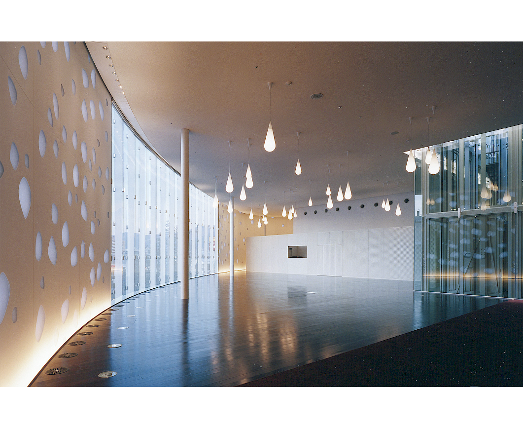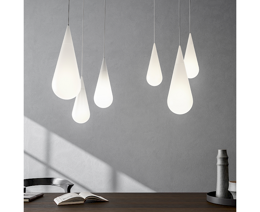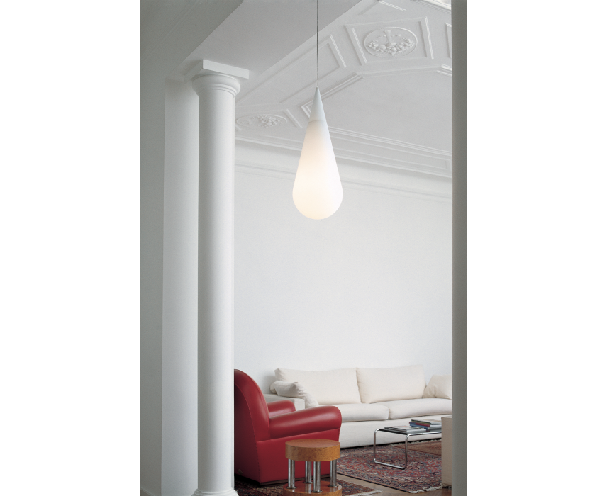 Его форма напоминает каплю жидкости или подвеску с драгоценными камнями, образованную двумя соседними стеклянными элементами, демонстрирующими неизменно элегантный и компактный знак. Конусообразная верхняя часть имеет зеркальное отражение в верхней части потолочной розы.