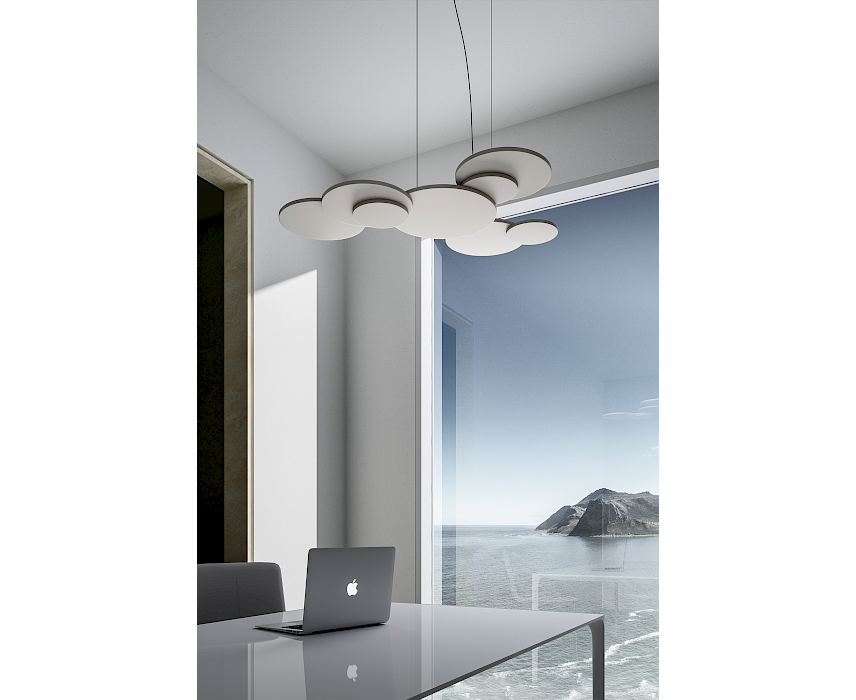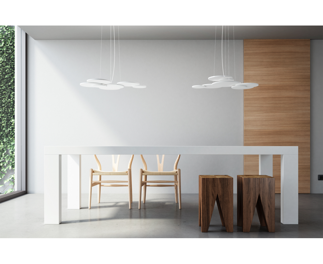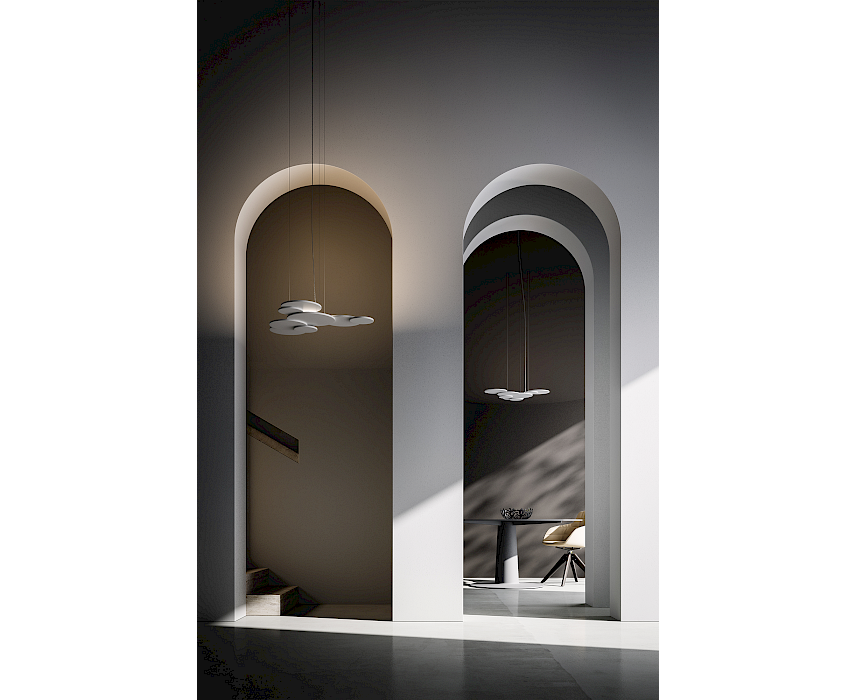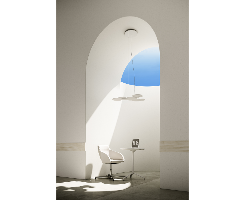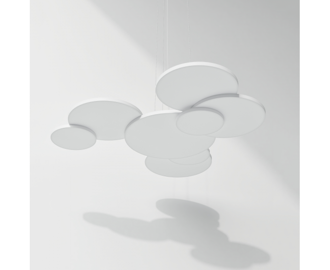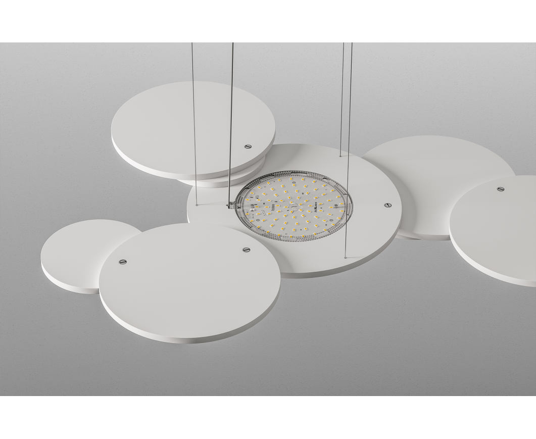 Эффект суспензии создается перекрытием круглых элементов. Полностью изготовлен из алюминия и легких панелей средней плотности. Центральный диск поддерживает светодиодные источники и внешние диски, которые расположены на разных уровнях, создавая ненавязчивую, но впечатляющую геометрию.