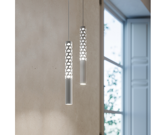 Вдохновленный «Неоновой структурой» Лусио Фонтана для 9-й Триеннале Милана, Squiggle - это подвесной трубчатый экзоскелет, который скрывает светодиодную ленту длиной до 6 м. Последовательность неправильных шестиугольных отверстий осветляет металлическую структуру, которая генерирует различные геометрические формы: ломаные изогнутые линии, символ бесконечности, концентрические кольца различных размеров.