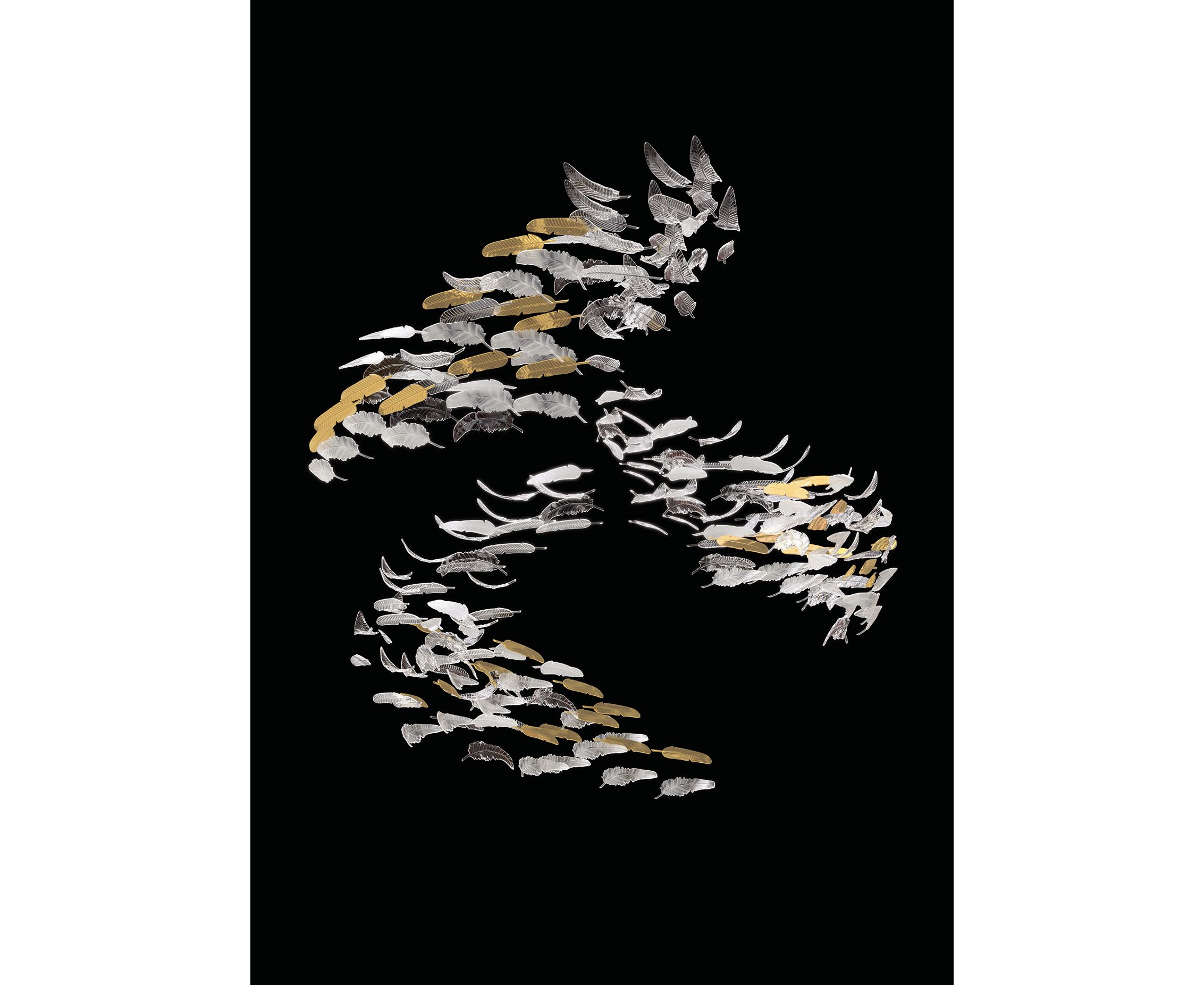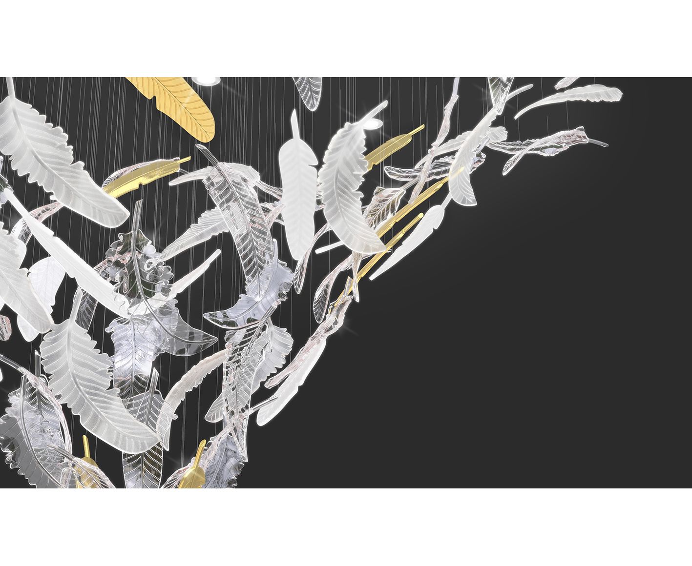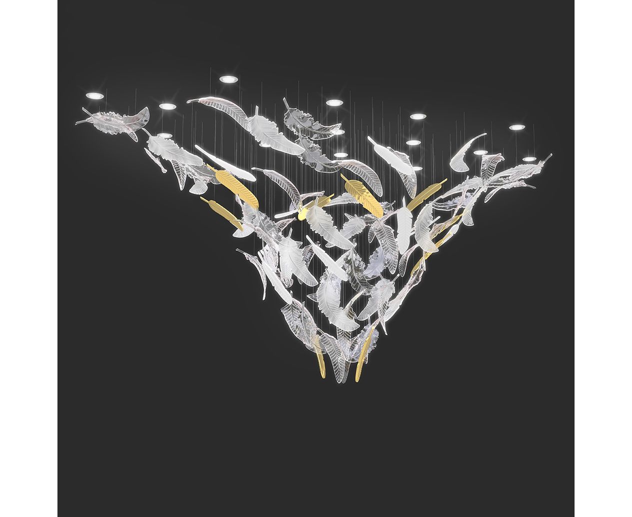 Эта световая инсталляция, составленная из 330 выдутых вручную кусочков в форме перьев, отдает дань свободе полета птиц. Подражая своей грациозности и ловкости, композиция передает ощущение аккуратного и легкого движения. Различные стеклянные компоненты кристально чисты, полностью или частично подвергнуты пескоструйной обработке и имеют нано-покрытие.