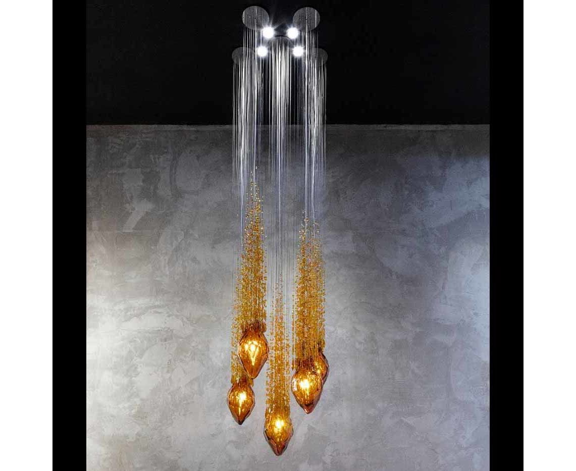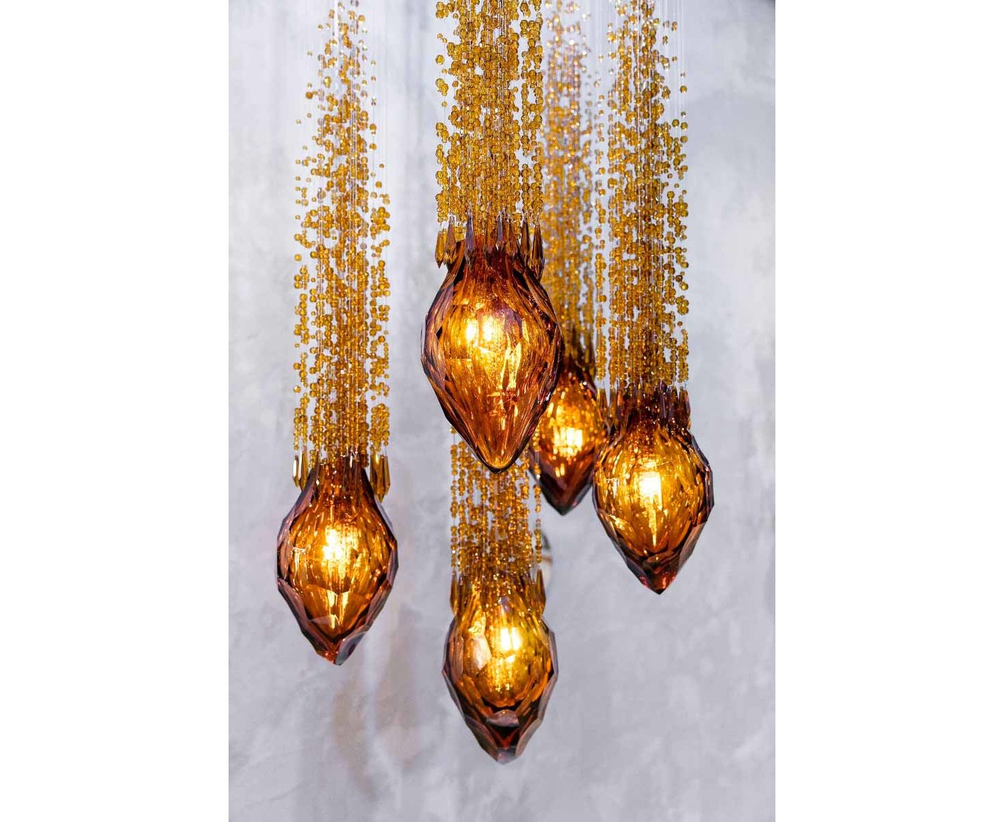 Метеоритная подвеска Flash от Sans Souci - современный светильник, впервые представленный на выставке Euroluce и Conex 2017. Одиночные подвески из ручного и выдувного стекла выглядят впечатляюще на занавеске вырезанных бусин.