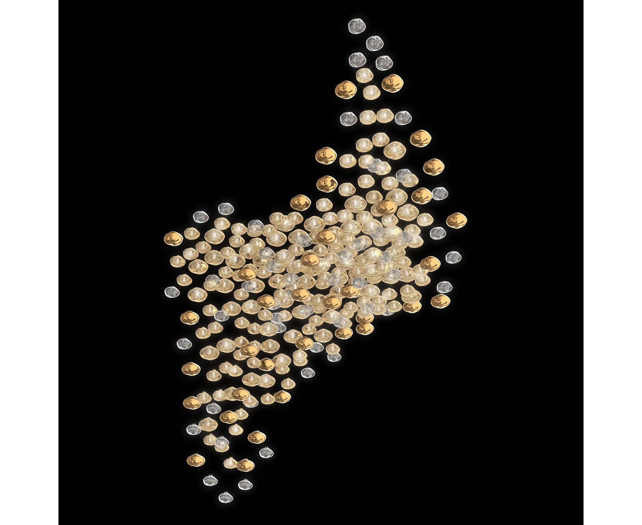 Вызвав солнечные лучи, сверкающие на песчаных дюнах, это создание освещения сливает прозрачное стекло с эффектом золотой слюды, посеребренными янтарными компонентами и кусочками кристаллов соды, а также полупрозрачным золотым нано-покрытием. Эта блестящая композиция усиливается нежно ярким и сияющим динамическим эффектом - различные компоненты случайным образом загораются и вспыхивают.