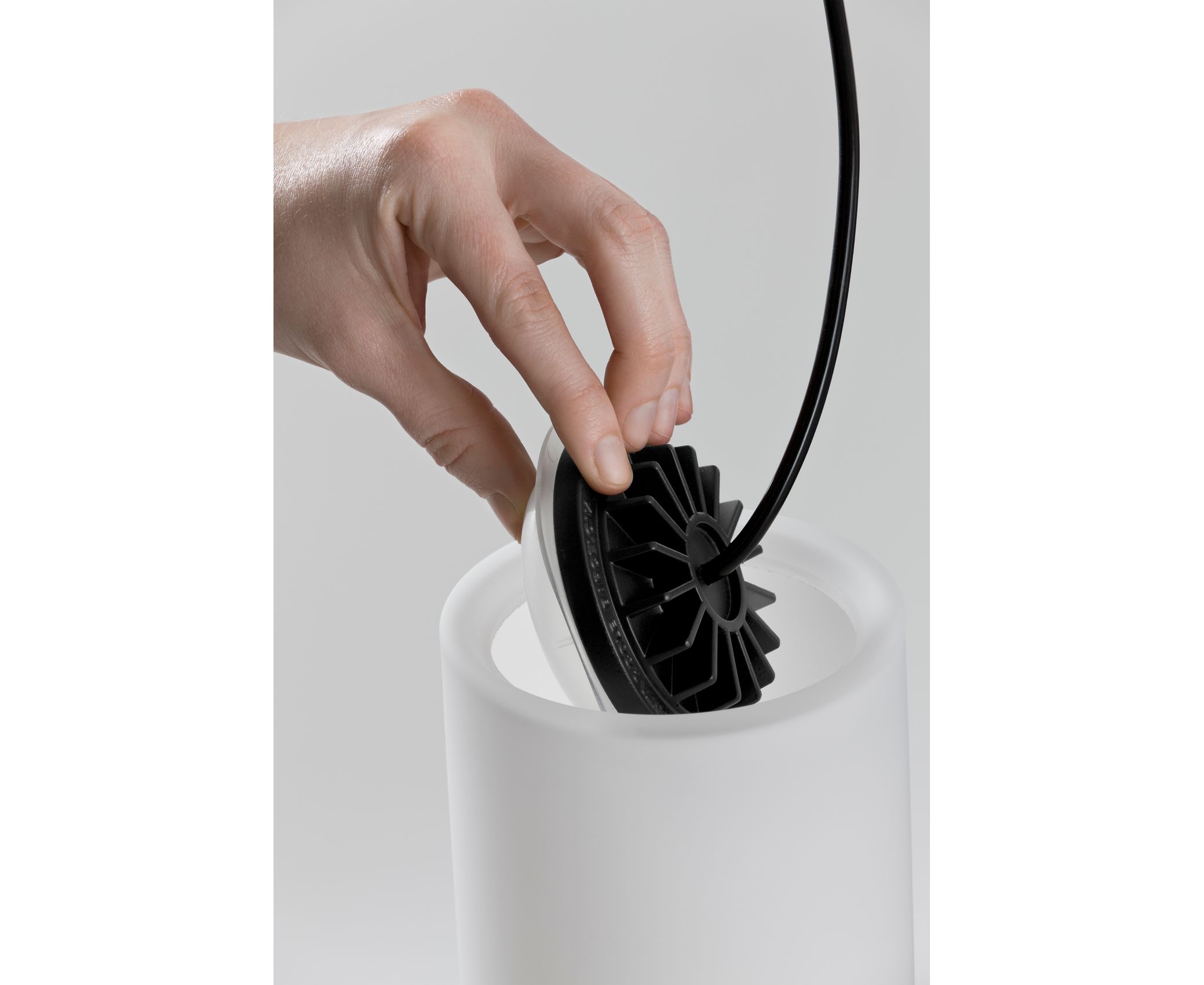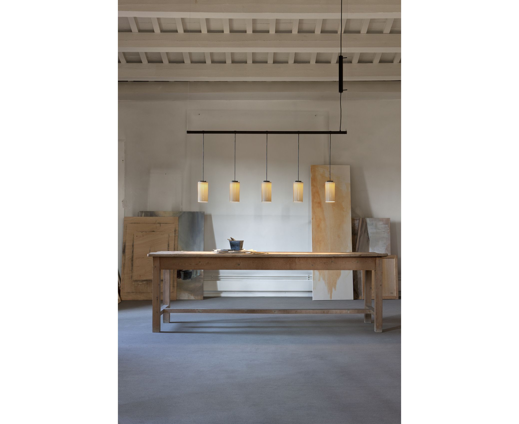Капсула со светодиодным источником света свисает с простой розетки. Три различных оттенка варьируются от фарфора ручной работы из Саргаделоса (Галисия, Испания), подходящего для самых восхитительных источников света, до полупрозрачного опалового стекла для более сильного и экономичного освещения и непрозрачной элегантности латуни для точечного освещения.