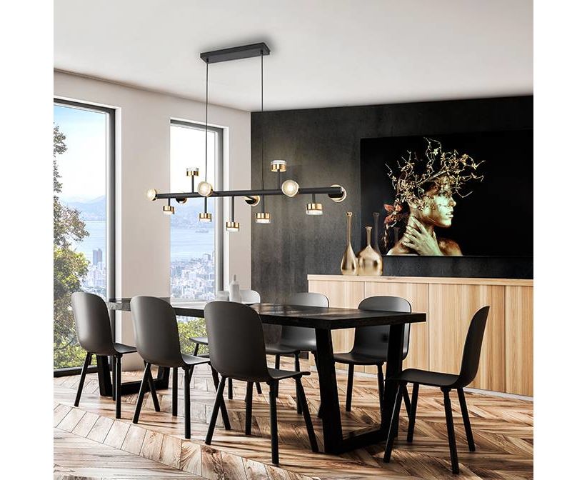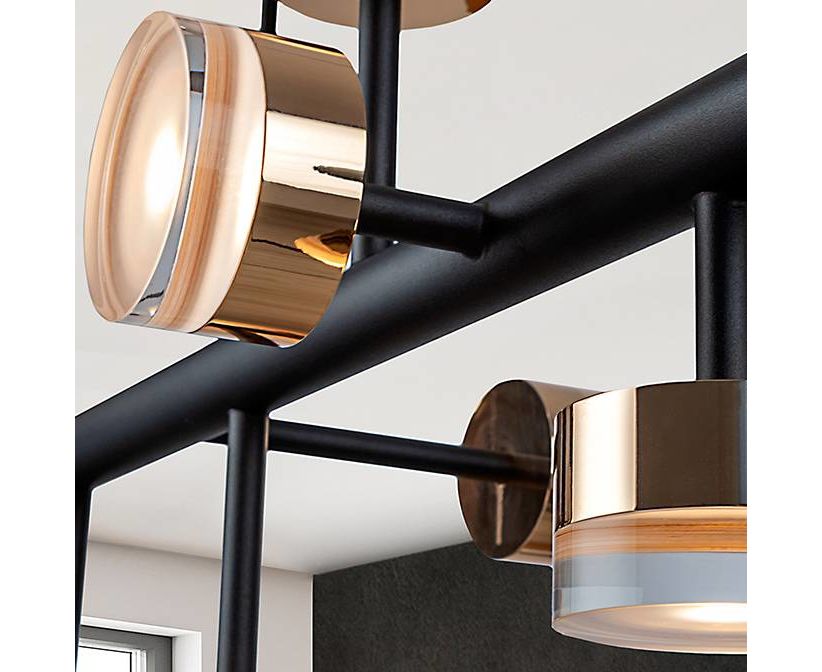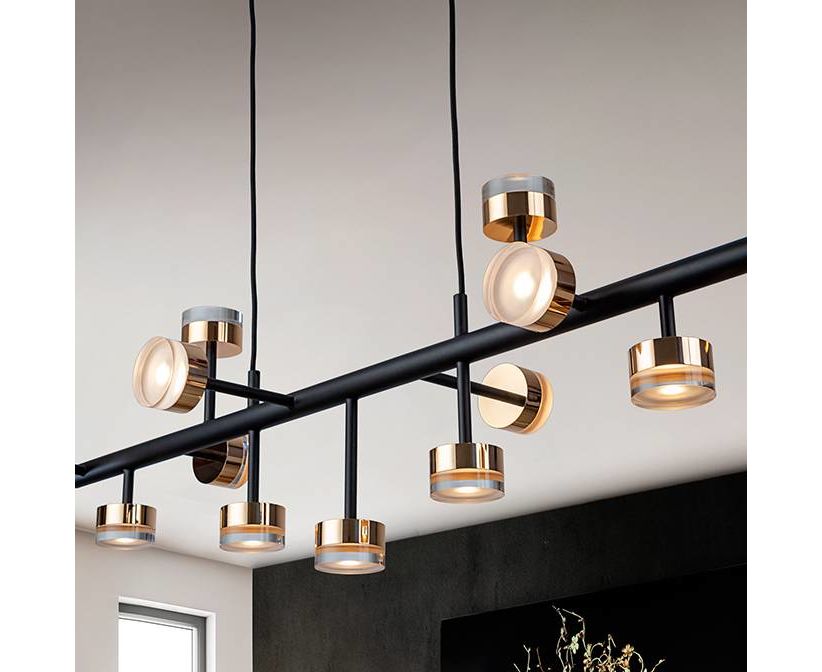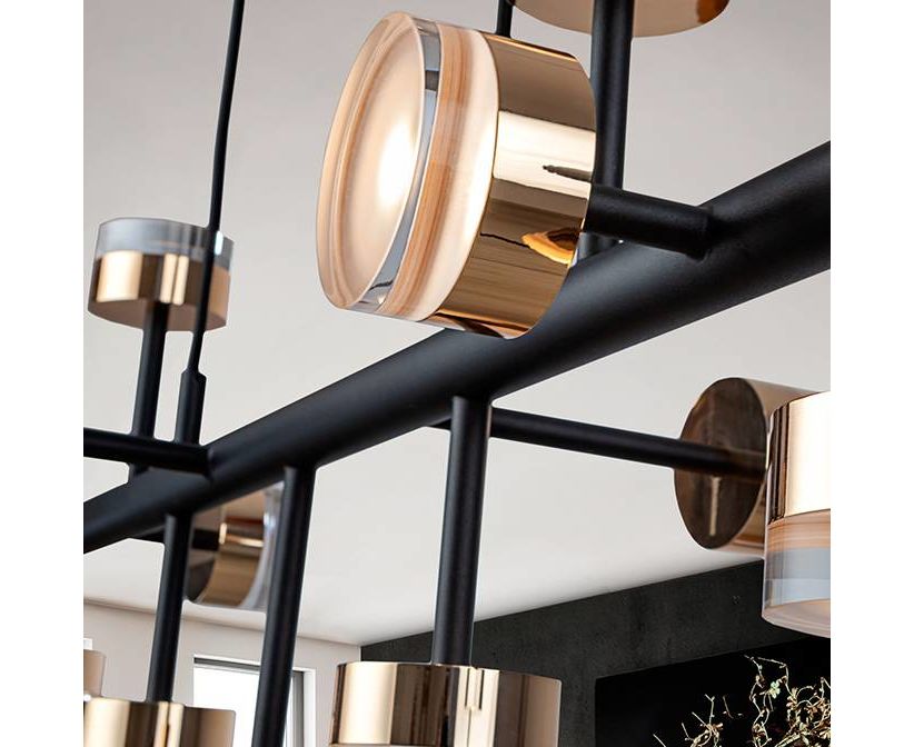 Подвесной светильник LED из металла с матовым чёрным покрытием. Цилиндрические плафоны с основанием из золотистого металла и с прозрачным акриловым рассеивателем